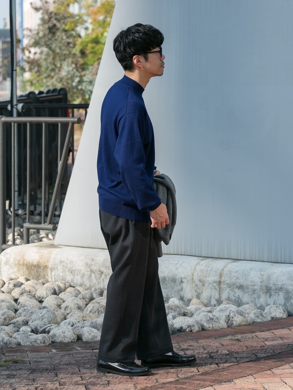 スウェットのような表面感のニットは綿カシミヤ素材でチクチクせず、もちもちで暖かいオススメニットです。