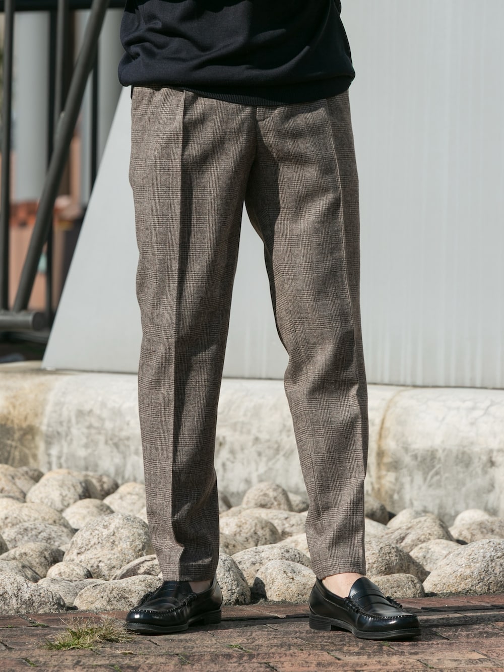 上半身はネイビーとグレーで落ち着いた印象にして、パンツはチェックパンツで差し色にしました。