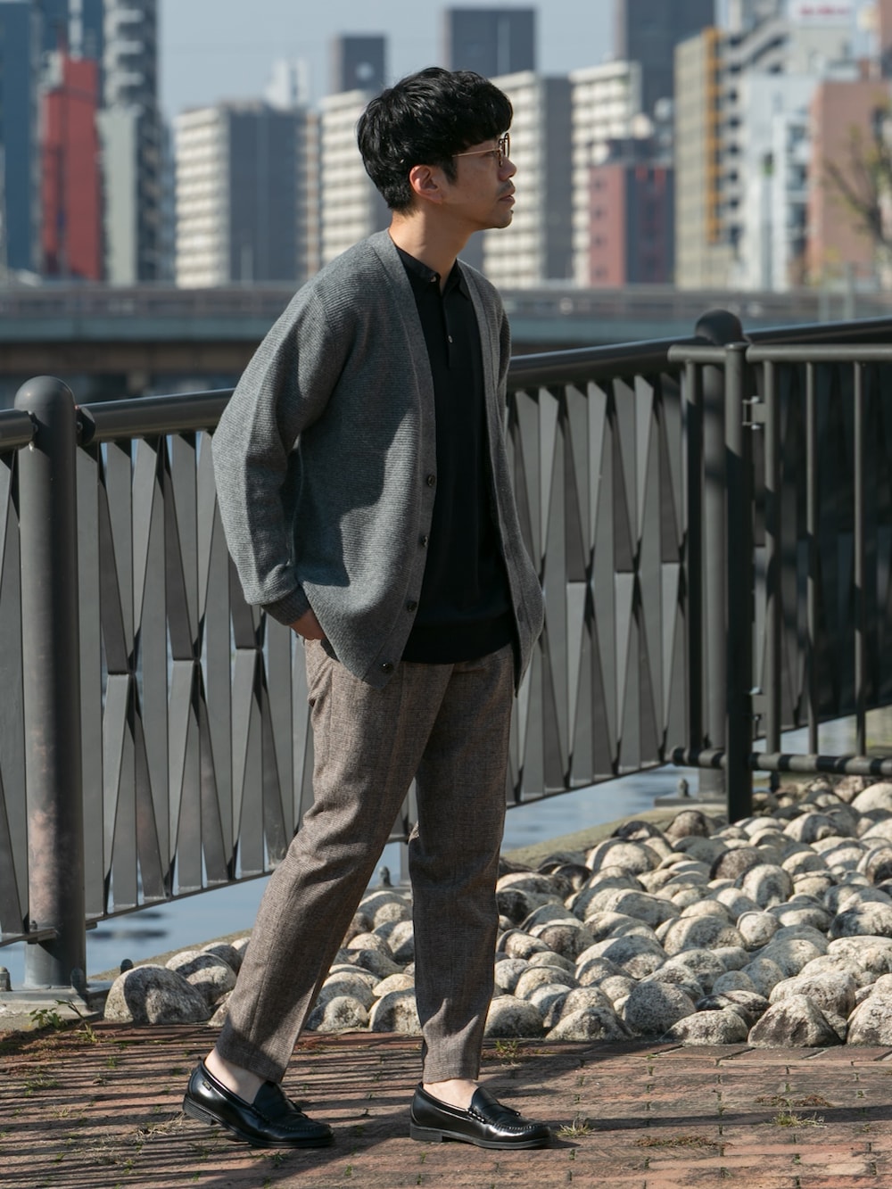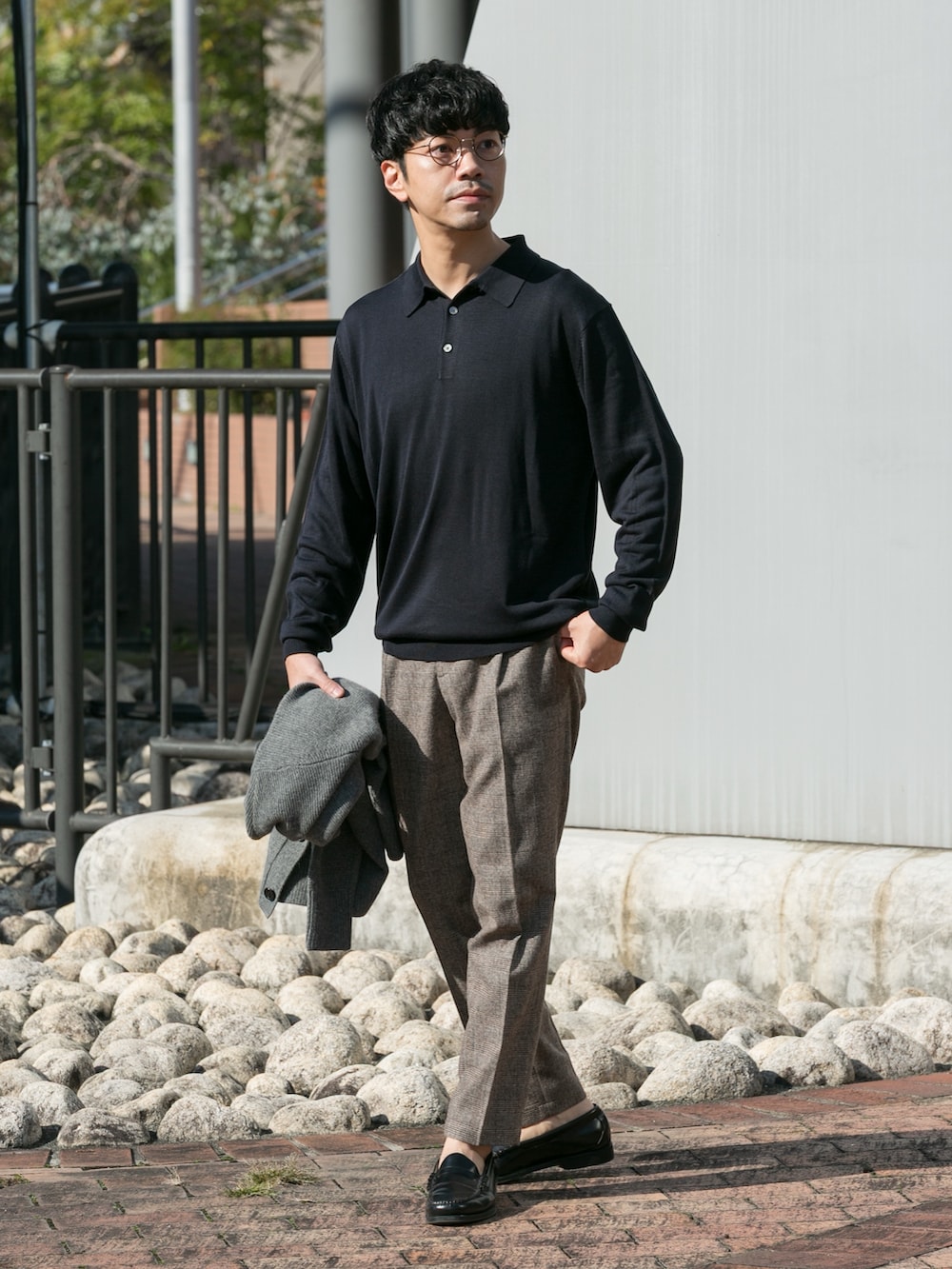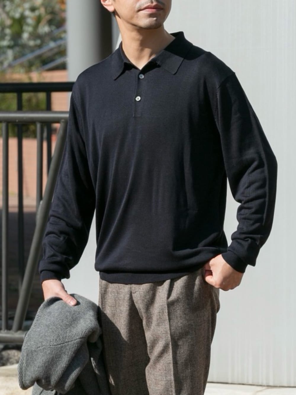ニットポロは薄くて起毛感も少なく良い意味でニット感もなく今回のようにカーディガンと合わせてもまとまります。