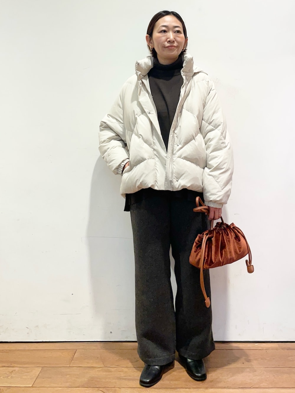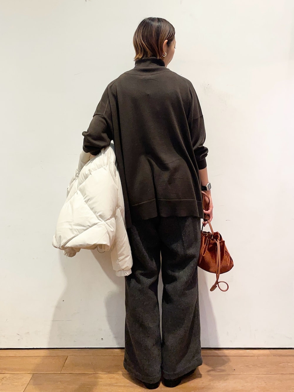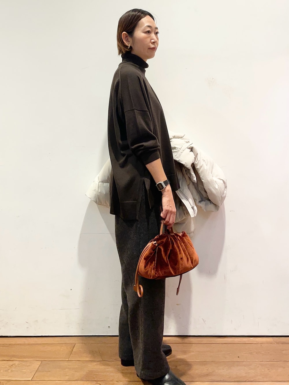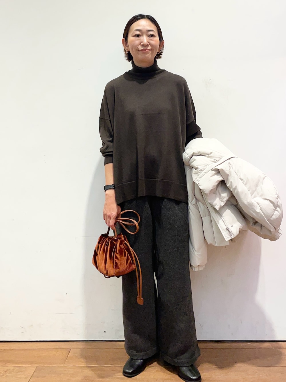 中に着たタートルネックのニットは薄手ですがウール100%であたたかいです😌
