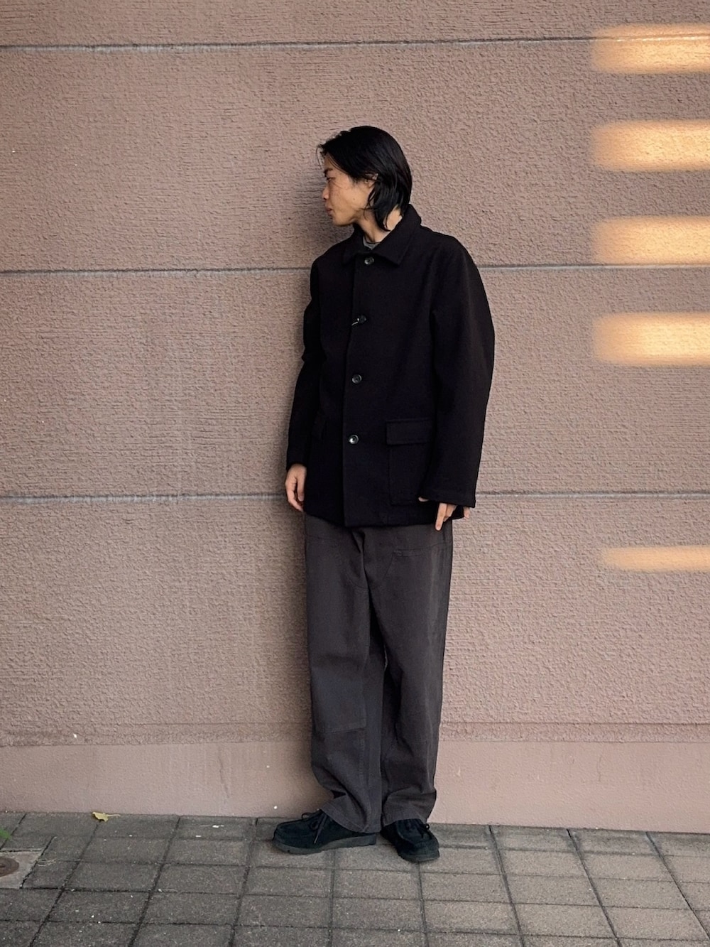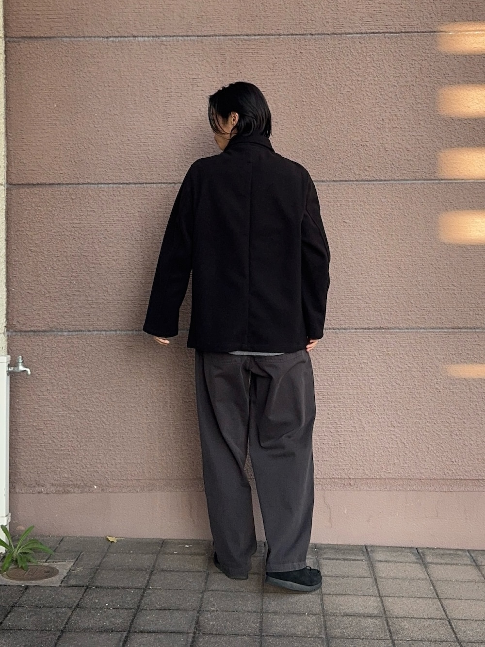 コートは腕周りなどがしんどくなりがちですが、このコートはストレッチ性があるので、楽で快適に着ていただけます!パンツは太めのシルエットでカッコよく履けていただけます!