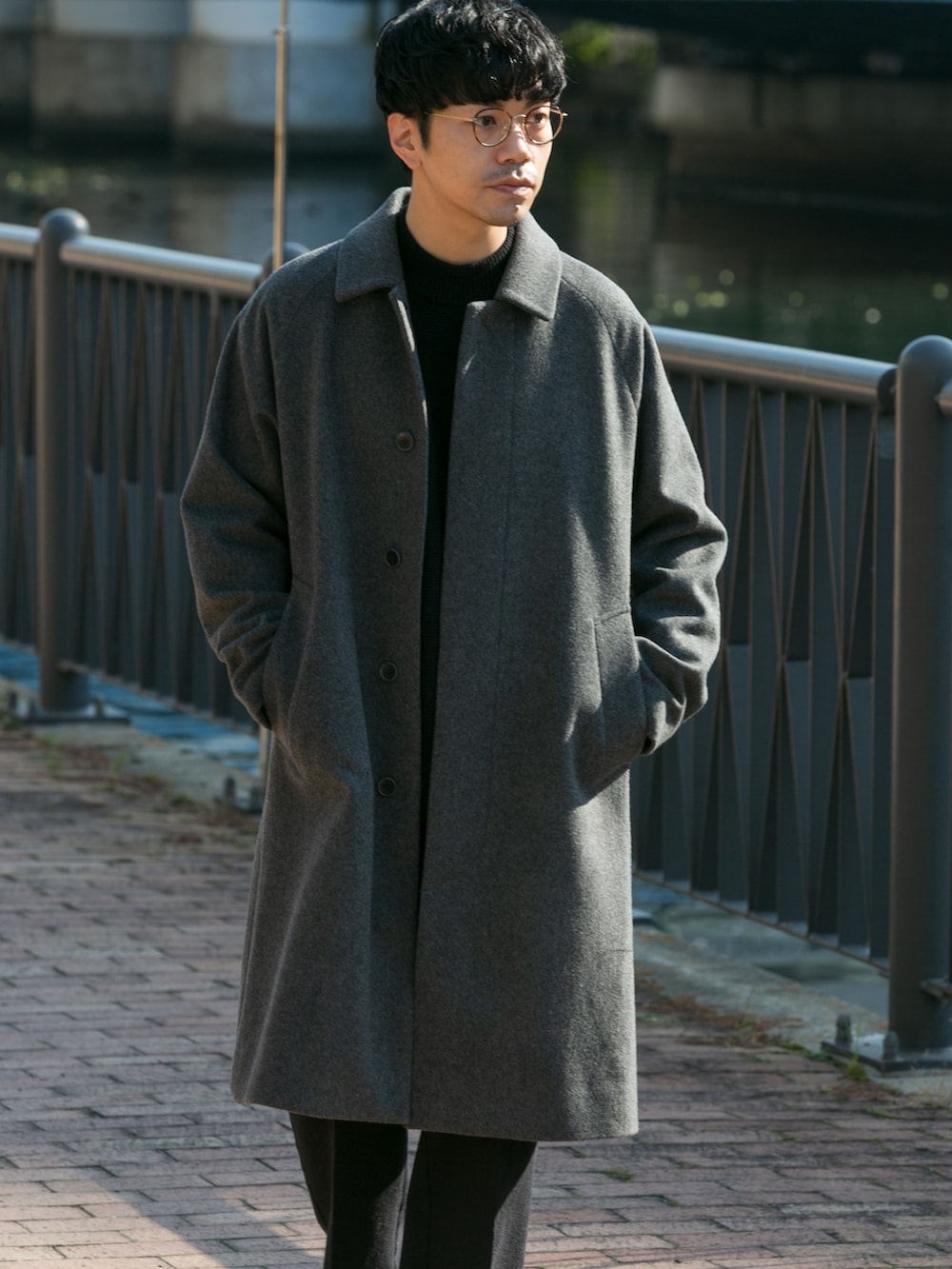 スーパー100の上質素材コートに少し高めのモックネックニットを合わせて上品な印象にしました。