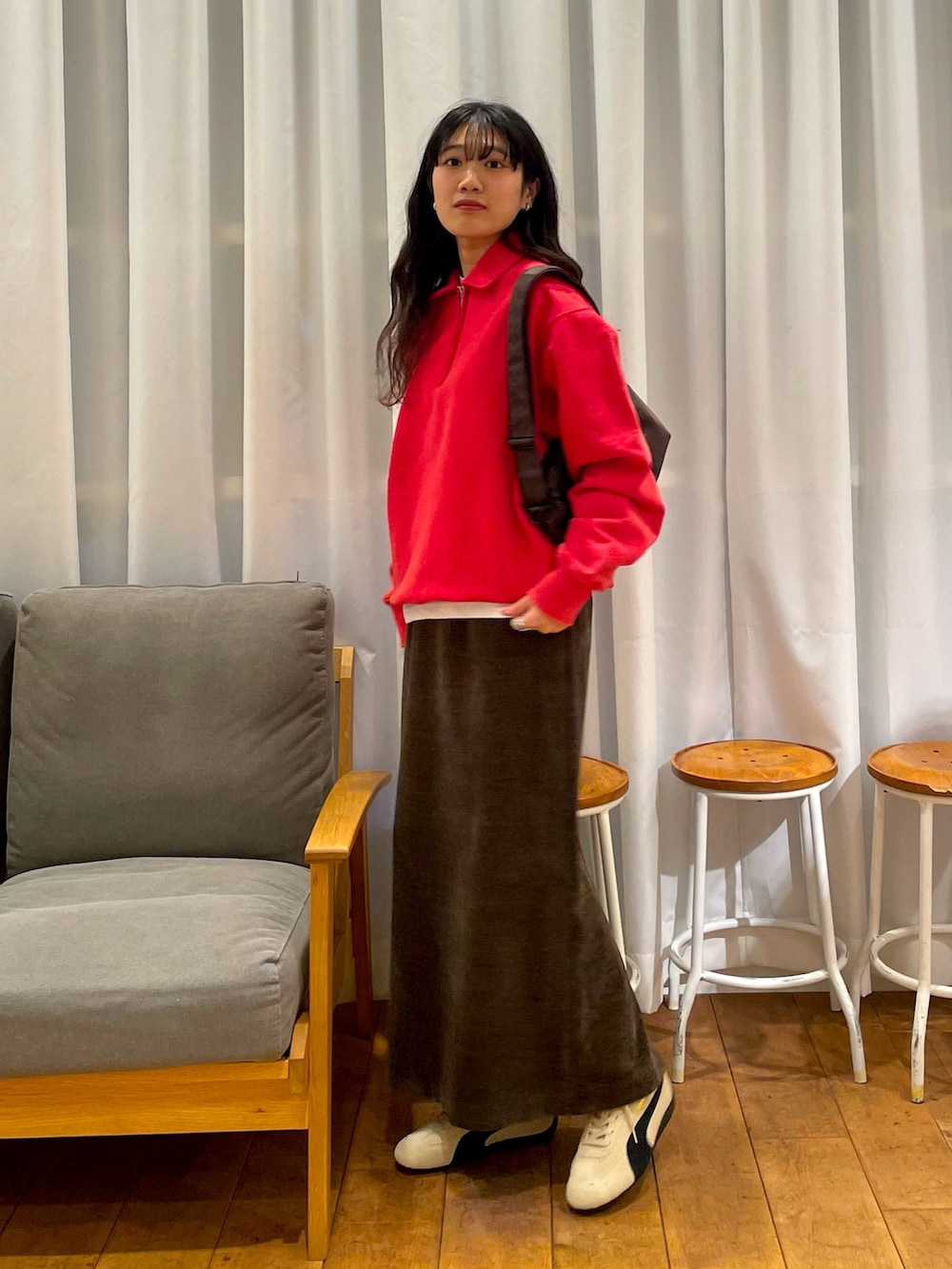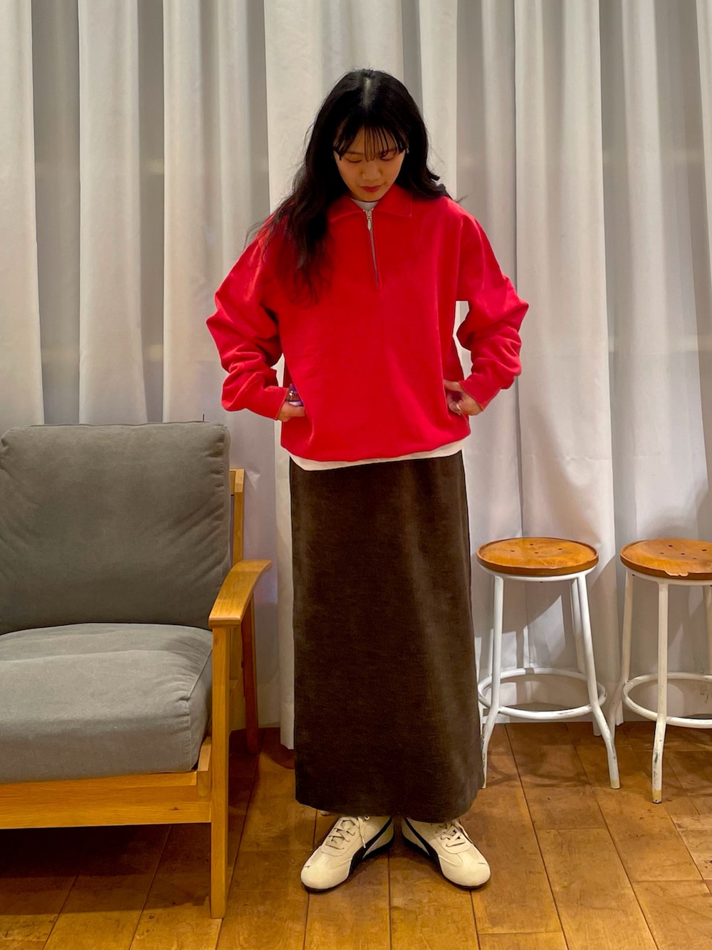 ムラ染め加減が可愛い赤のハーフジップスウェットを主役にコーデを組みました!
