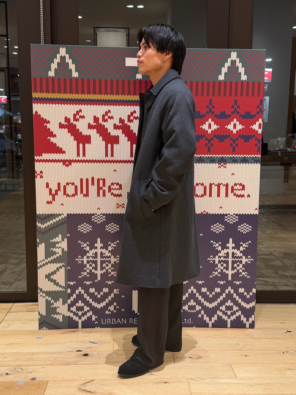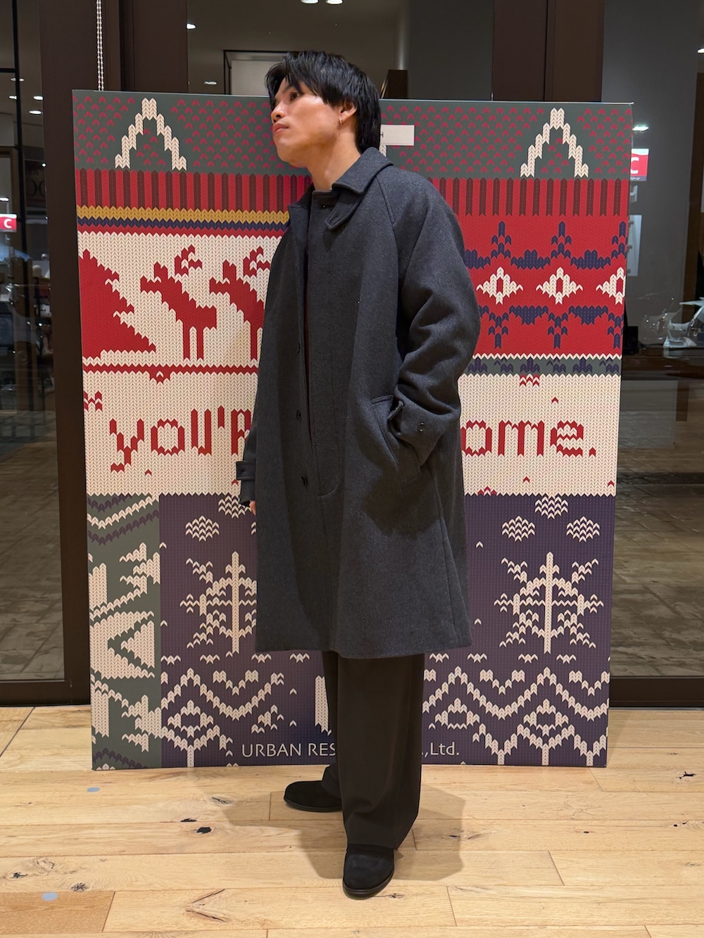 コートをグレーにするだけで重くなりすぎないコーデに。