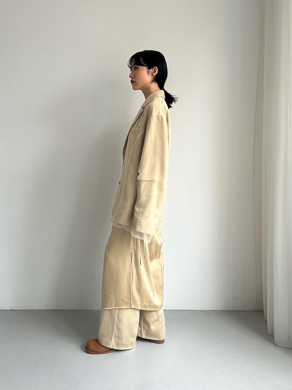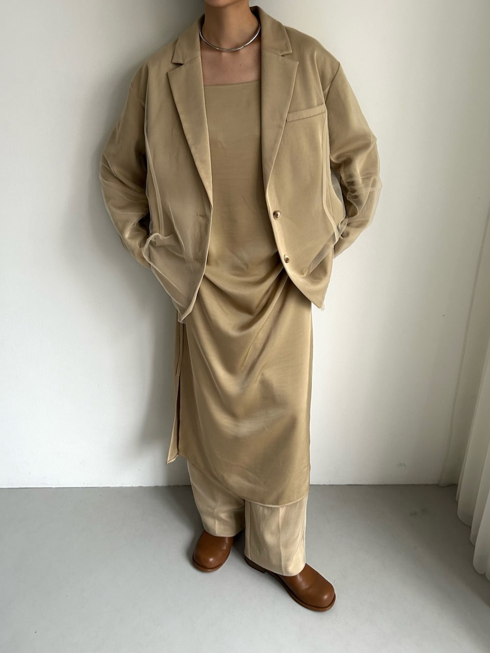 サテンチュールのジャケット、パンツに、キャミワンピースを合わせて着てみました。