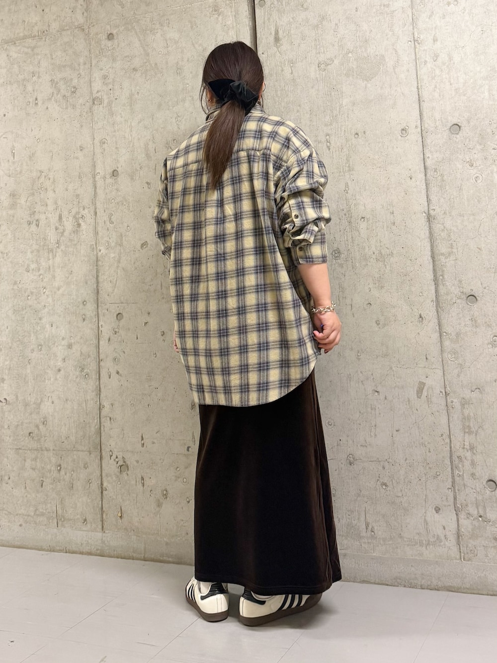 チェックシャツはお尻まで隠れる丈感なので体型カバー出来て◎