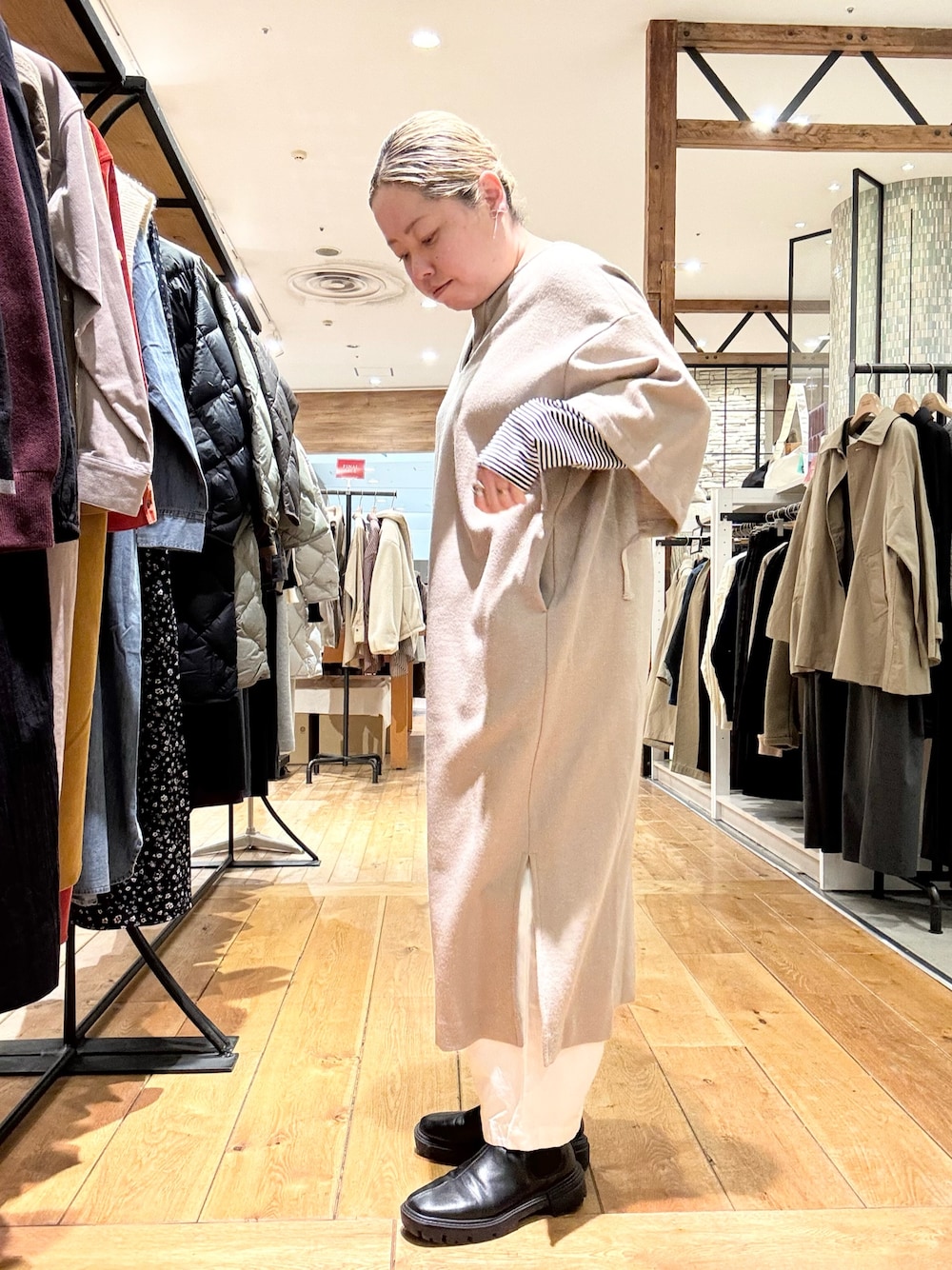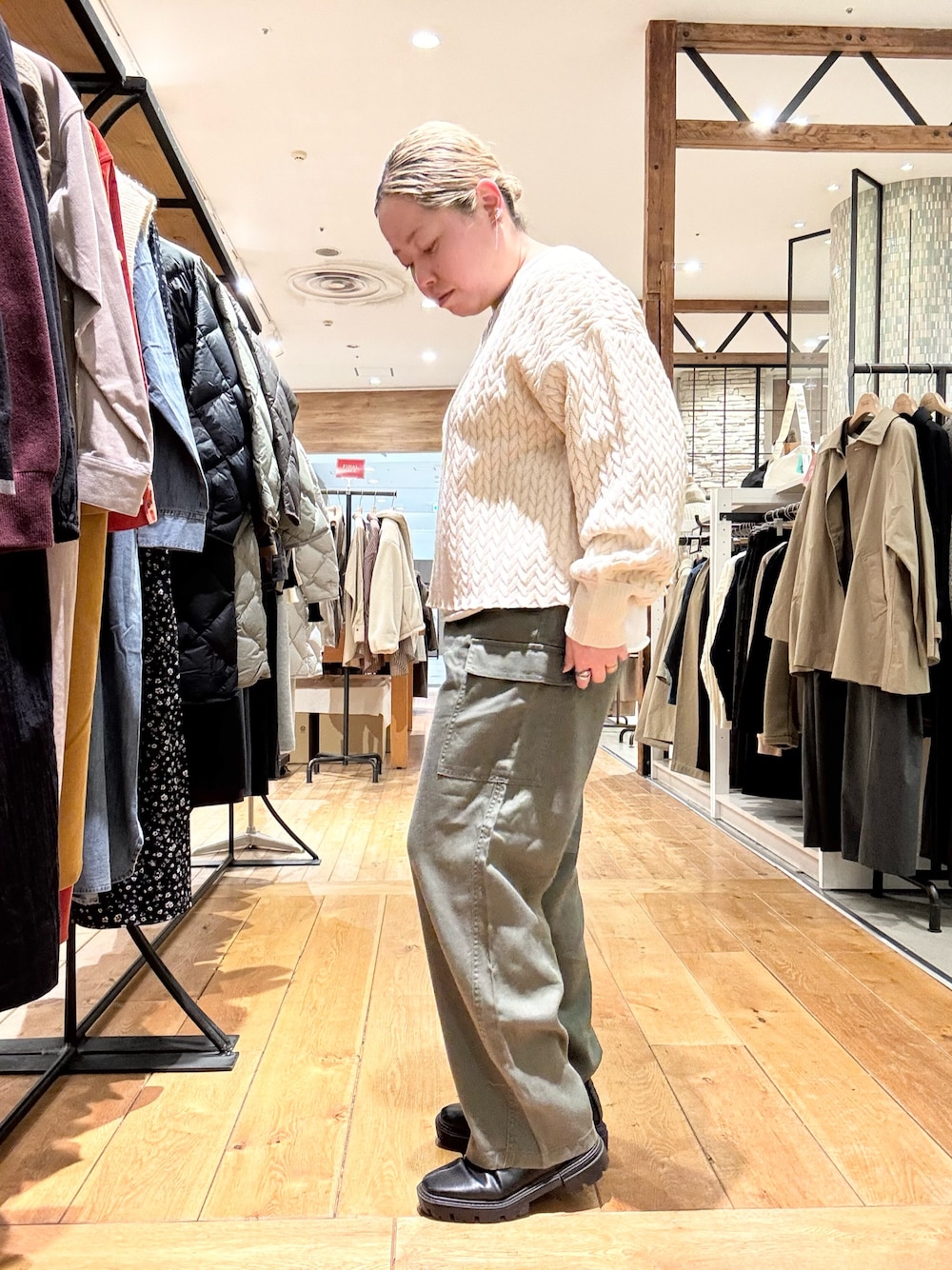 大人気なブラッシュドパンツをあわせて