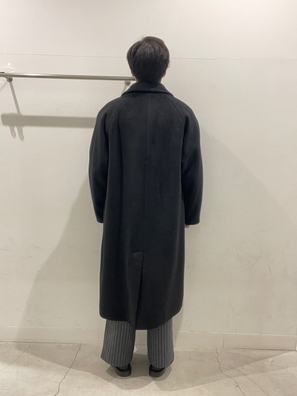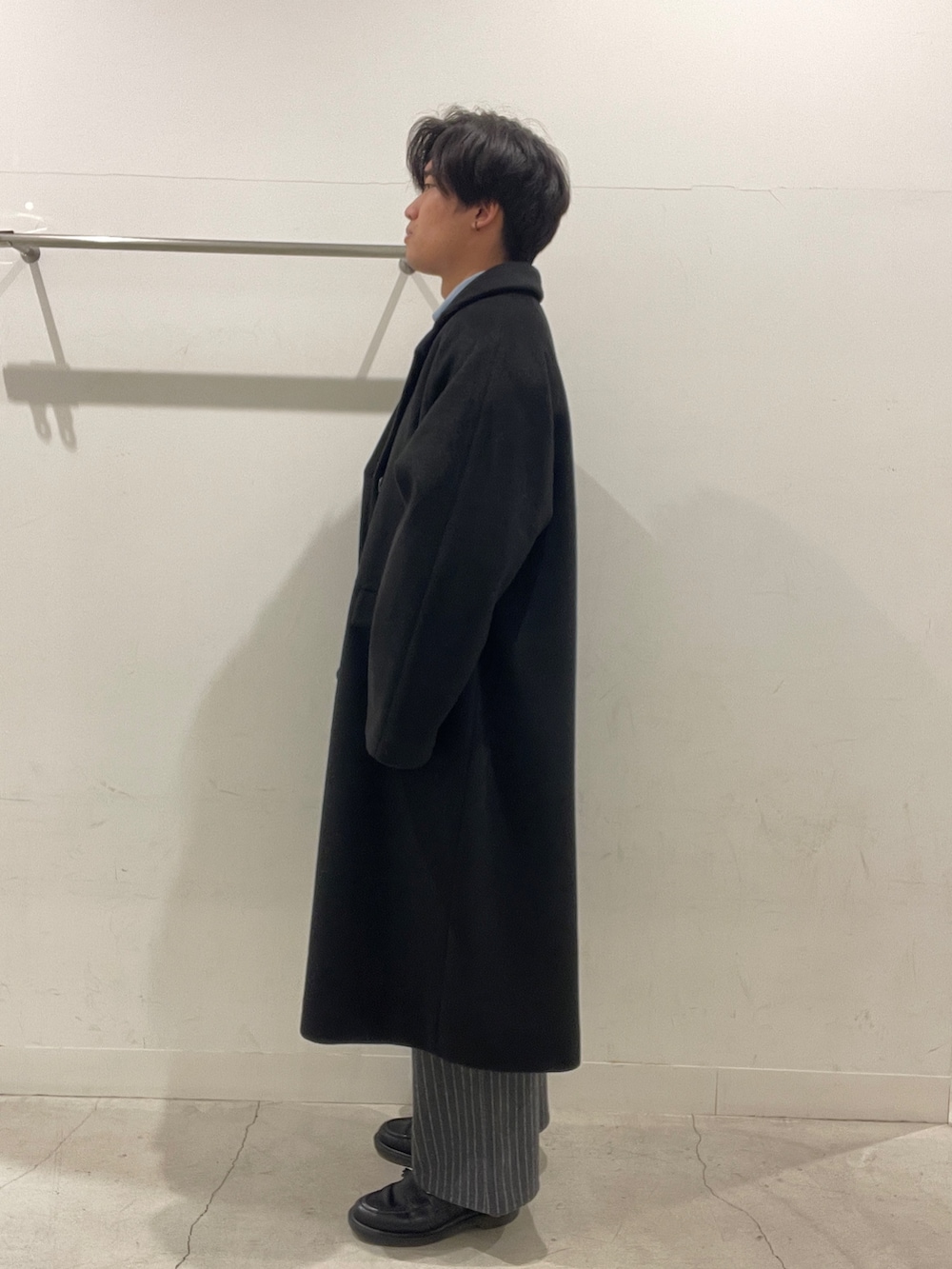 黒のダブルロングコートを主役に、グレースウェットと水色シャツでレイヤード!🟦