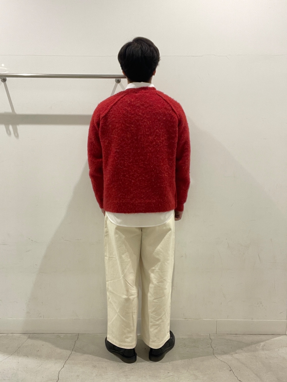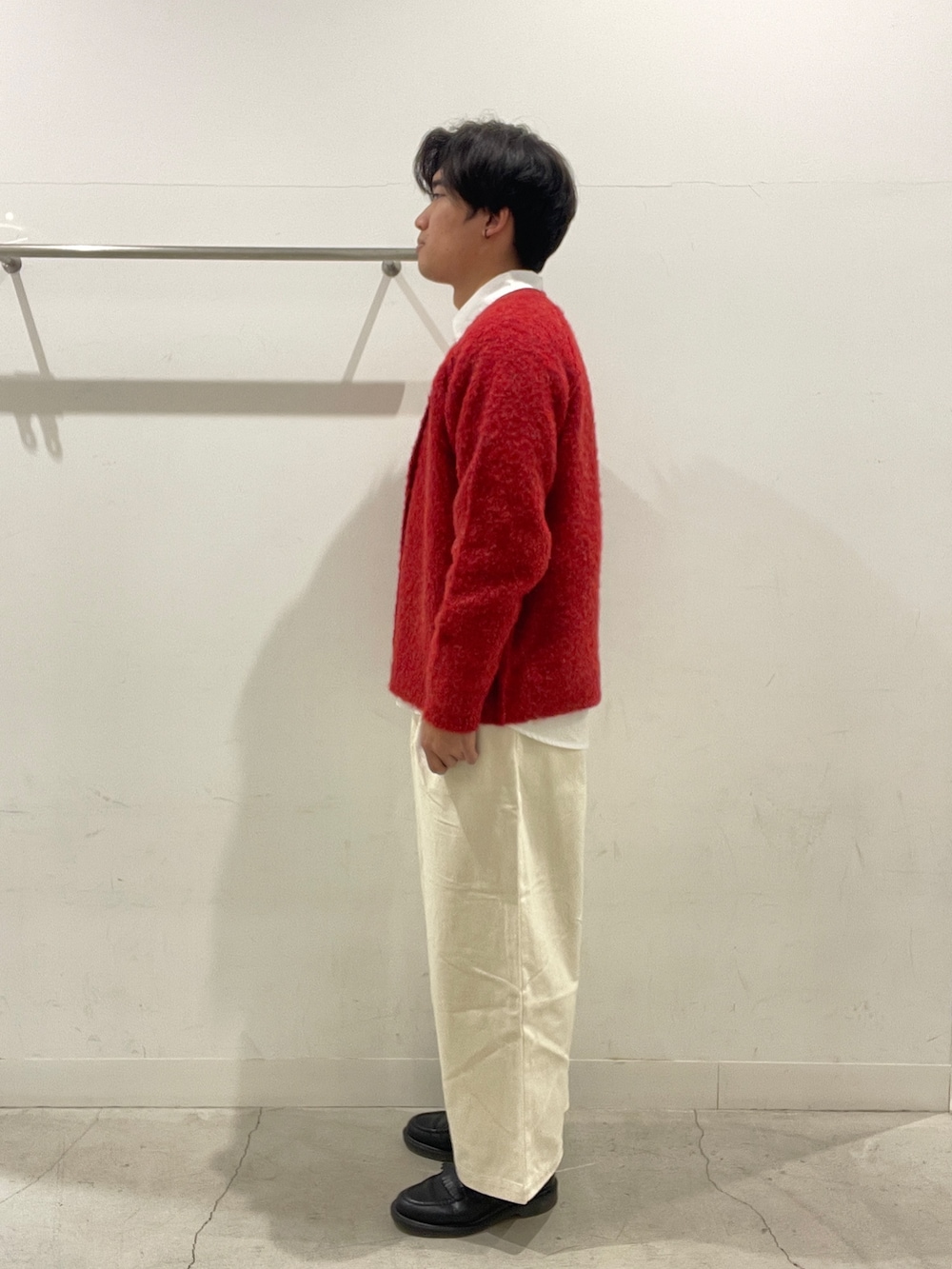 赤のカーディガンに白シャツを合わせて、爽やかなレイヤードコーデに🟥