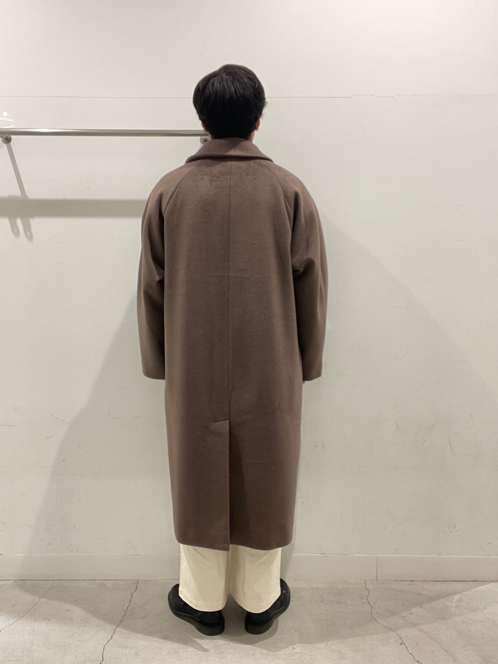 ブラウンのダブルロングコートに、グレーのカーディガンを合わせて落ち着いた印象に🟫