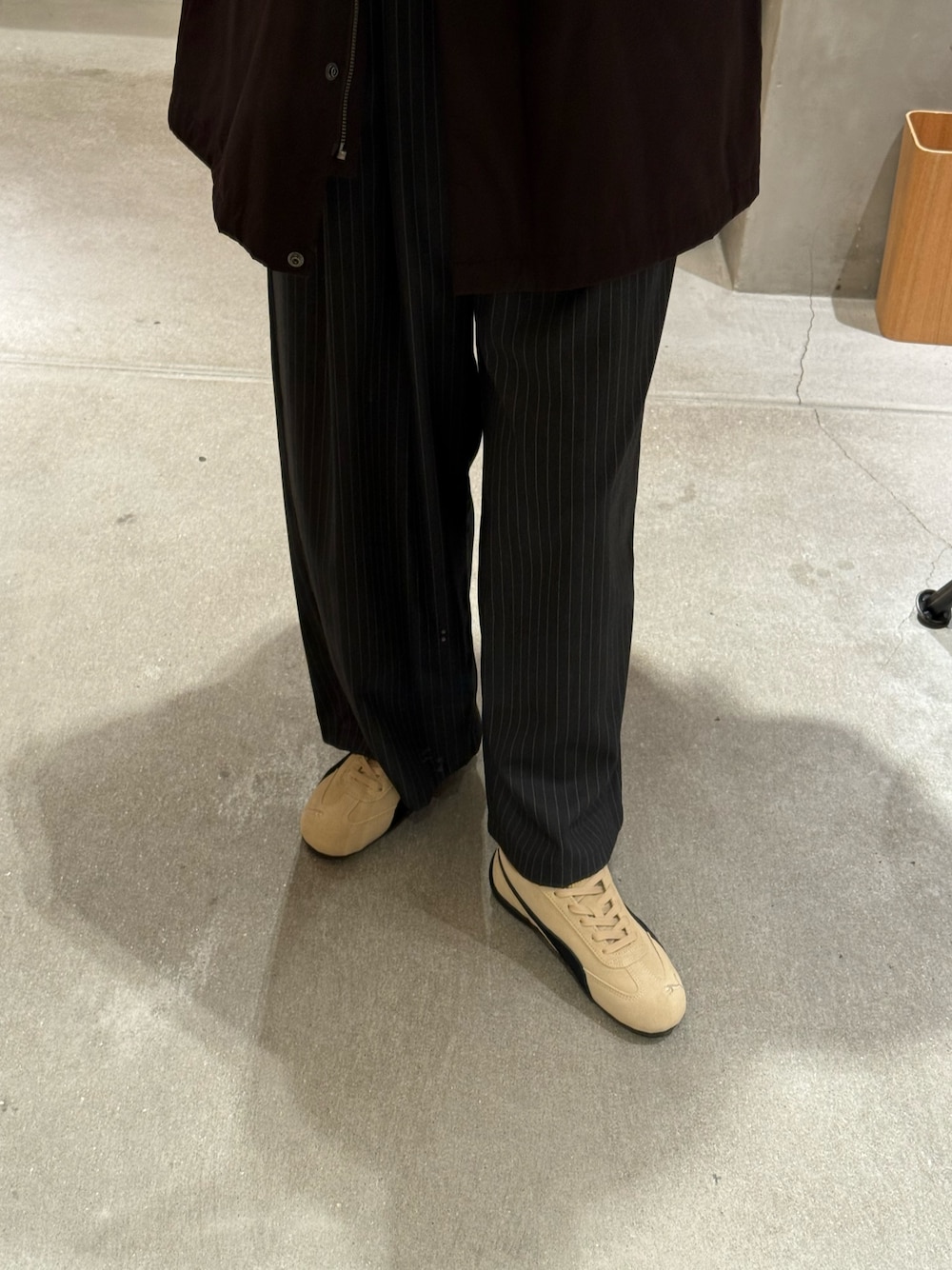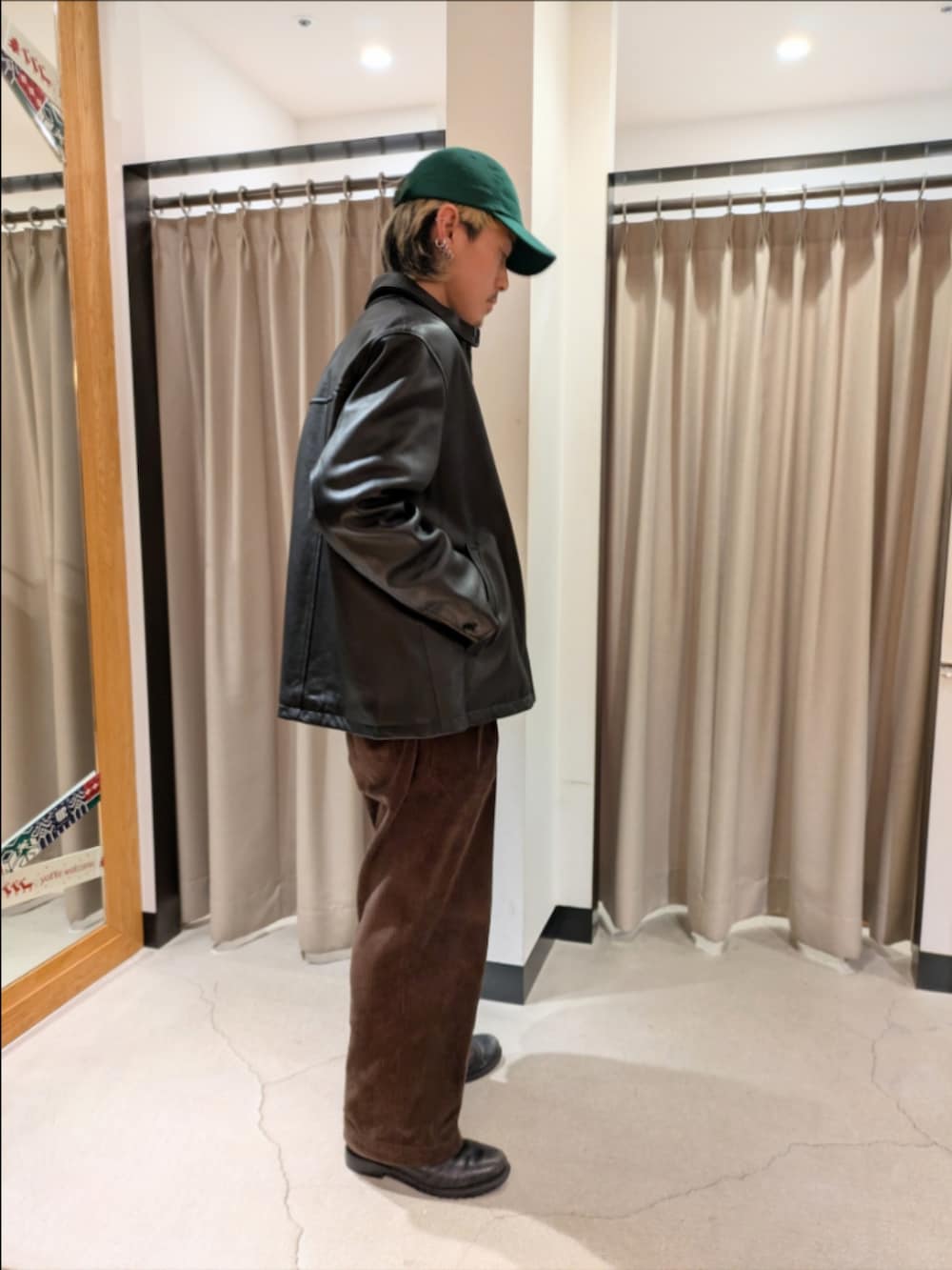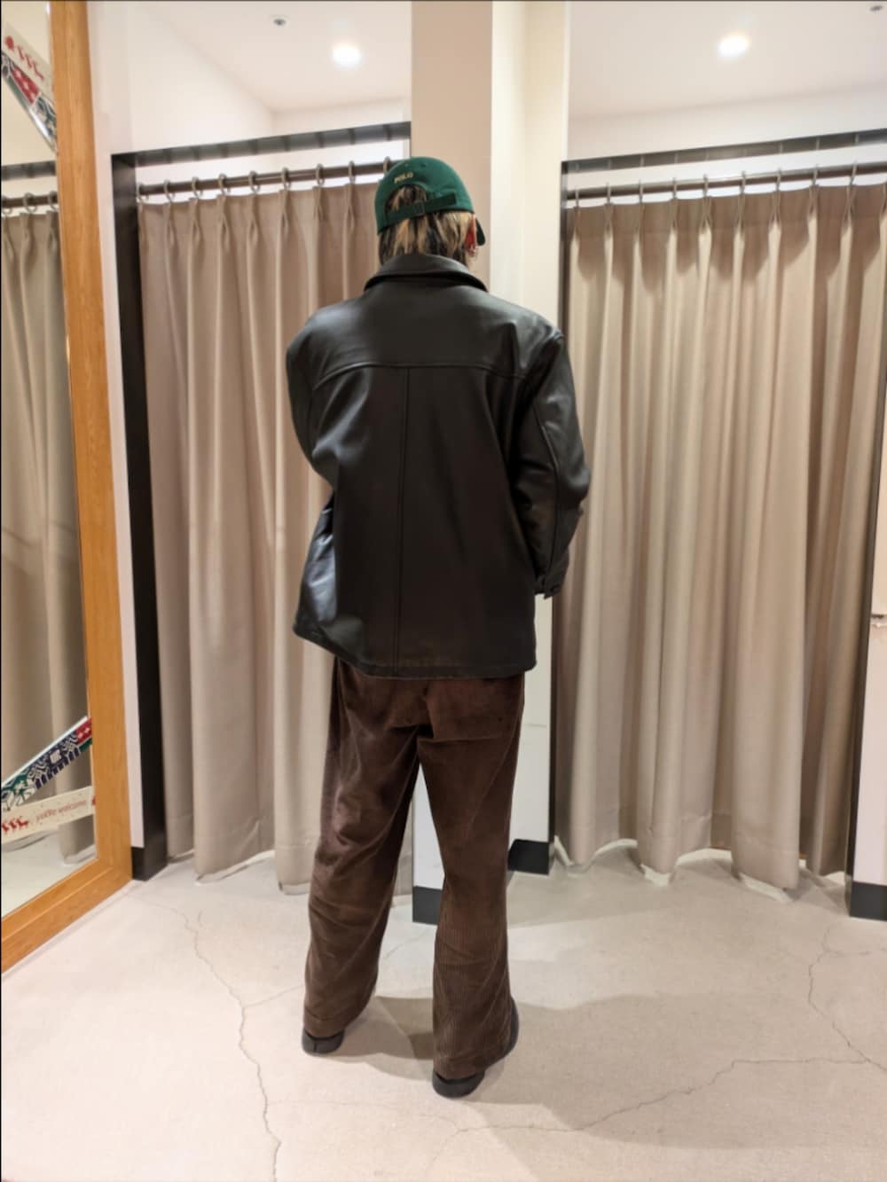 ジャケットはラムレザーで牛革よりも柔らかく、重めのレザージャケットよりも軽い印象で合わせられるのできれいめなスタイルのアクセントにおすすめです!