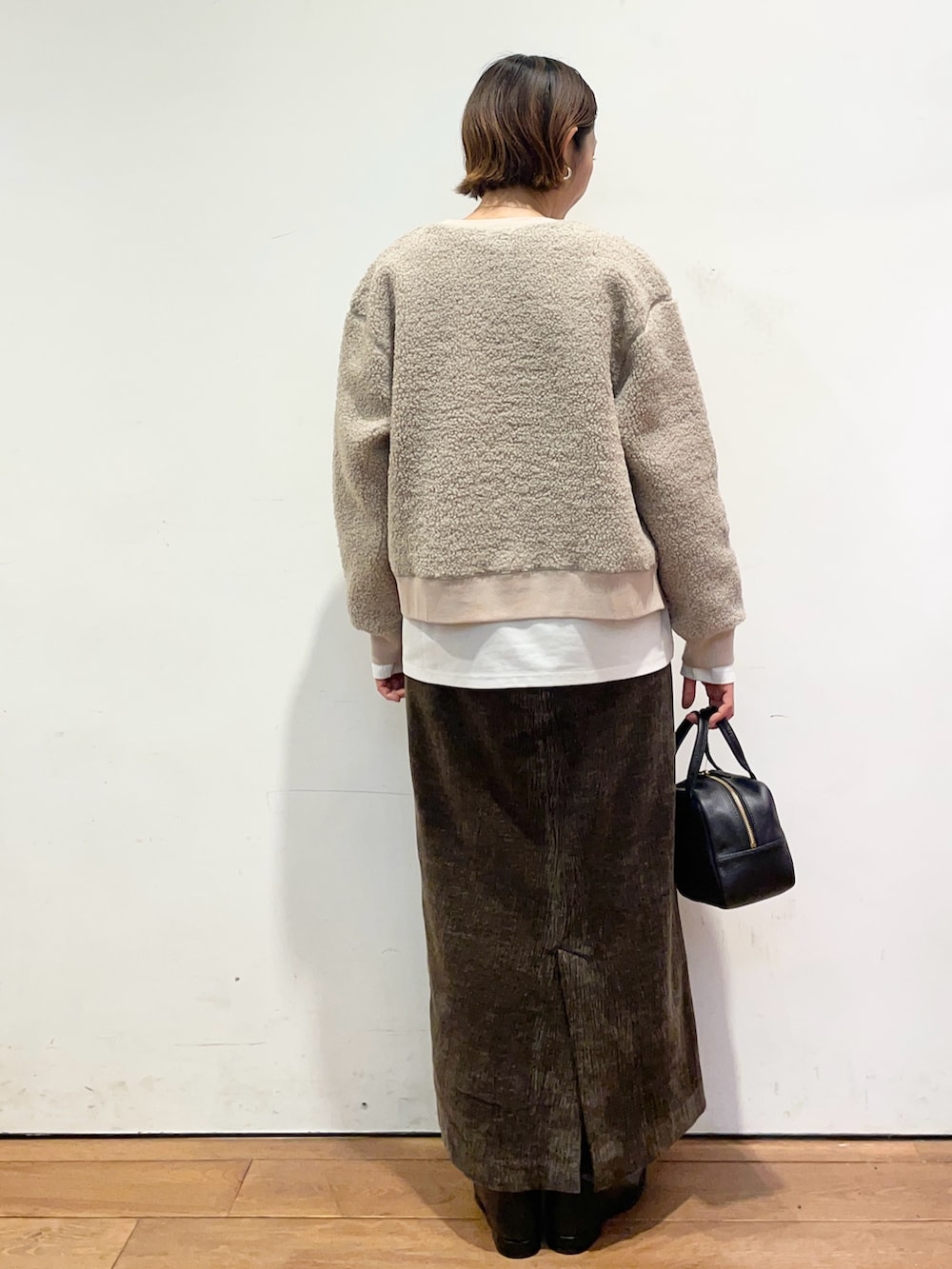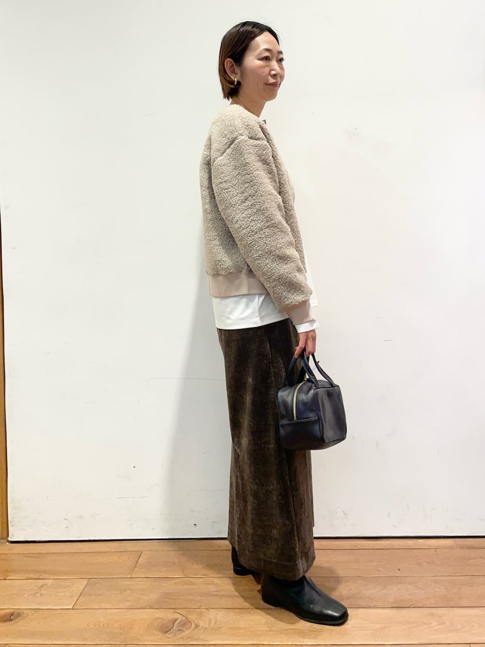 ボアのカーディガンは丈が短くて、どんなボトムスにも合わせやすいです◎
