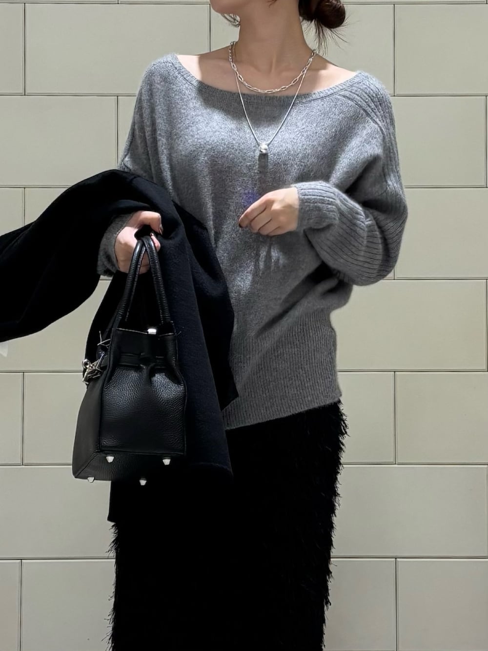 ボートネックのキレイめニットです。肌の見え方がキレイで冬のお出かけにオススメな一枚です。ボトムス次第でカジュアルにも着こなせそうです。