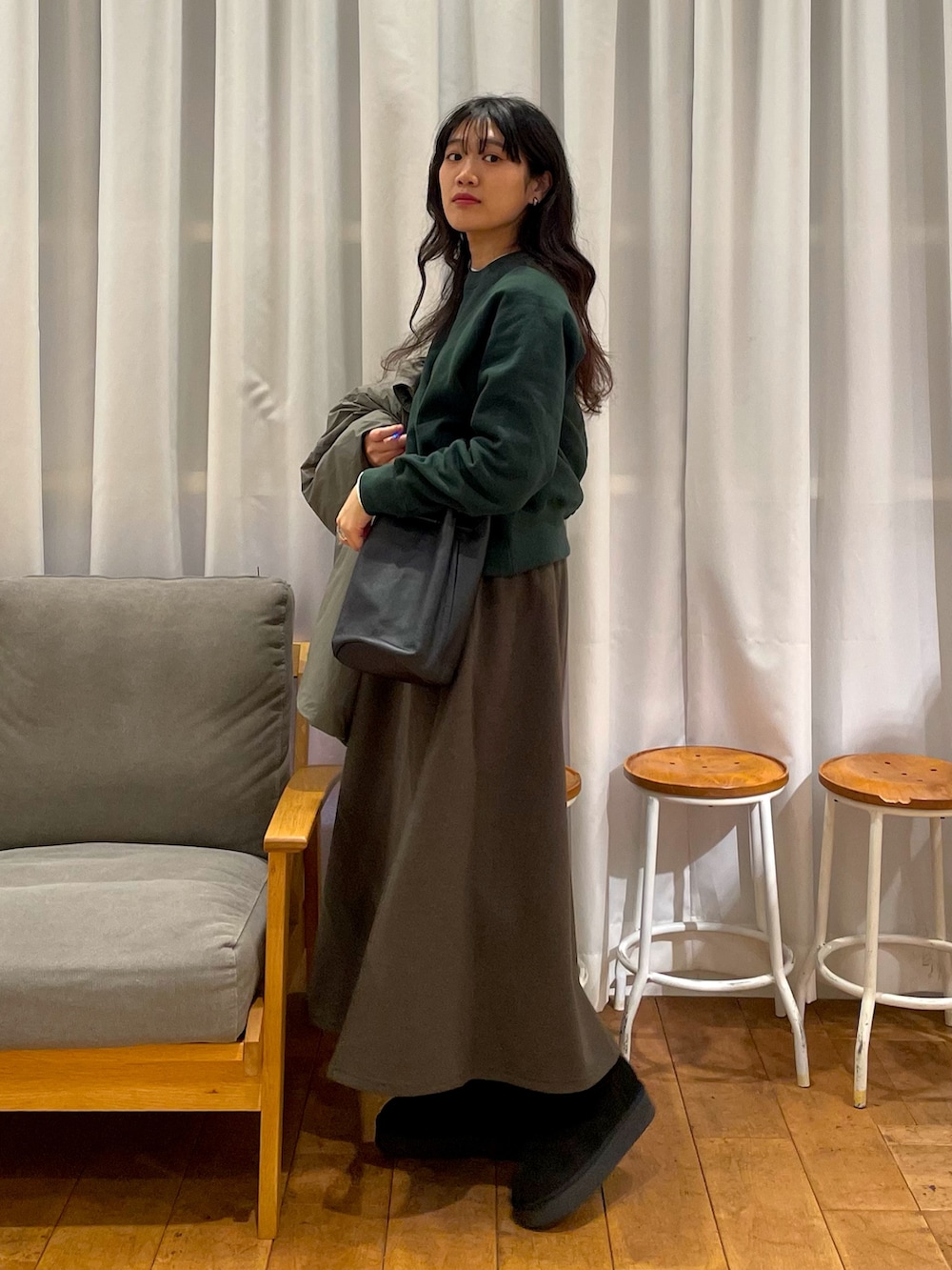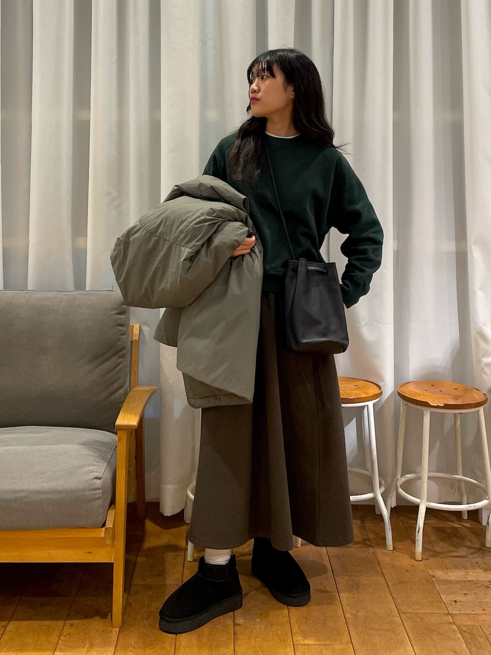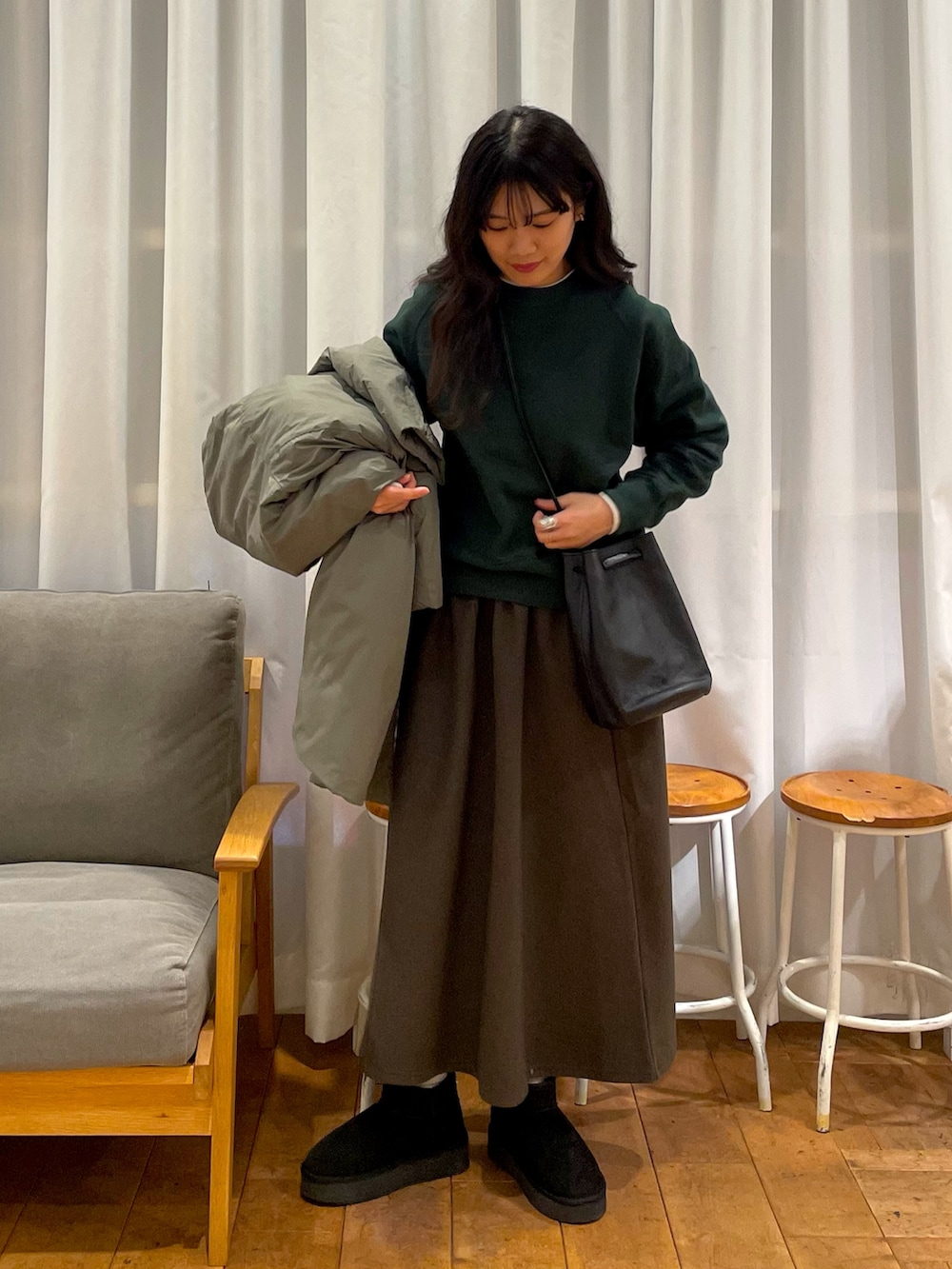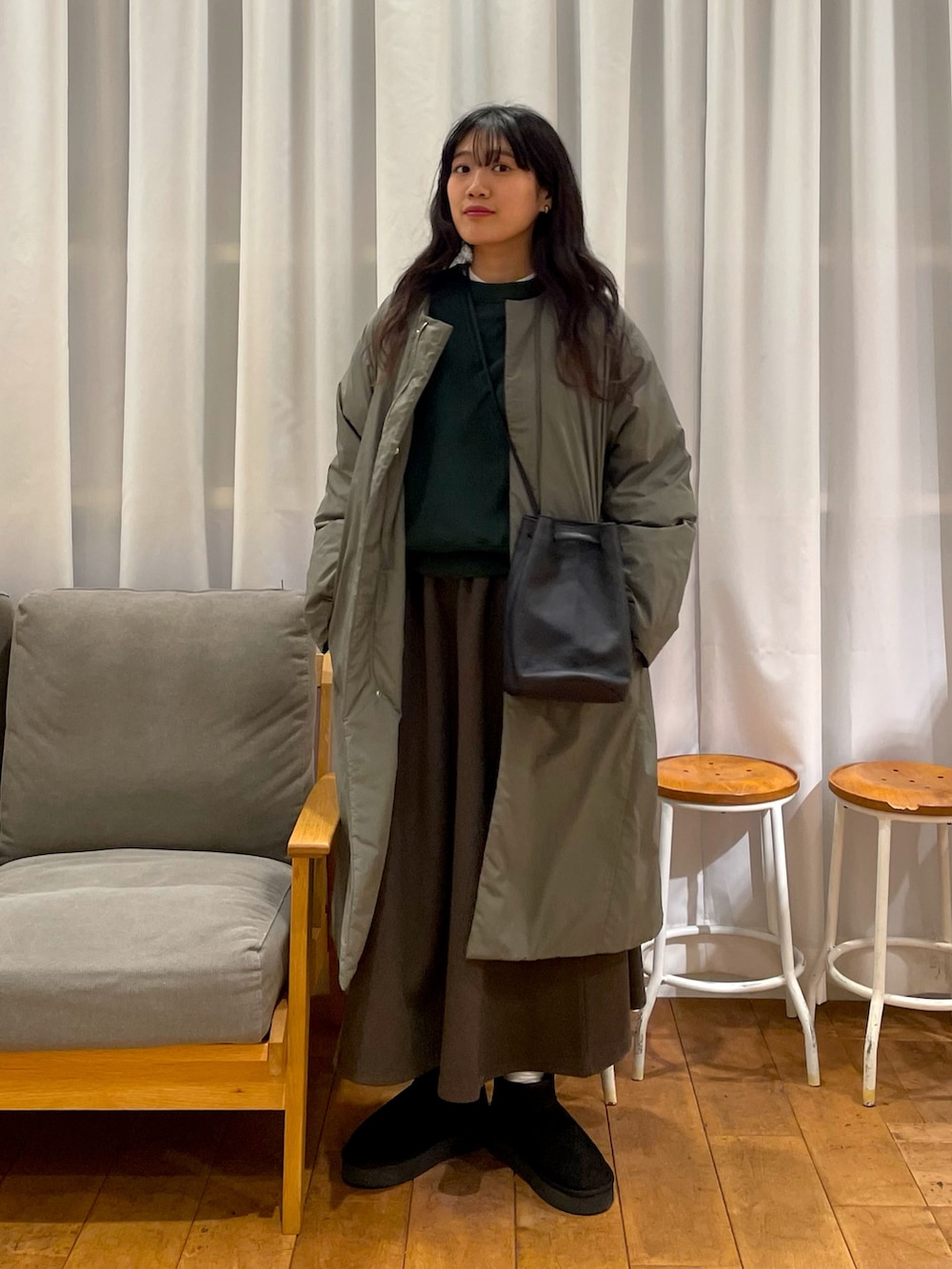 中綿のロングコートがほっこり暖かいグリーンコーデを組みました🫛