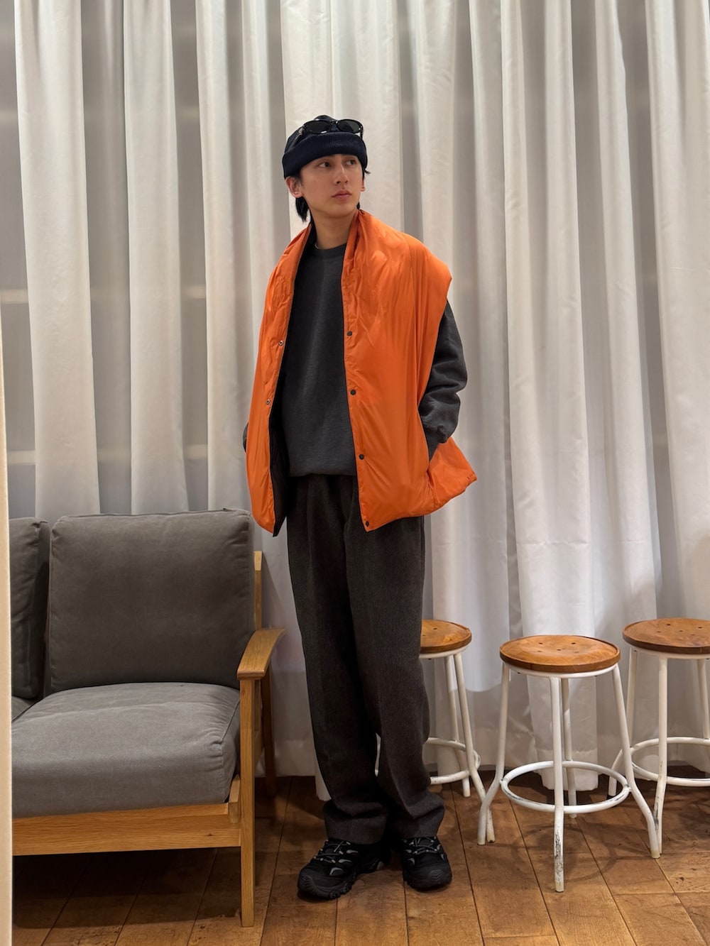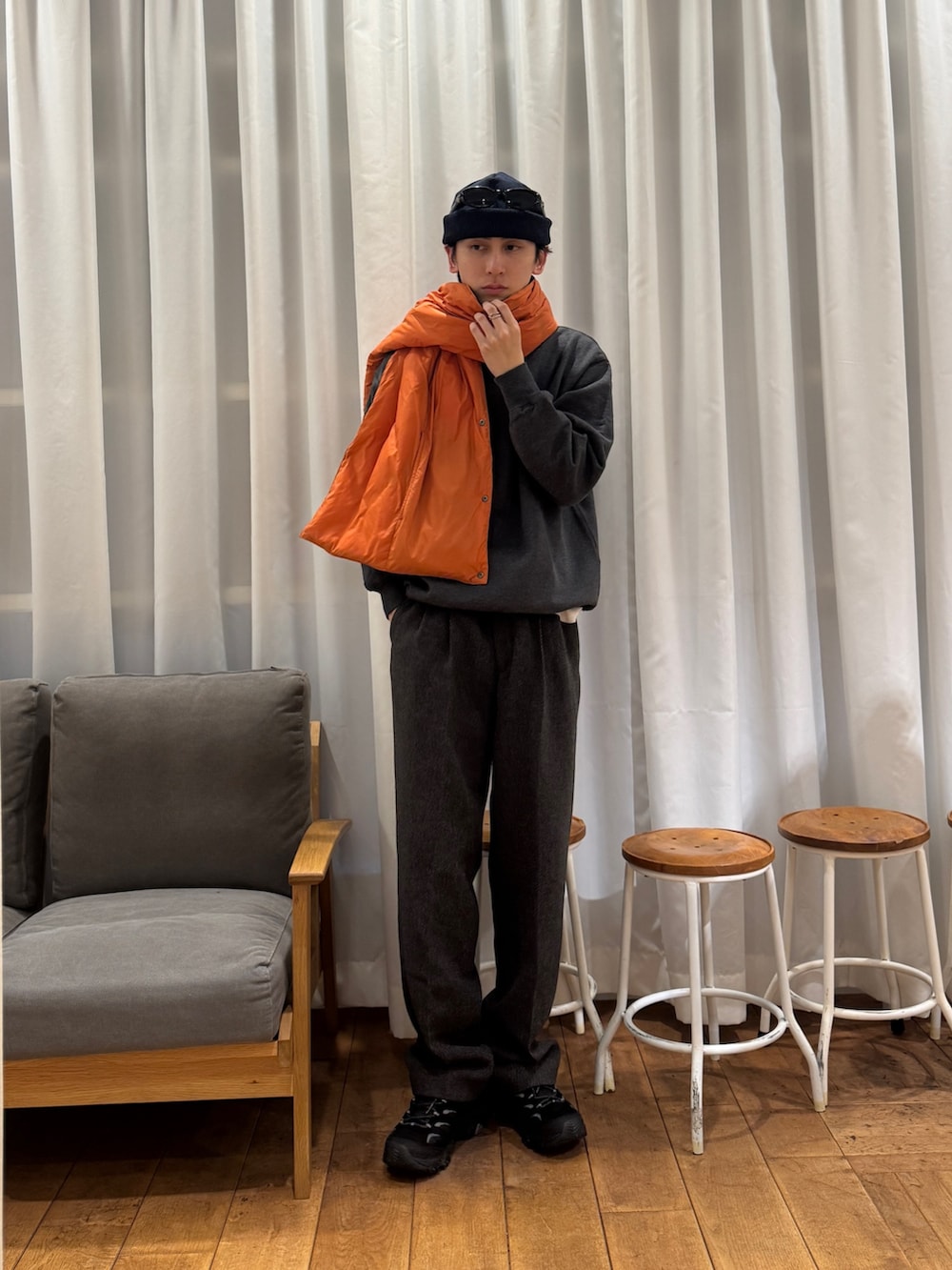 キャンプなどに持ってこいなダウンショールを、待ち着として着用できるようにスタイリングに落とし込みました‼️
