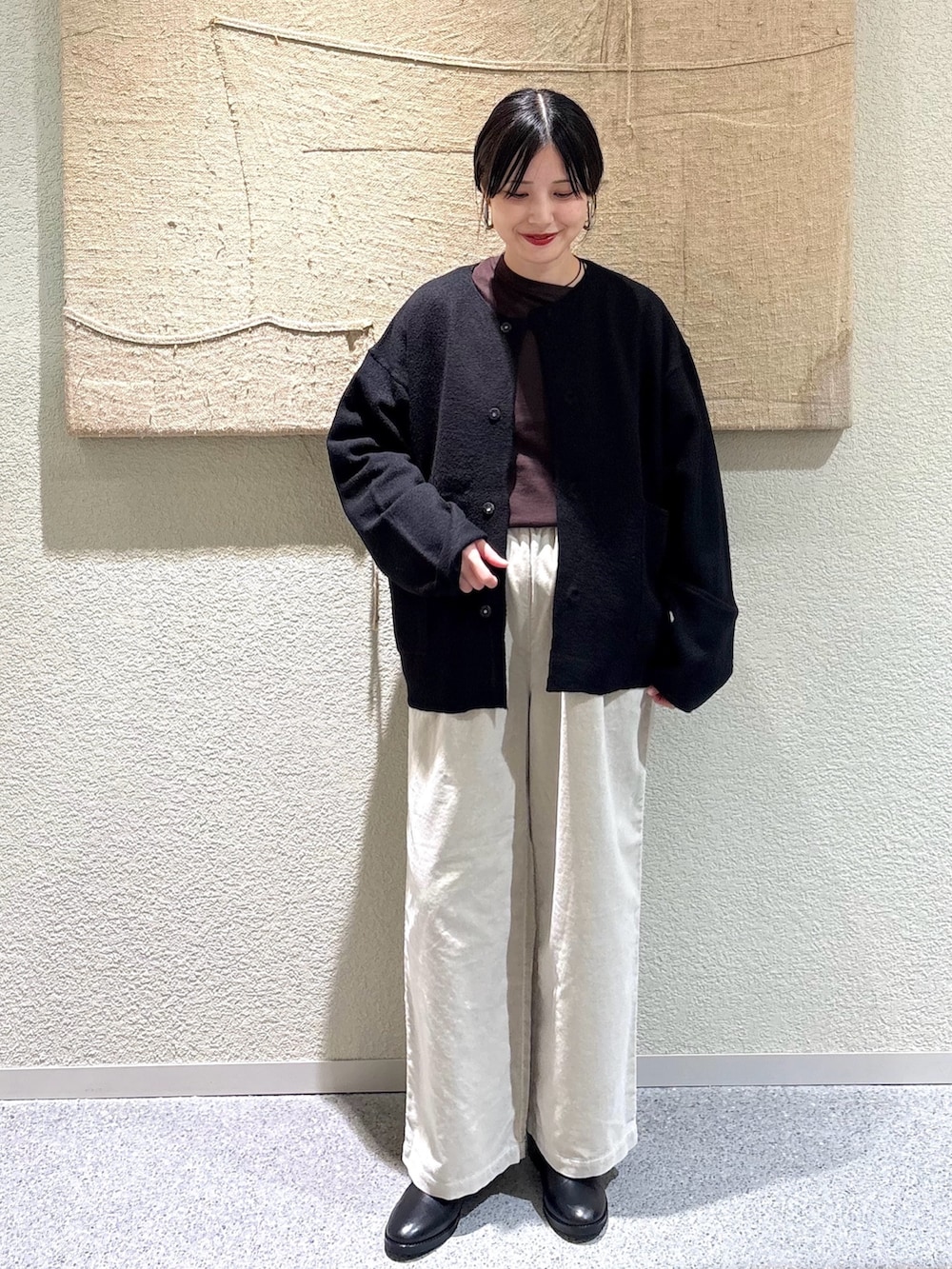 ・ブラウン×グレージュの柔らかい暖色コーデをブラックのショートジャケットで引き締め