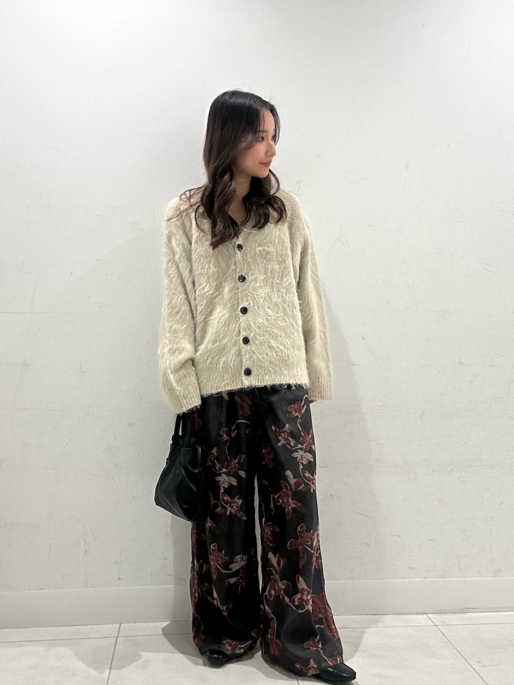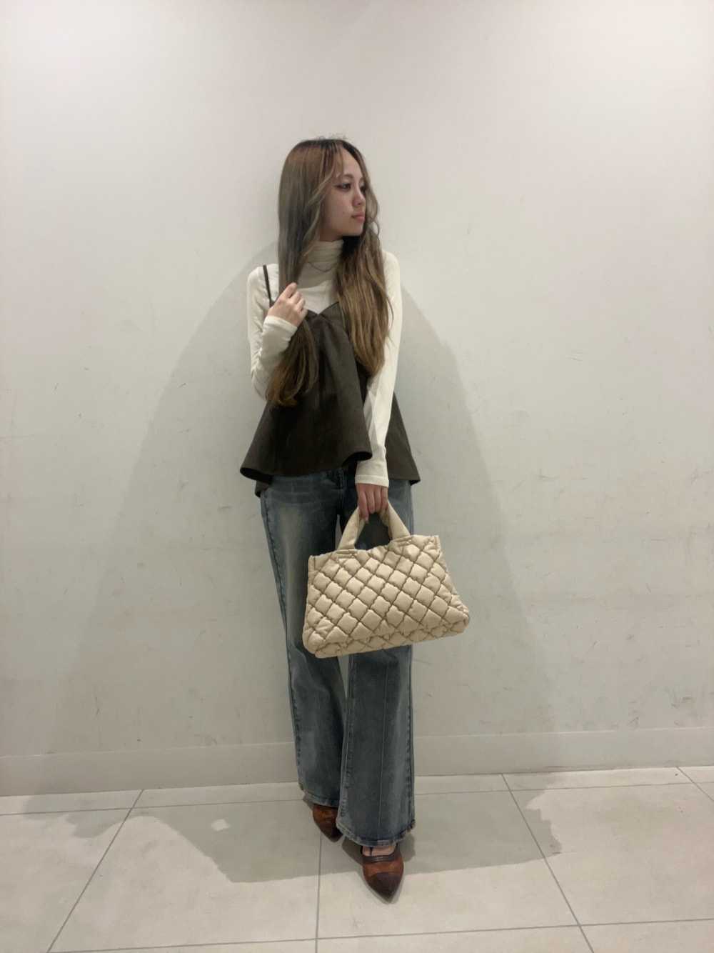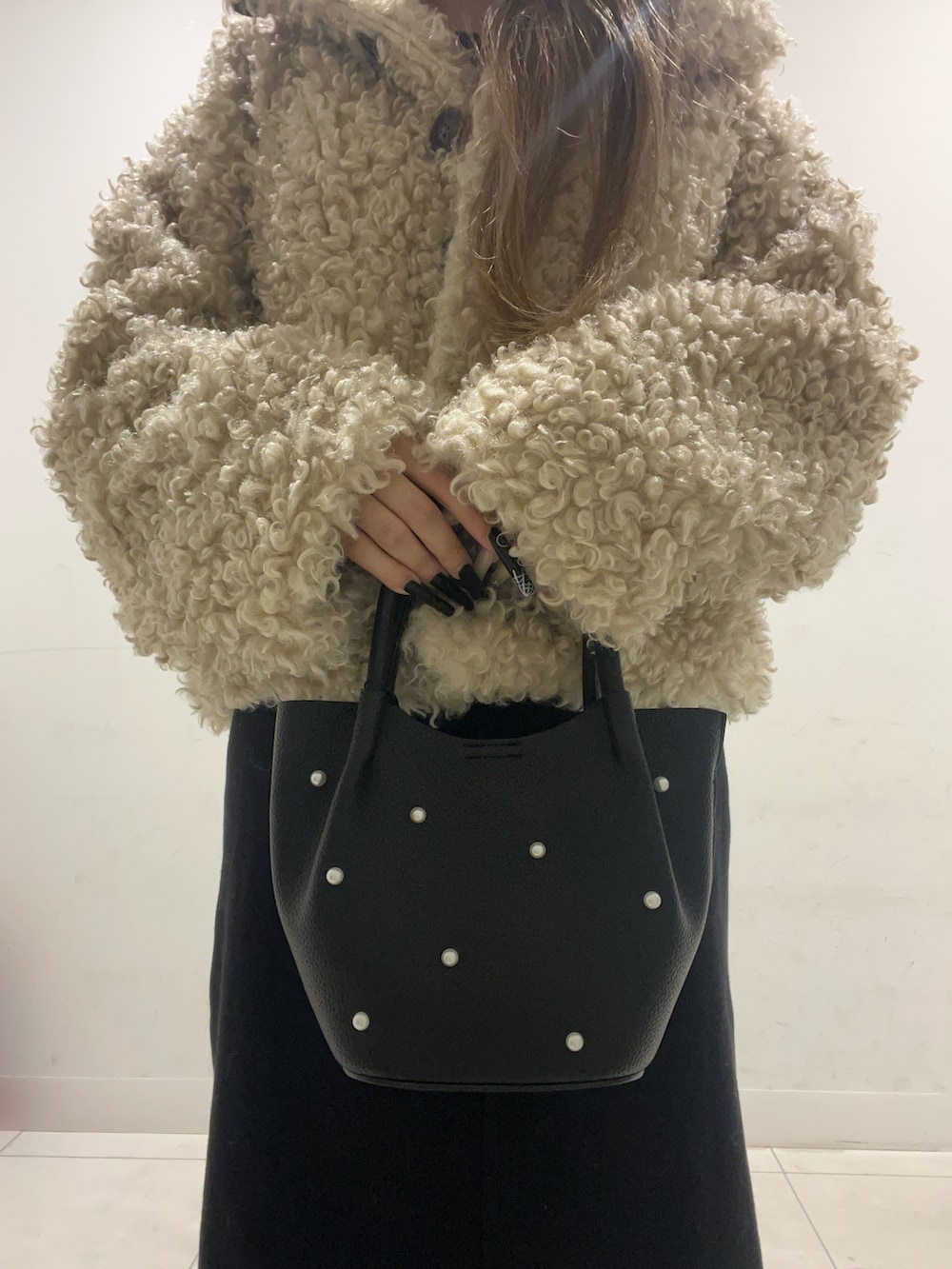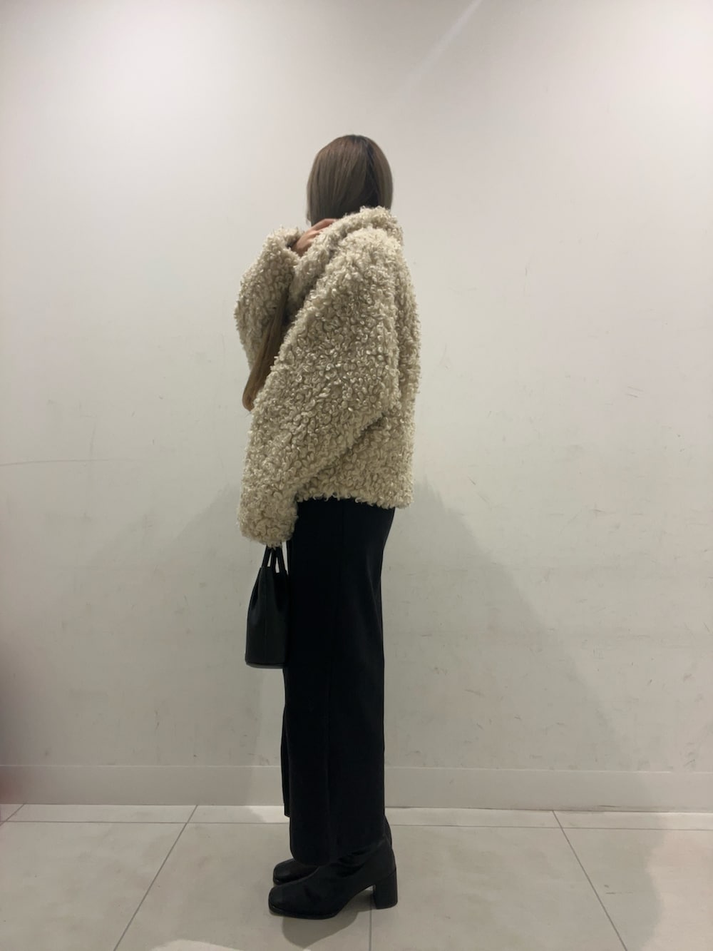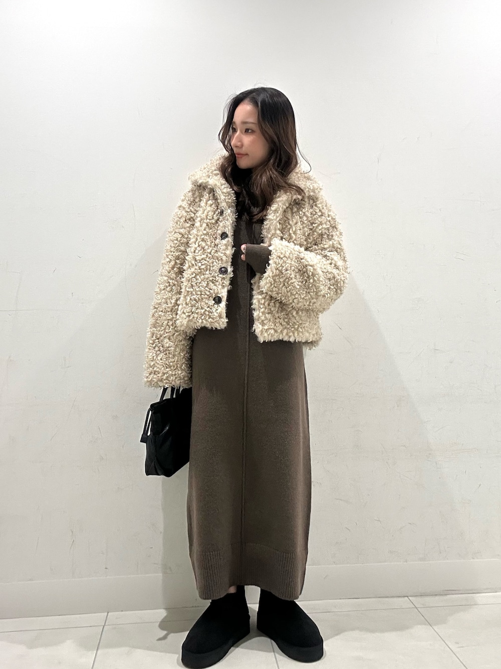 バッグとブーツを黒で統一して、ファージャケットのボリュームと明るさを引き立たせました♡