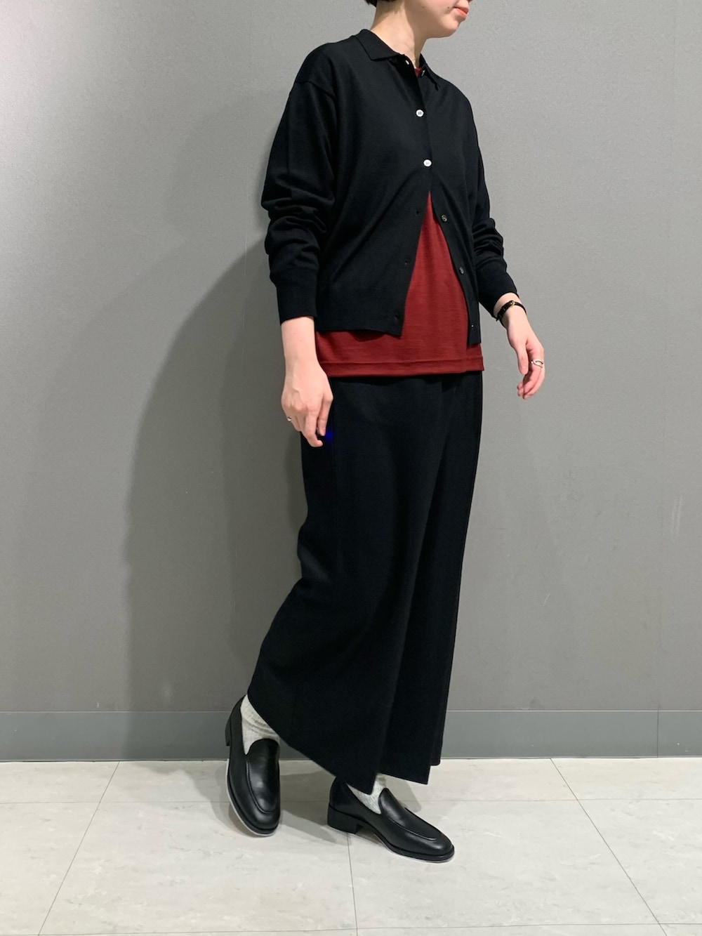 ボタンの開け具合で印象の変わるポロカーディガン。裾のリブがキュッと詰まったメリハリのあるデザインです。体に馴染むウールの生地感は滑らかで着心地も◎