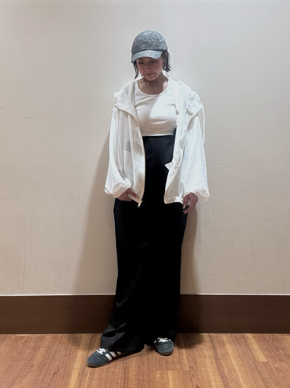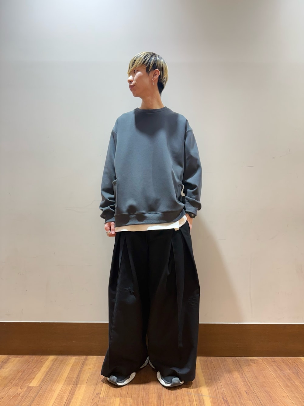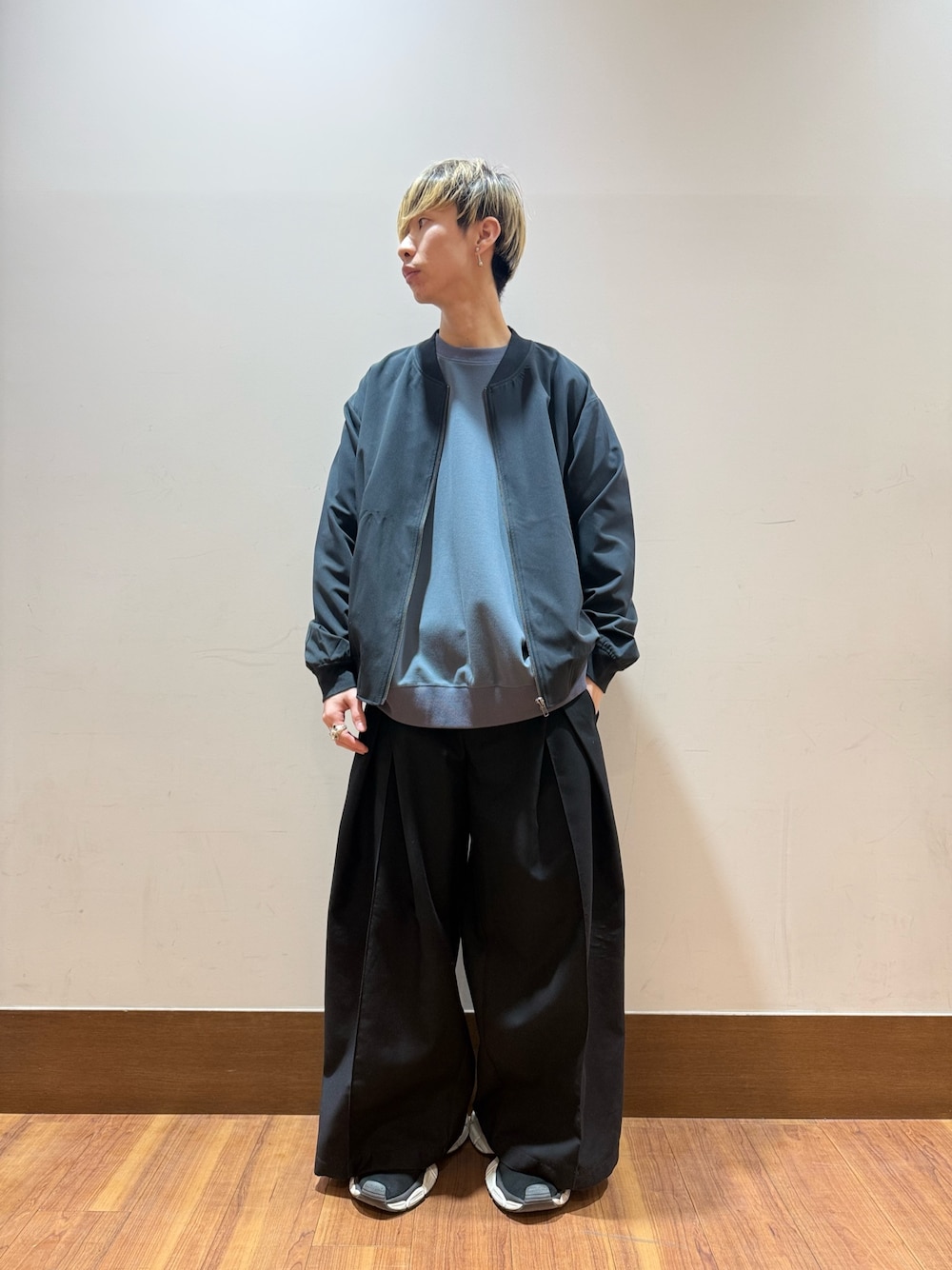 アウターとボトムはダークトーンで、