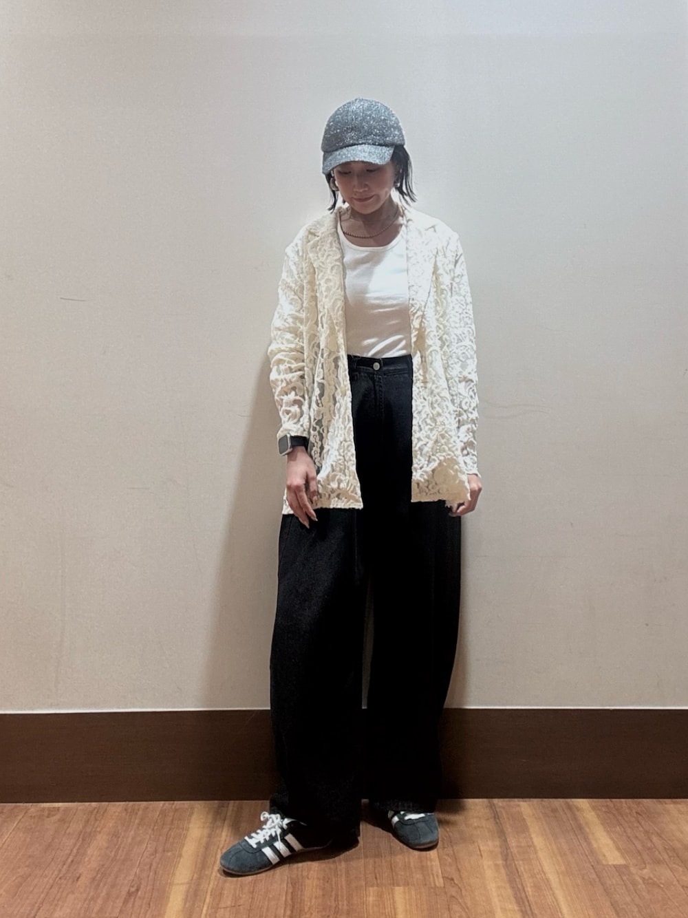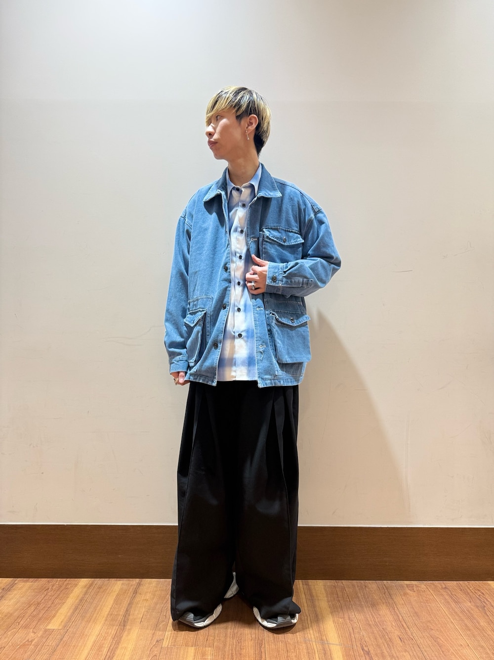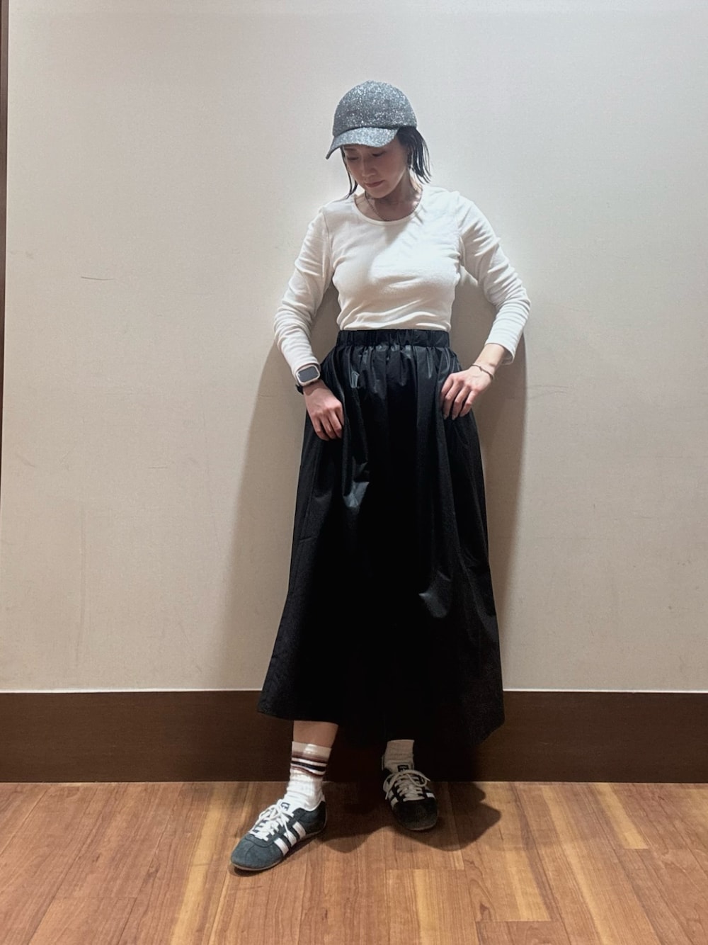 アウターとボトムはダークトーンで、