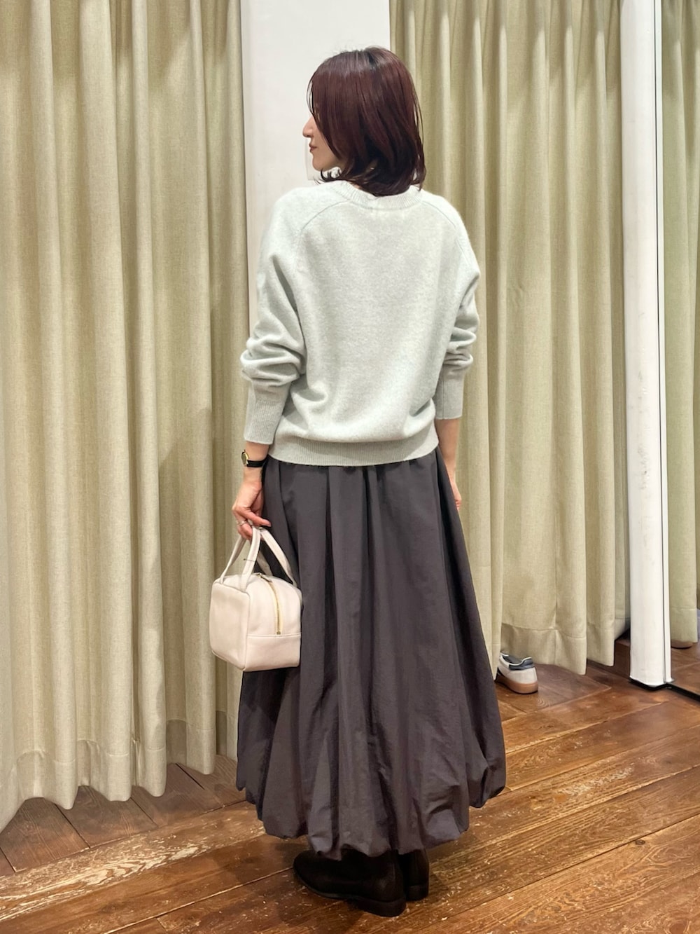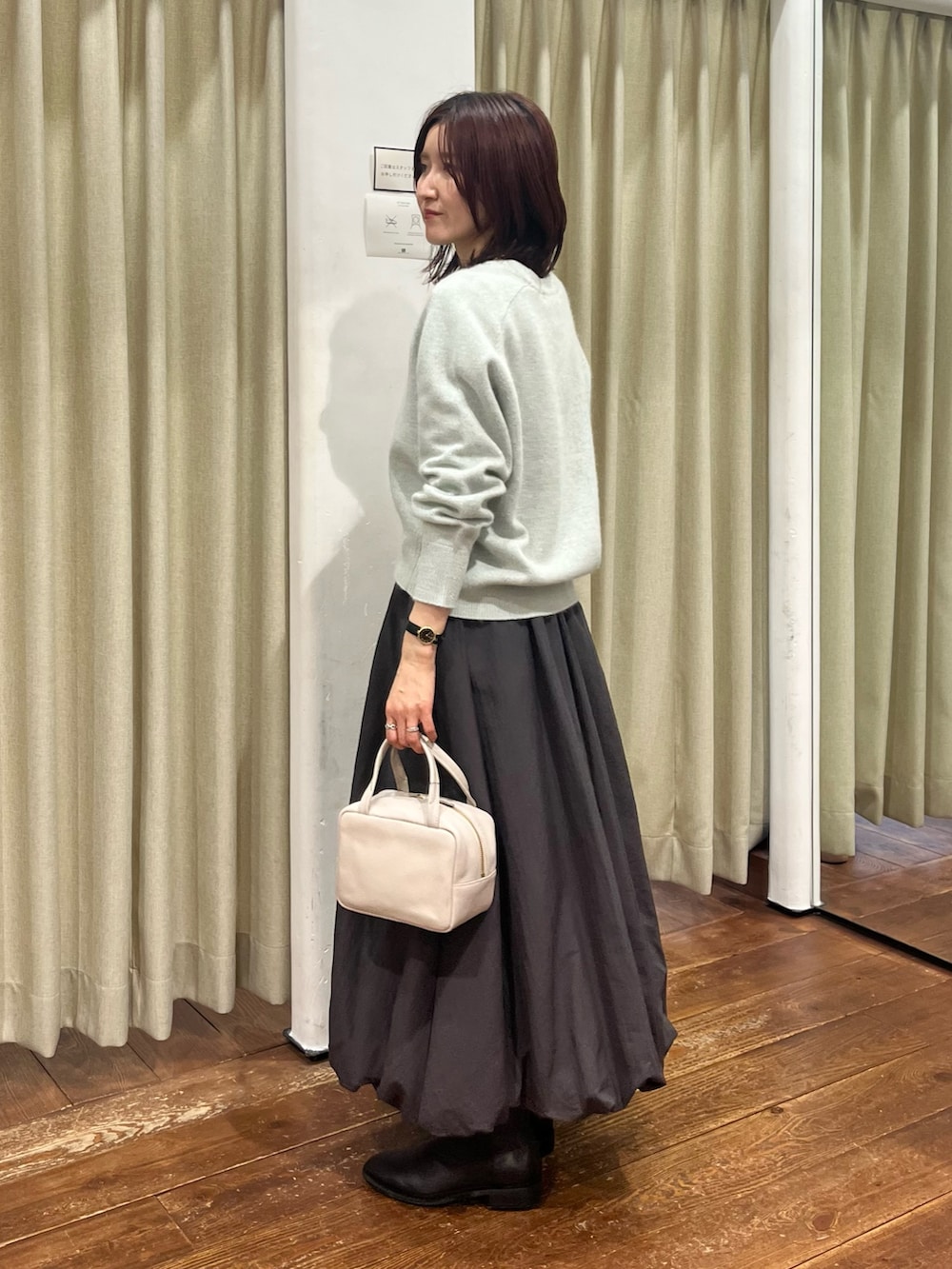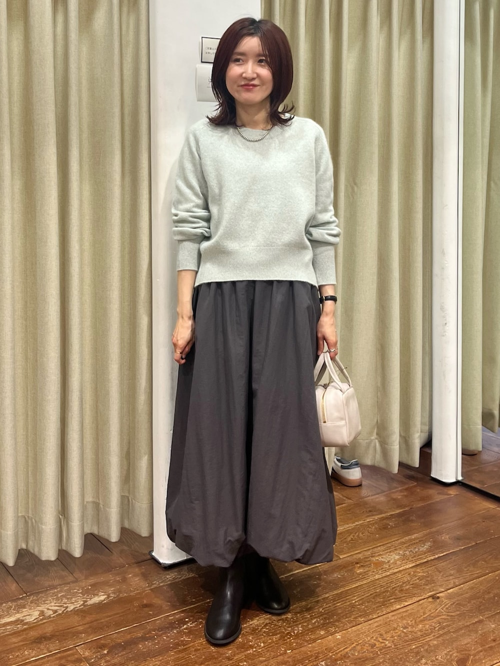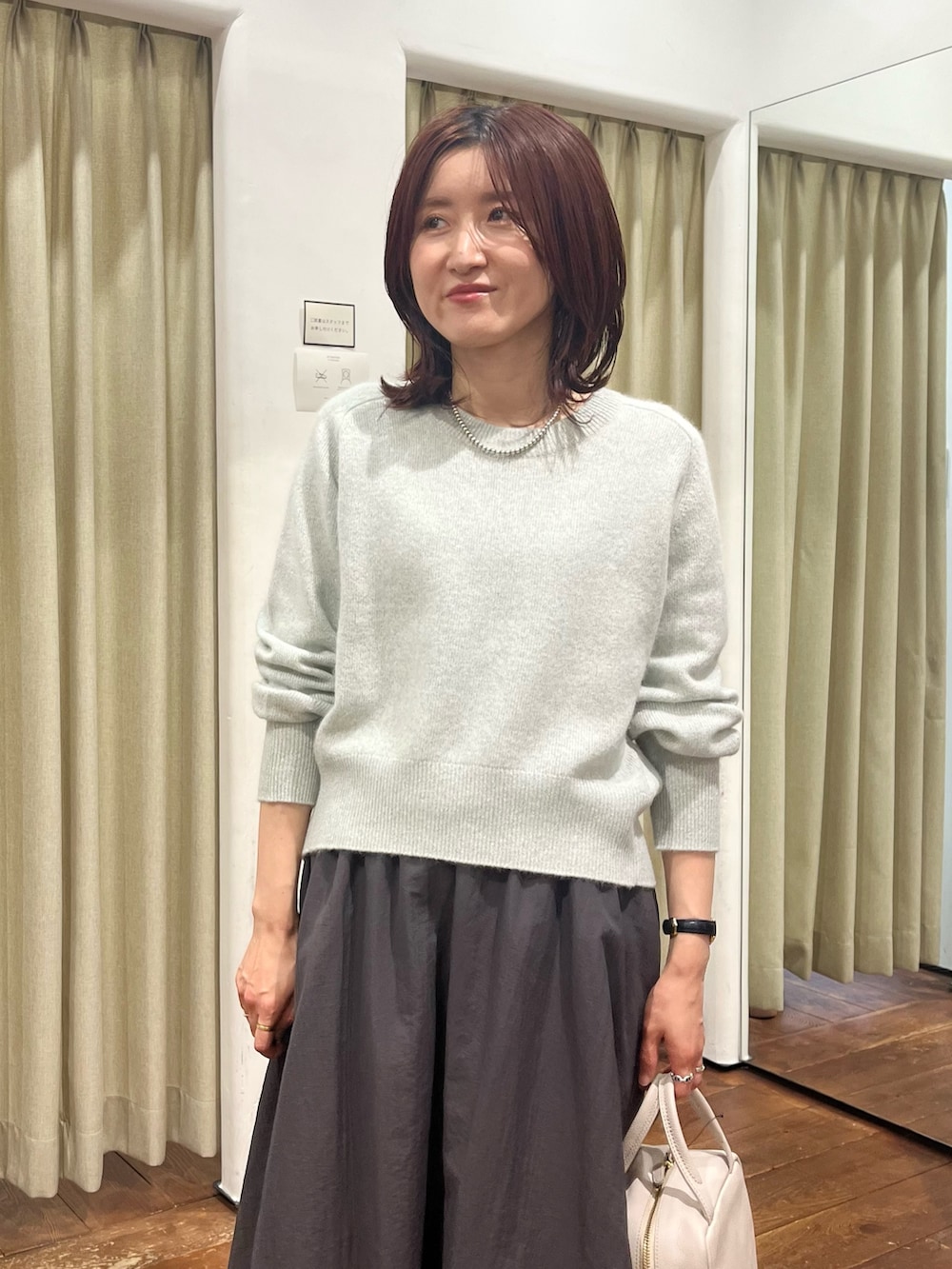 合わせたニットはFOX混のふわっとした優しい肌触りで、ミントのカラーが上品でさりげなくラメが入っているのでより高級感があります。