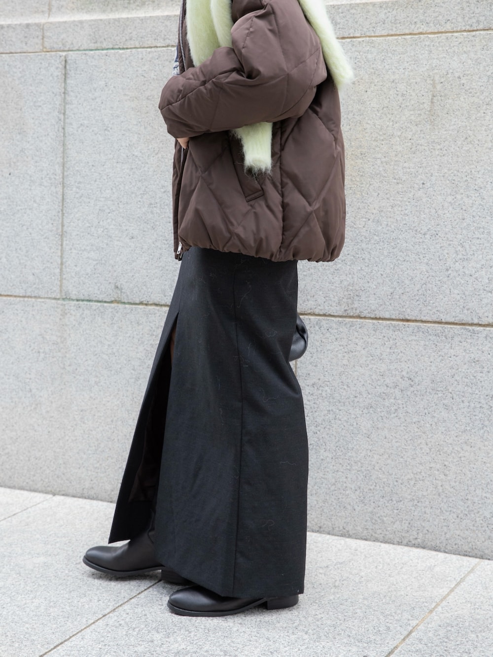 少し分かりづらいですが、深めのスリットが入っているのでロングブーツを合わせております◎