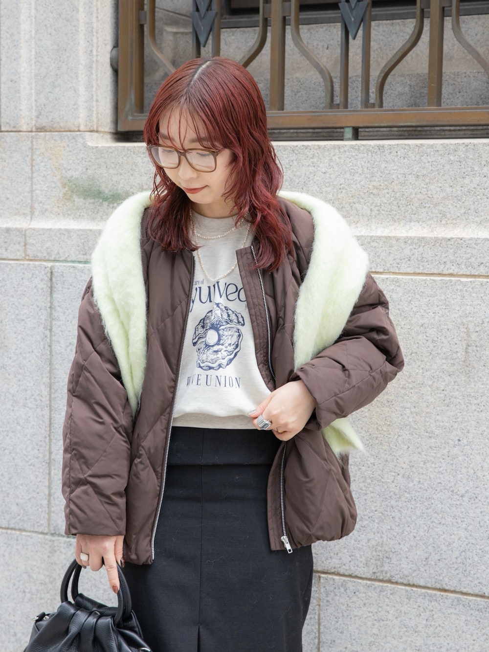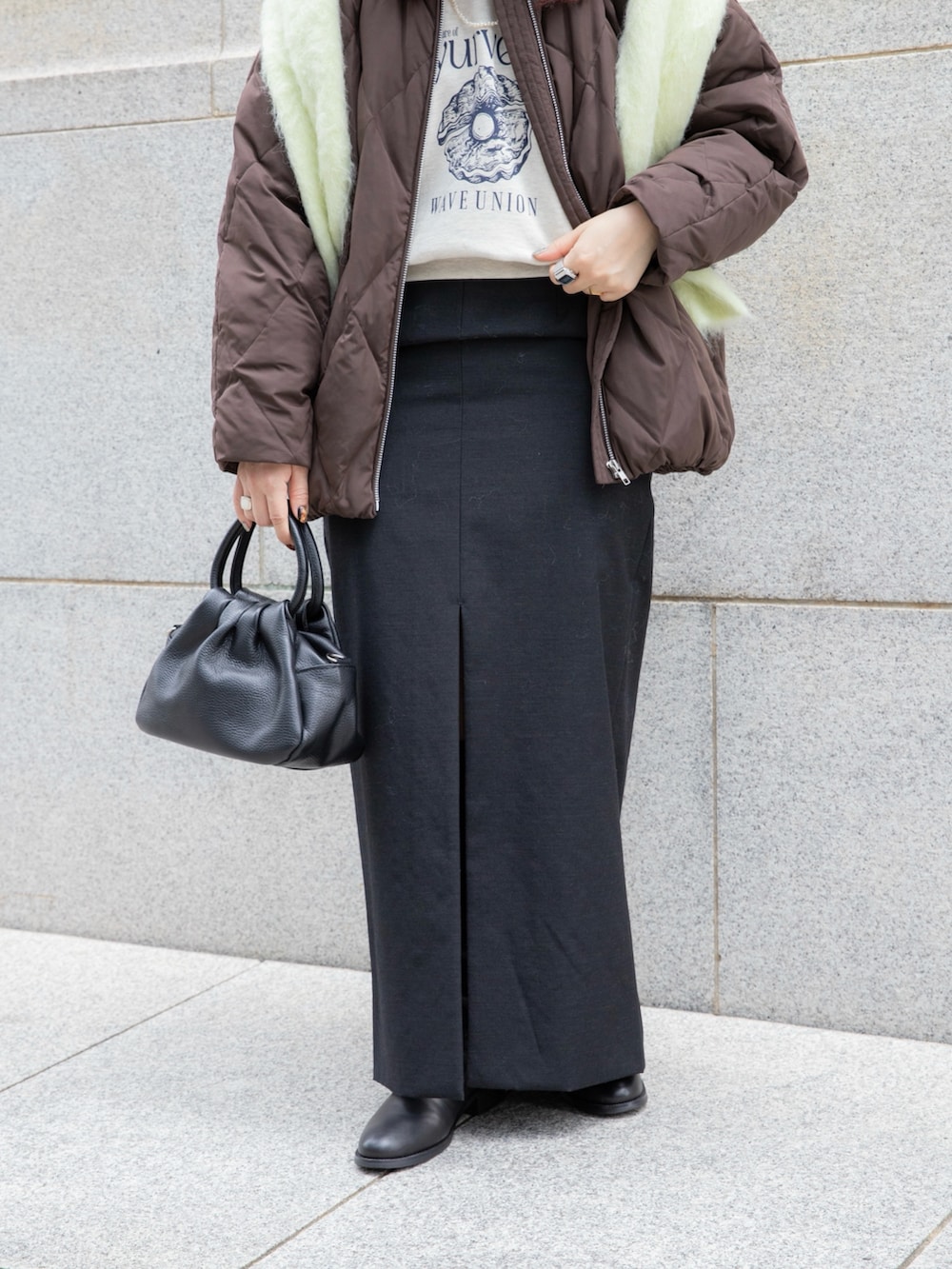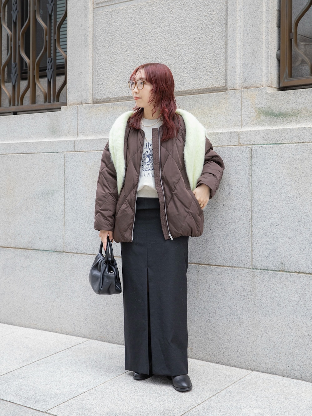 ダウンがオーバーサイズなので、スッキリめのボトムスで合わせました。