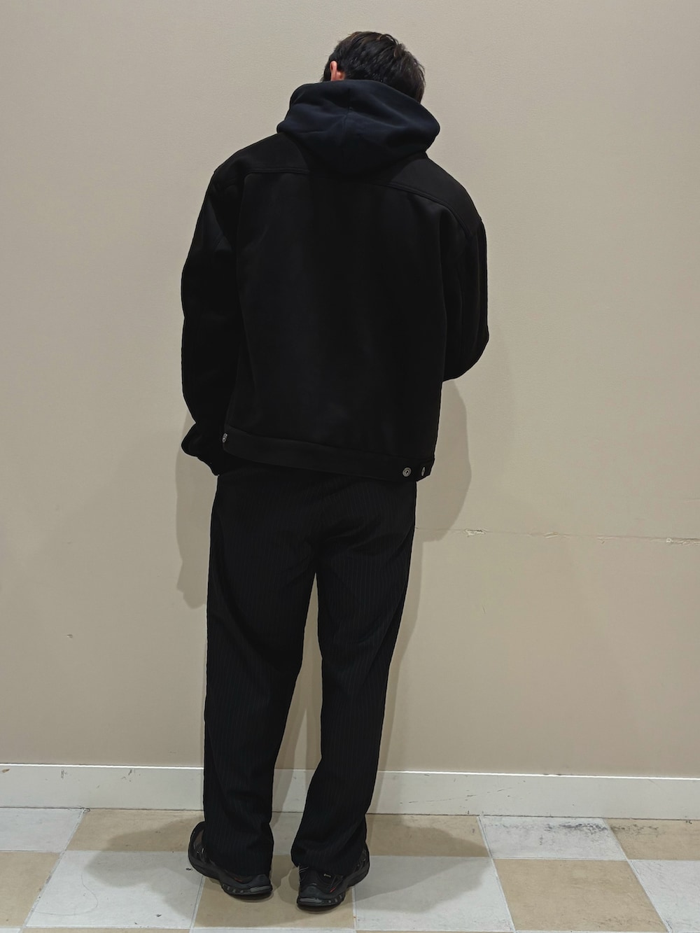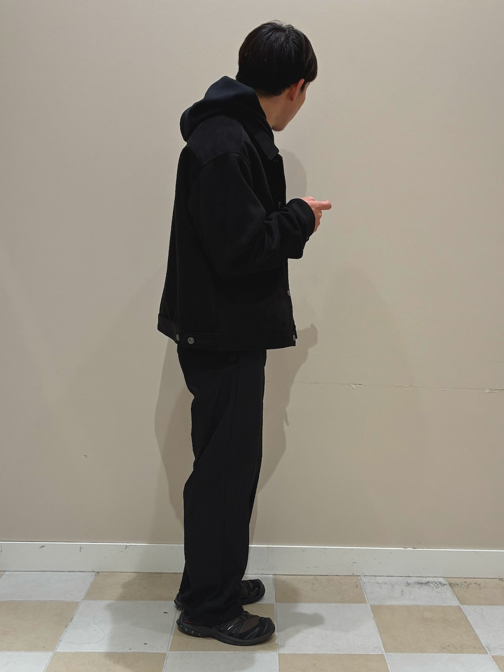 黒を基調にしたコーデでも、素材の違いとシルエットでしっかり立体感を演出。