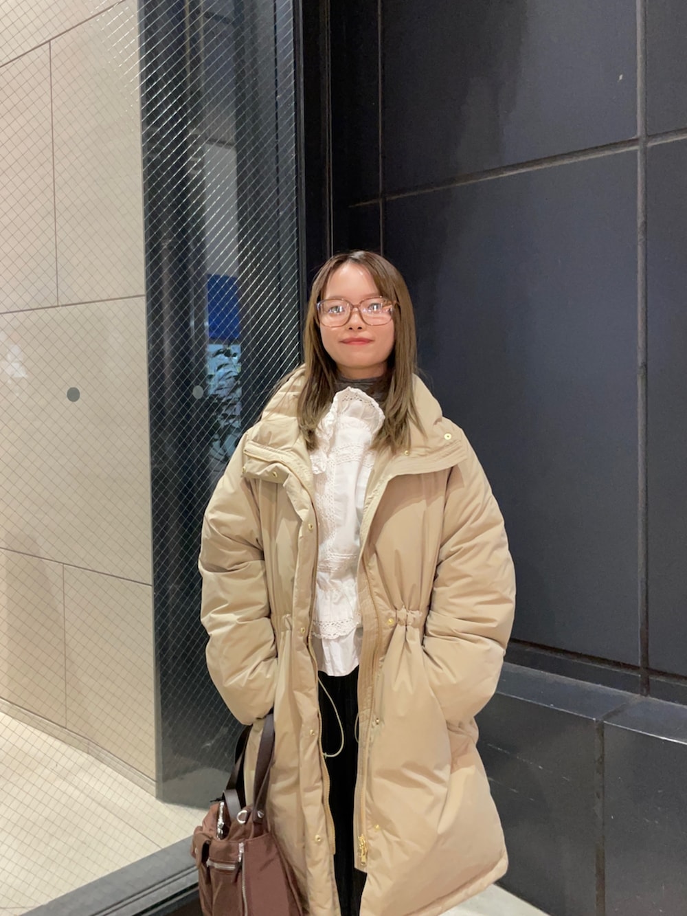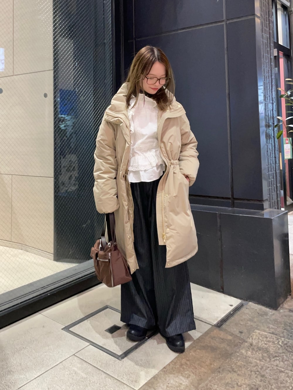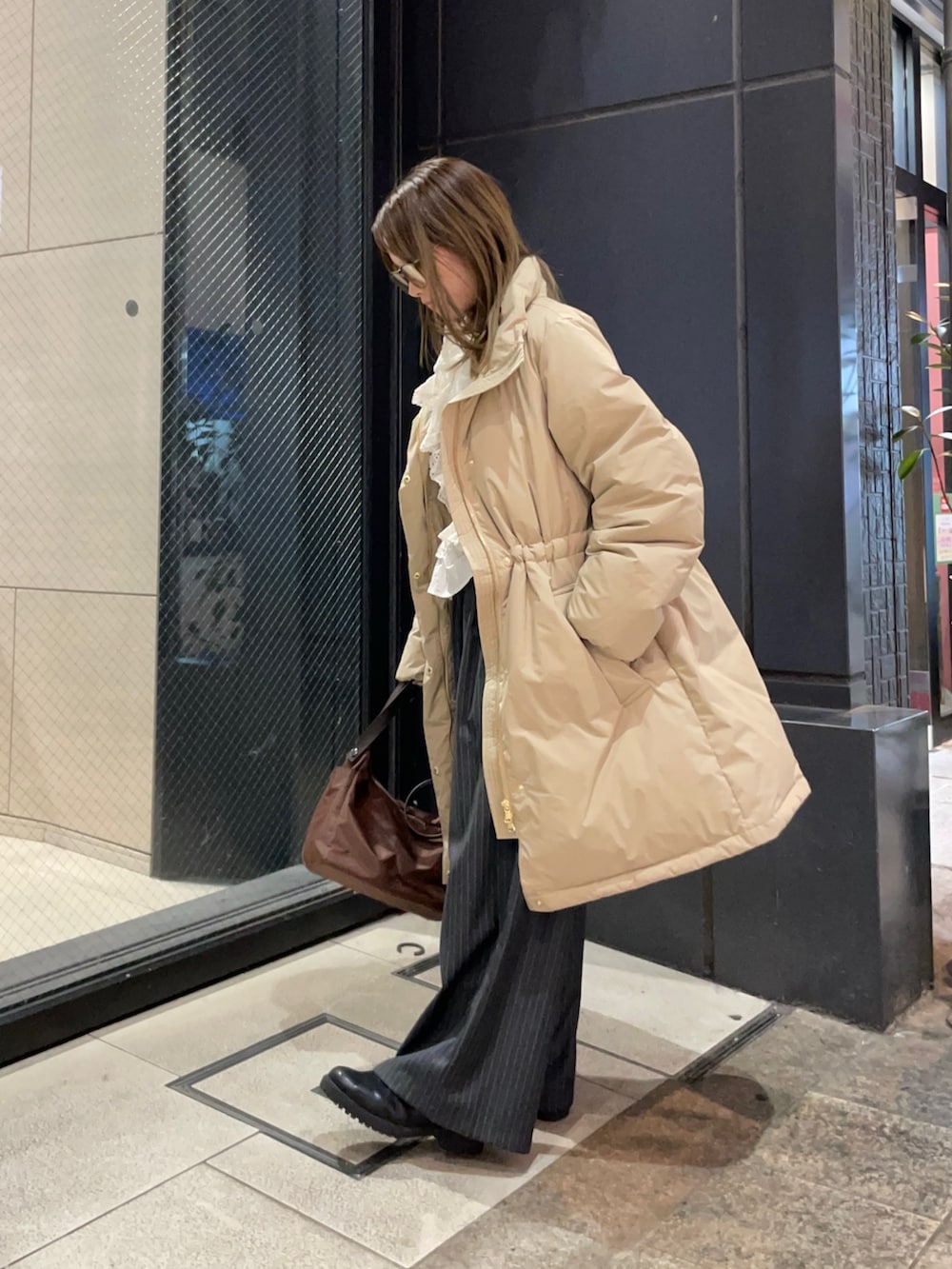 ダウンは、低身長だと膝あたりまできてくれる着丈の長さとウエストが絞れるデザインで、スッキリ見せてくれます♪暖かく軽く着やすいですよ!
