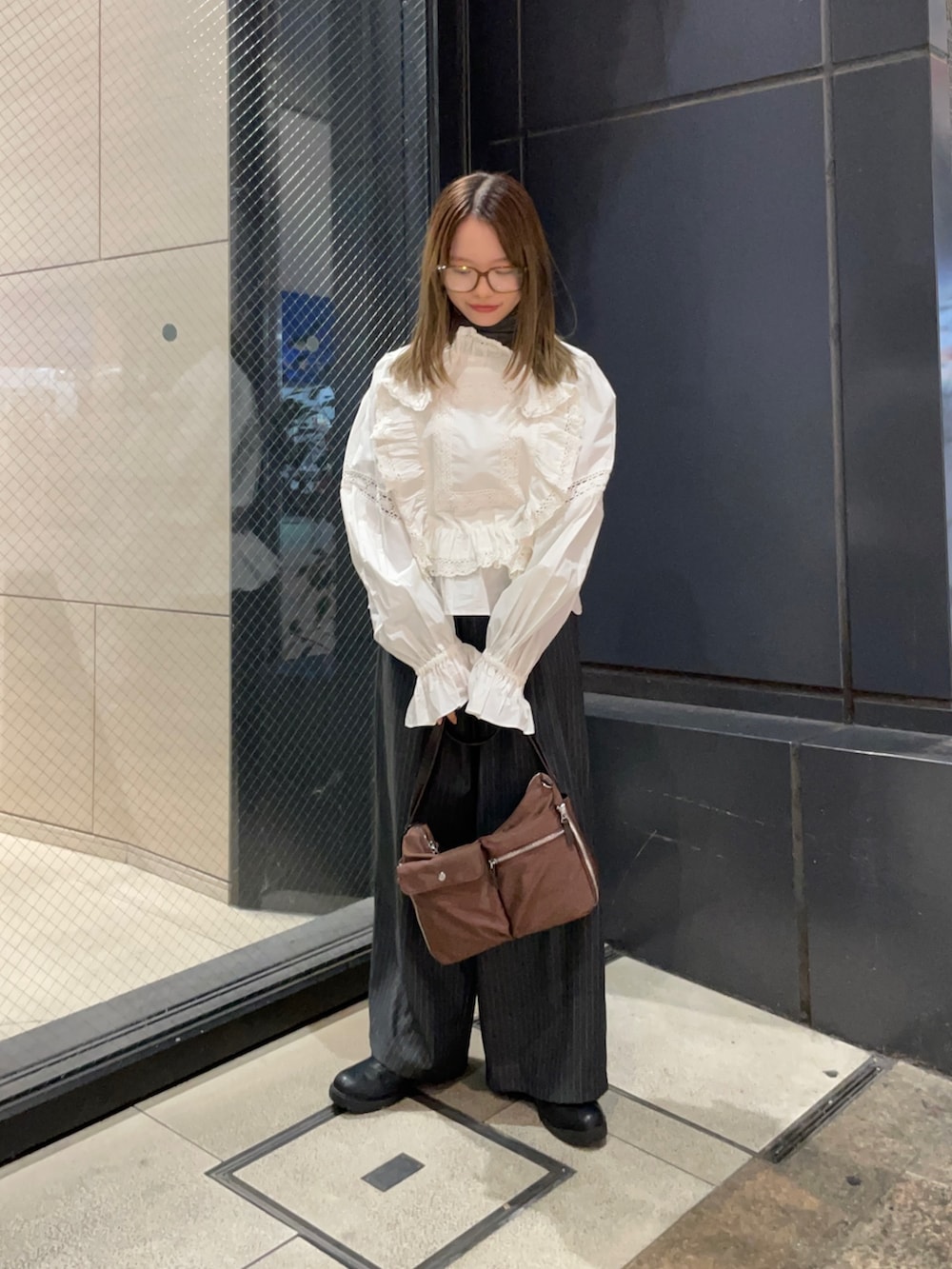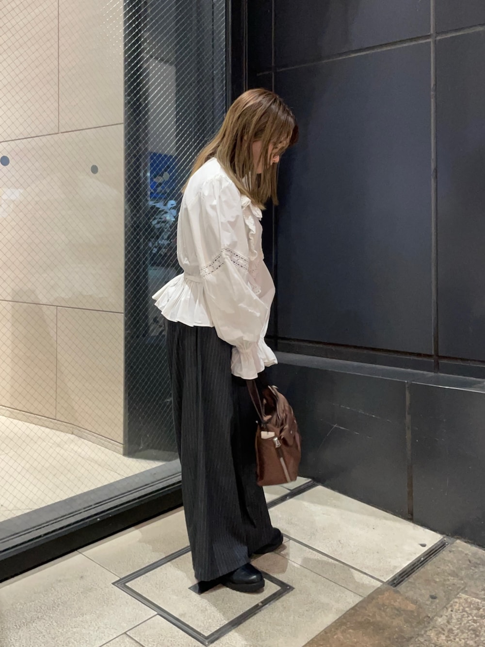 ブラウスはフリルが可愛く、丈感もショート丈なので、パンツ合わせもスッキリ見せてくれます!春は一枚で着れて、秋冬は薄手のタートルを重ねても、着れますよ✨