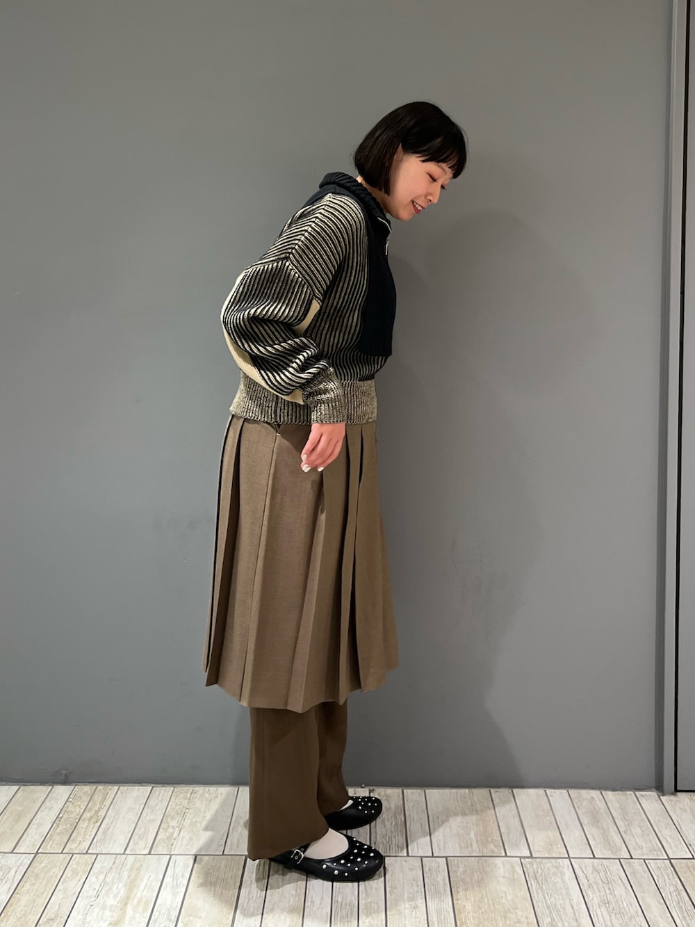 スカートはワンサイズのもので、1枚で履いて綺麗目に来ても、デニムやスラックスとレイヤードしても◎