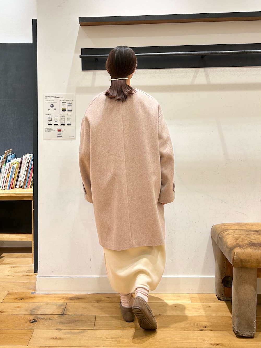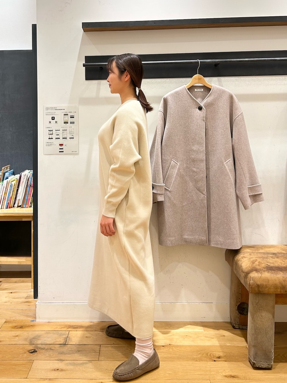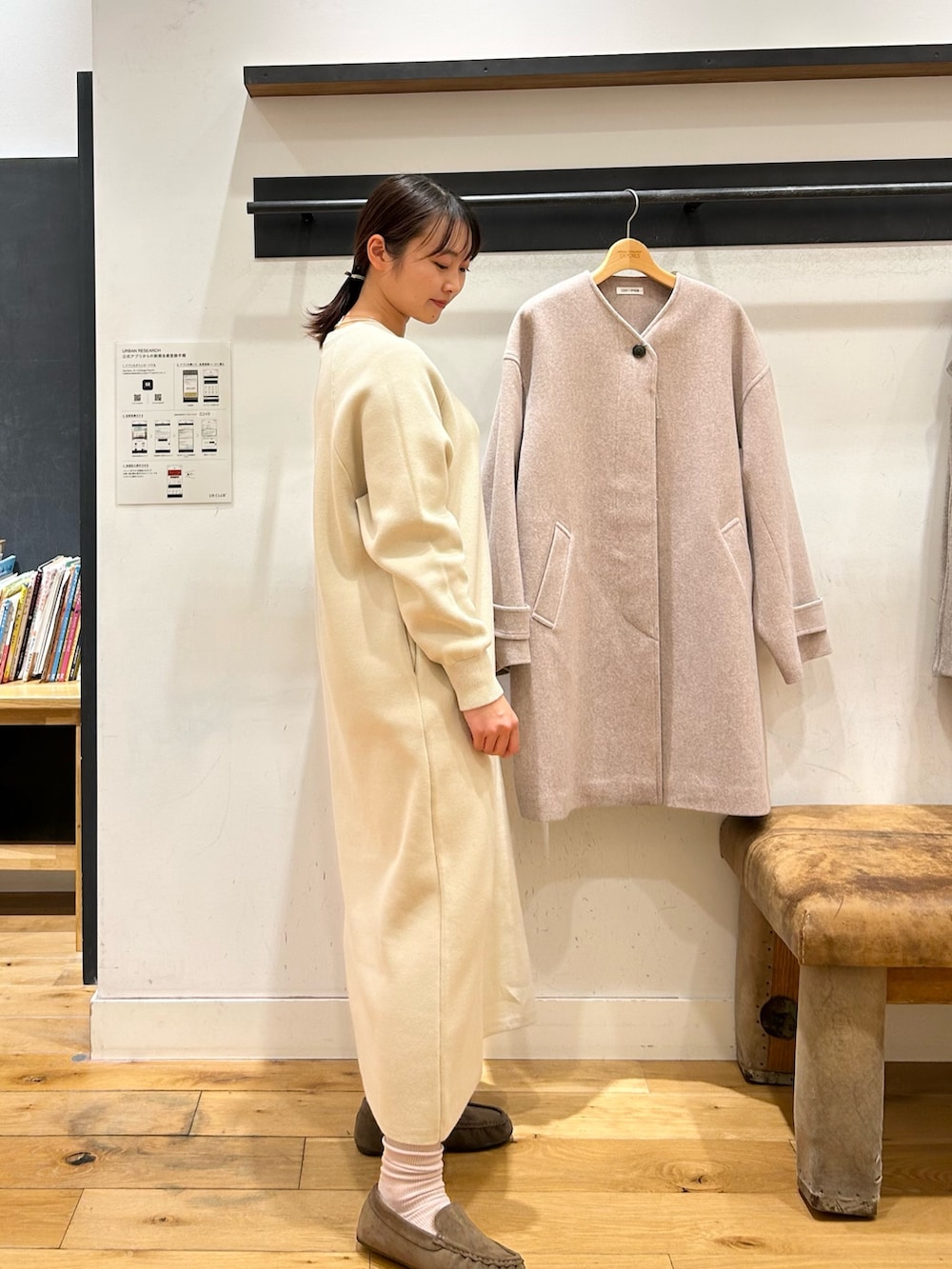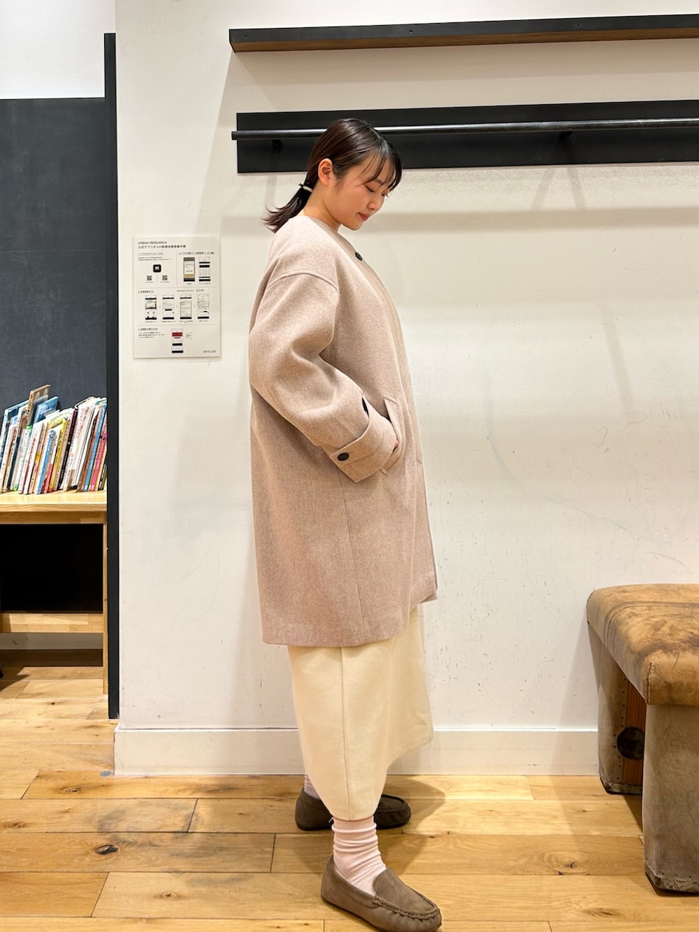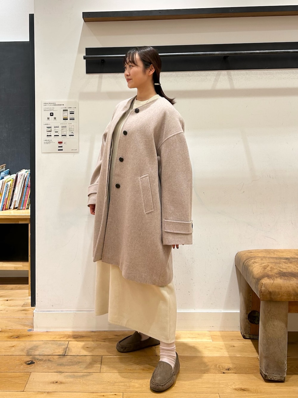 FORK&SPOONのウールノーカラーコートは、ベーシックに着こなしやすいコートです。ミドル丈の裏地付きコートとしては重さ軽めな印象です。