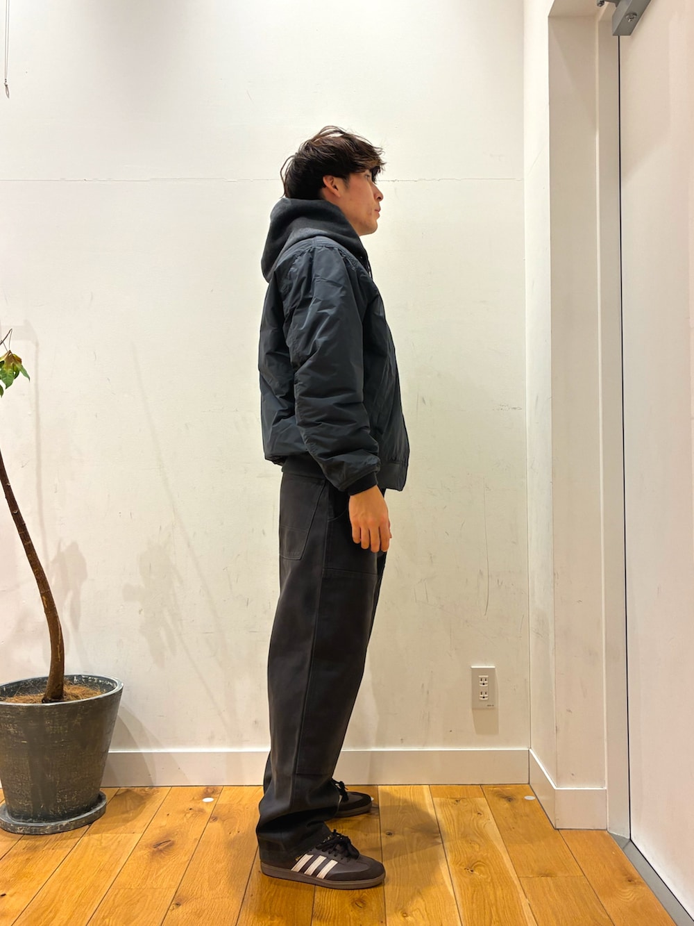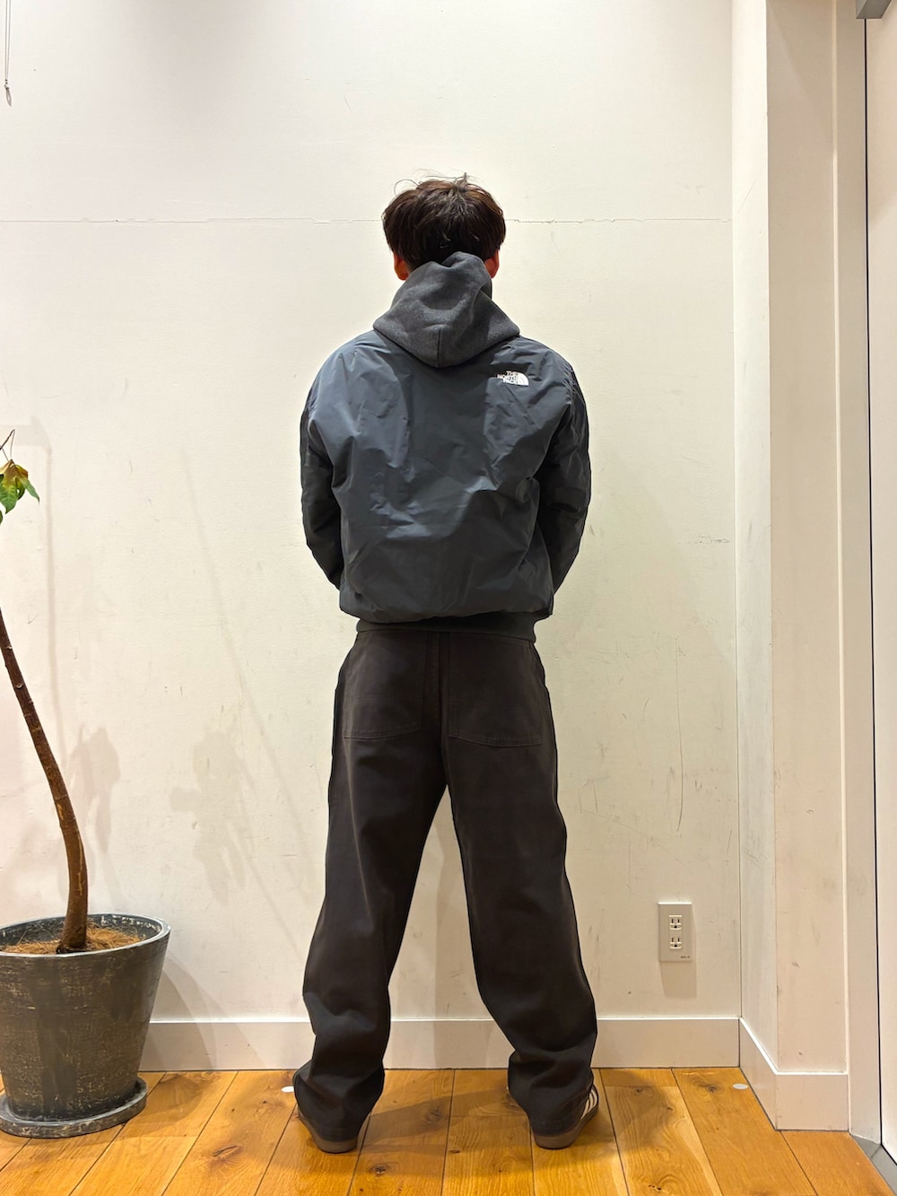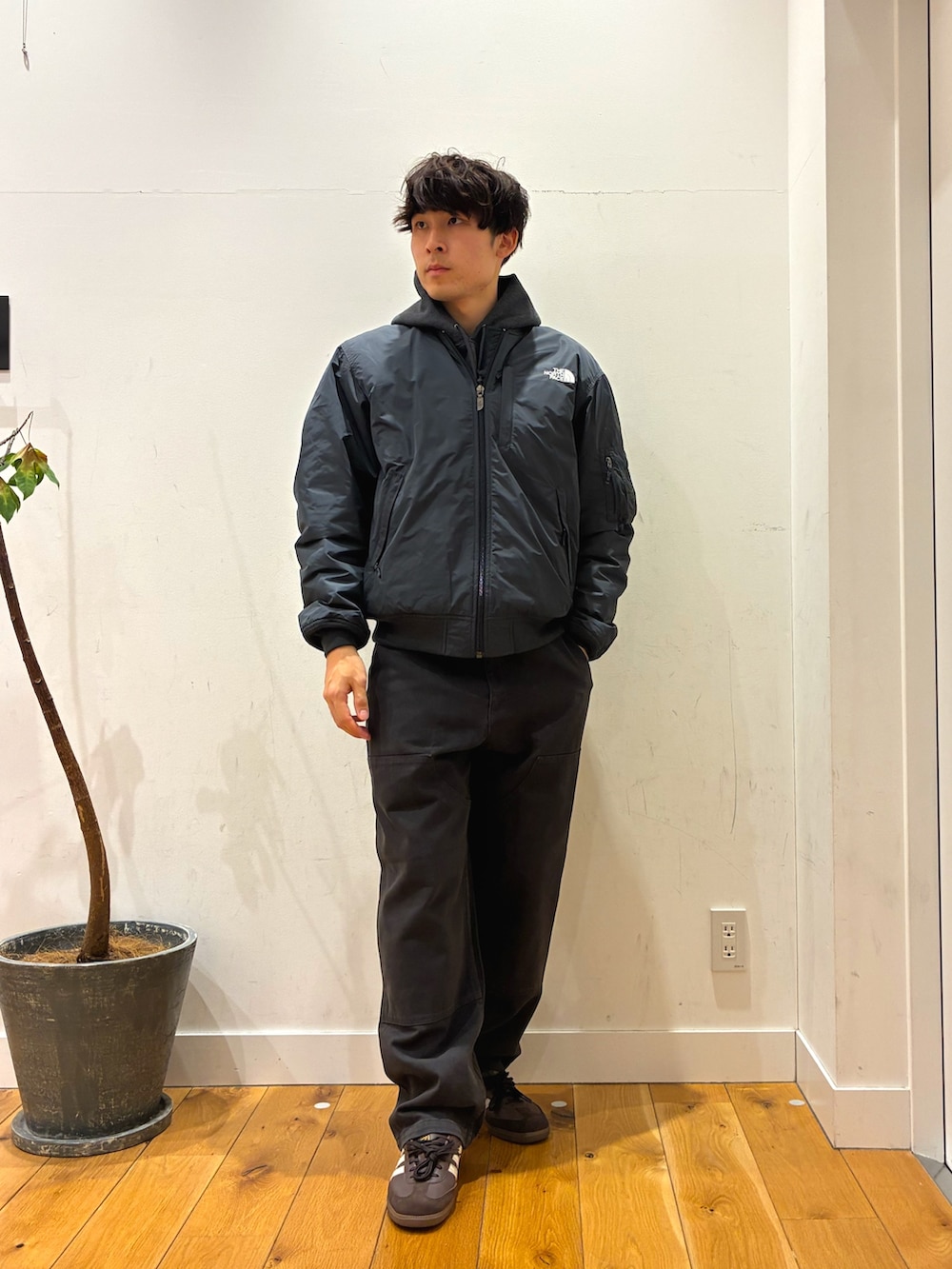 ゆったりとした黒のパーカーにとても暖かくポケットが多くついたノースフェイスのMA-1を合わせてみました!パンツは腰に紐がついていて調節ができるゆったりとしたカーゴパンツになっています!