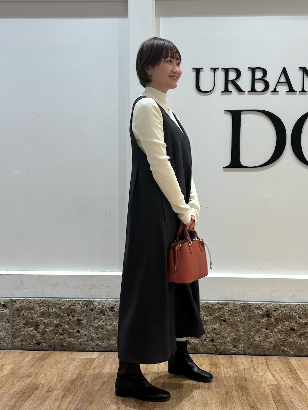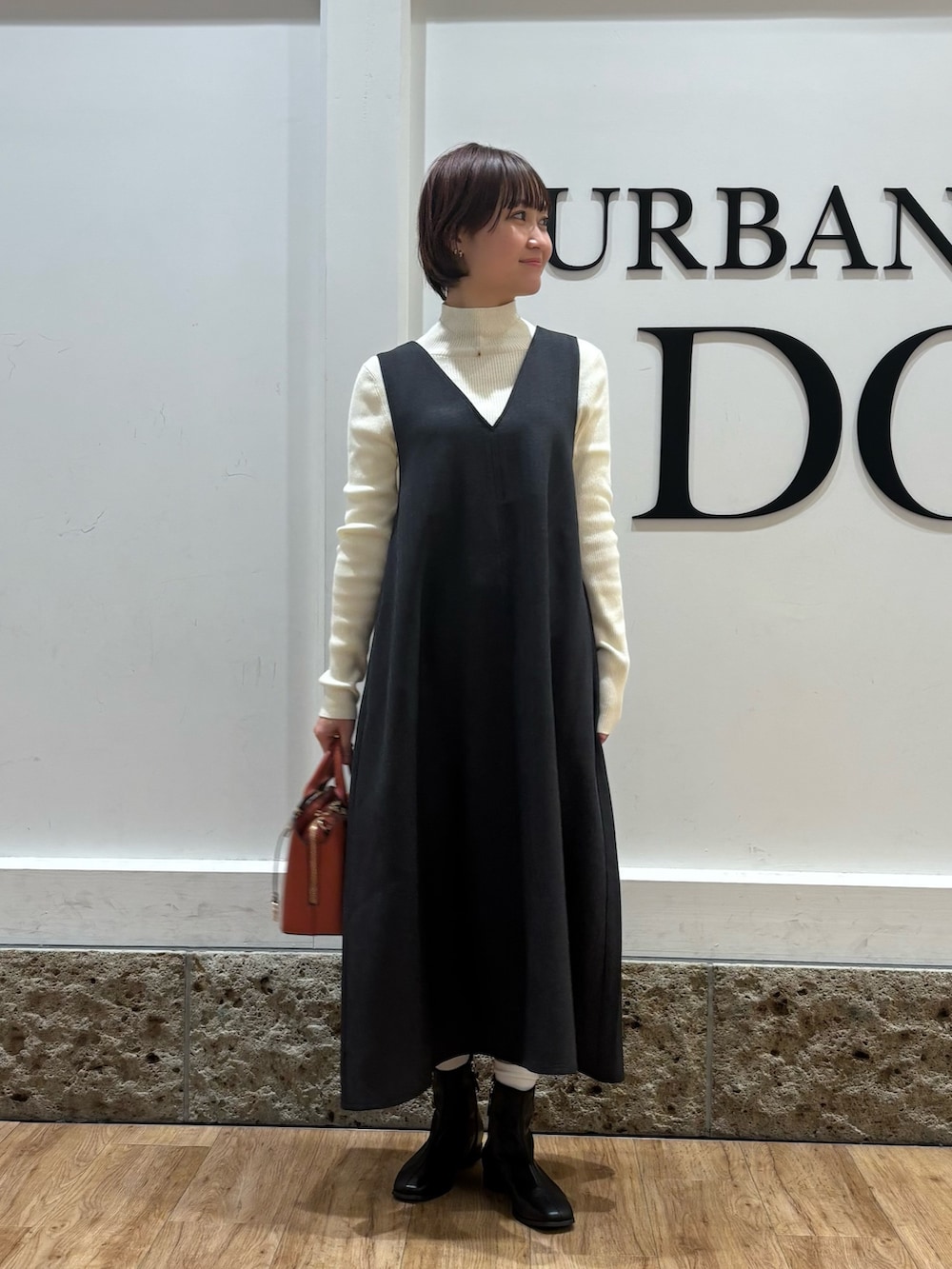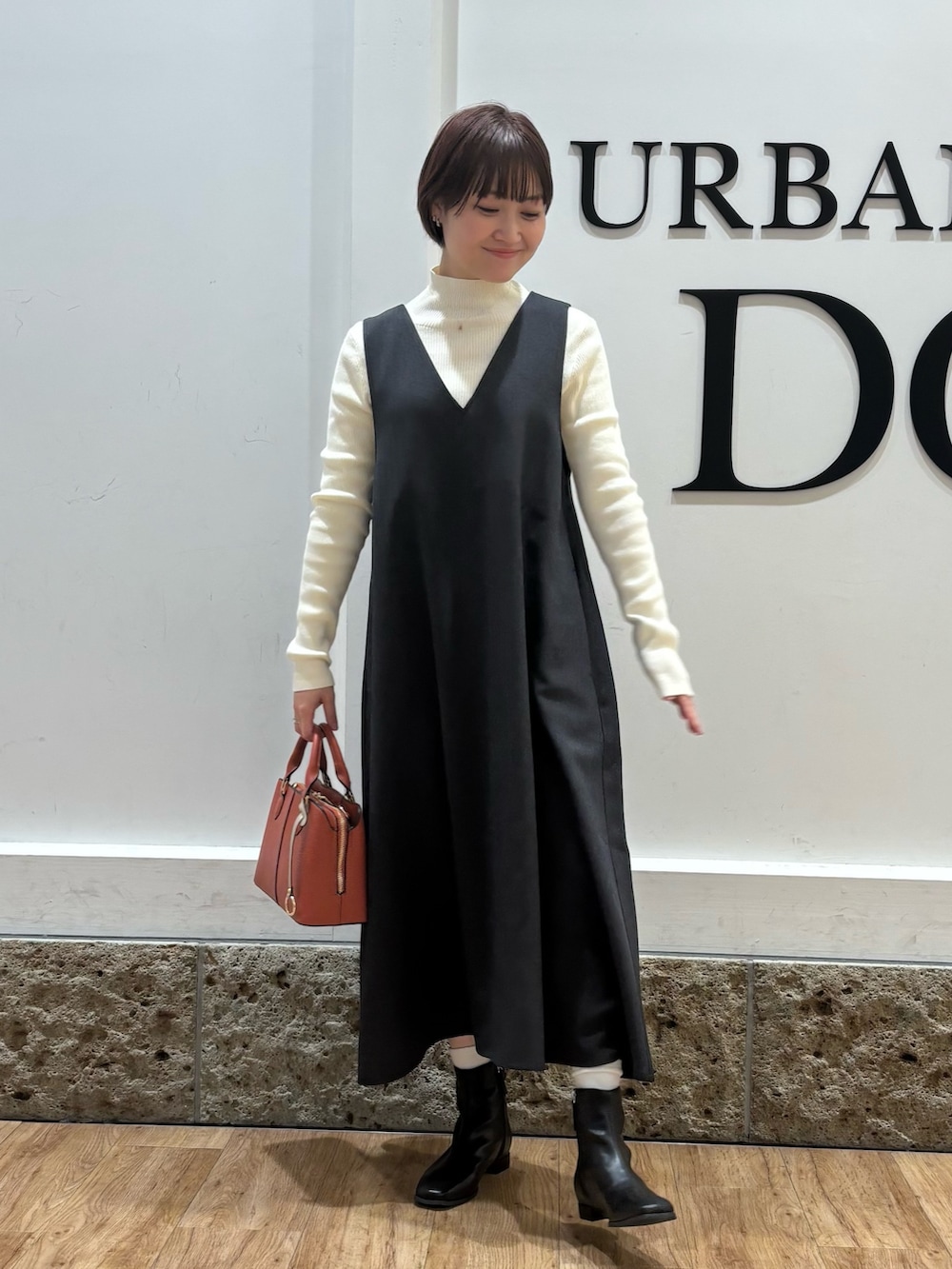 ジャンパースカート着用しました。158cmで脛あたりの長さです。胸元の深すぎないVラインがインナーの良さを引き立たせてくれますよ。
