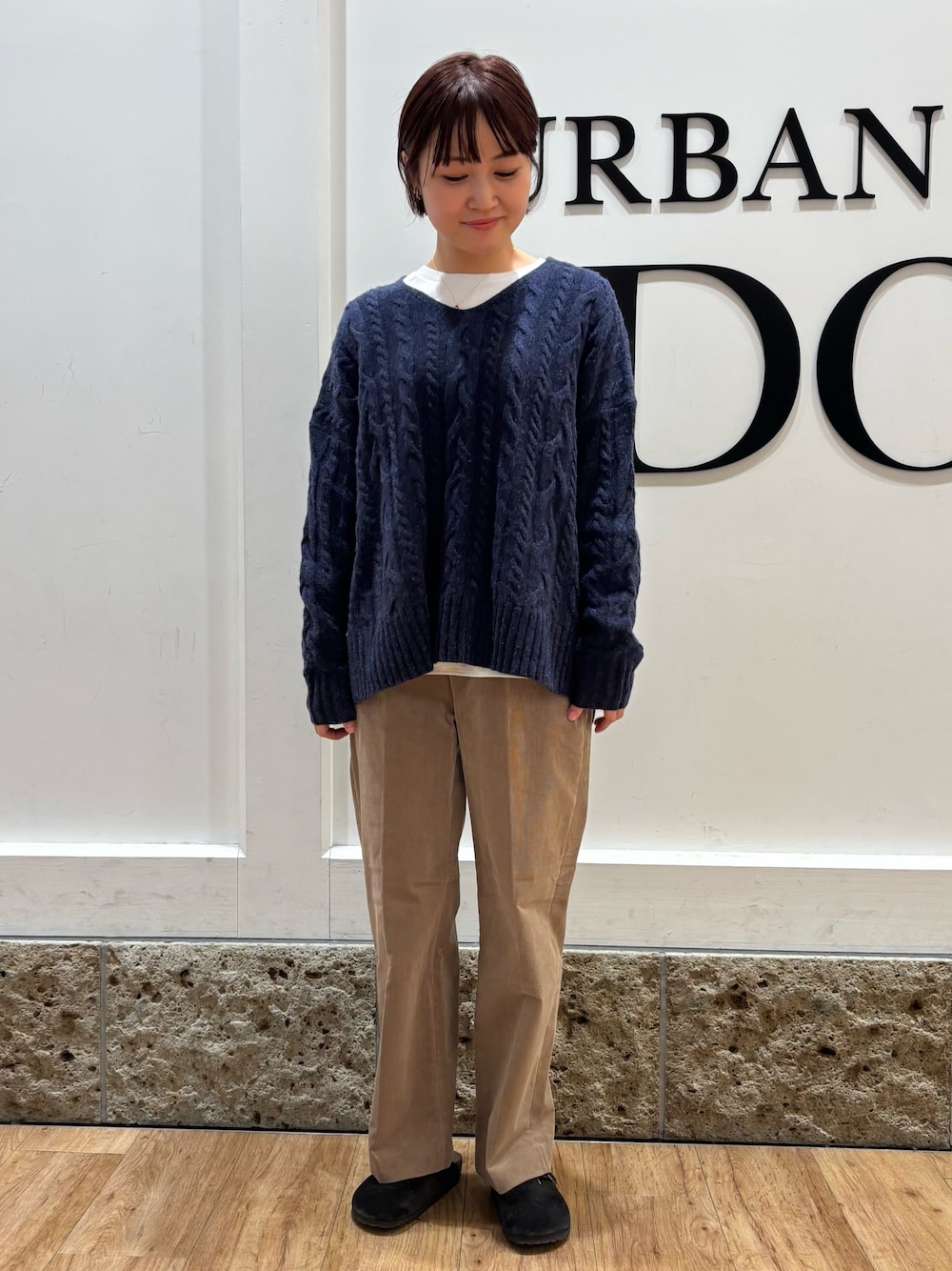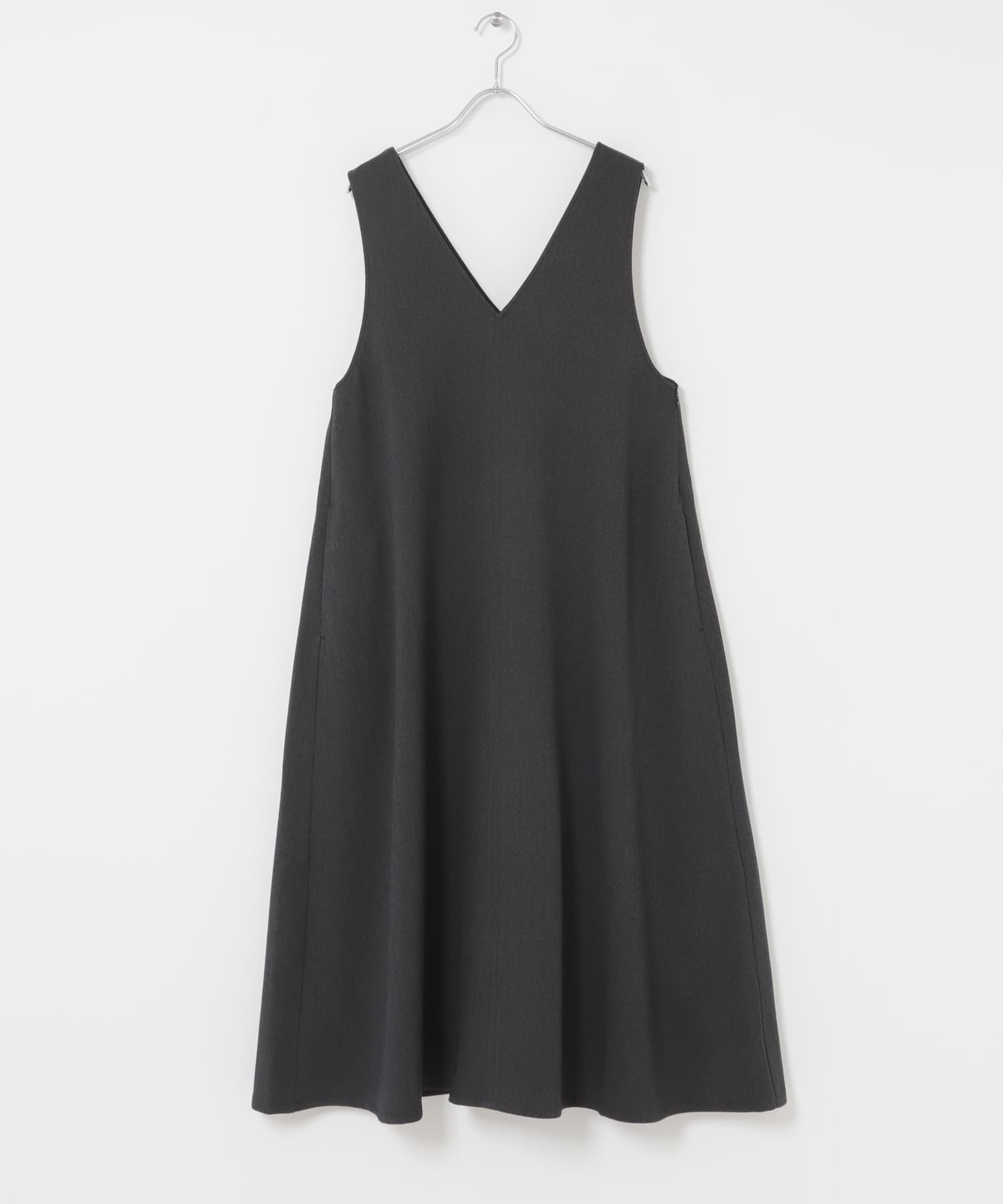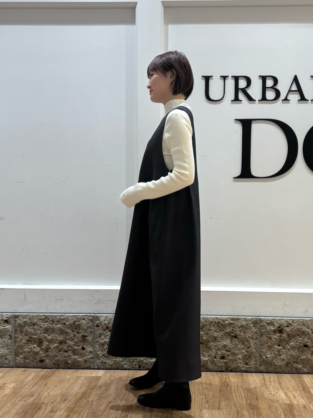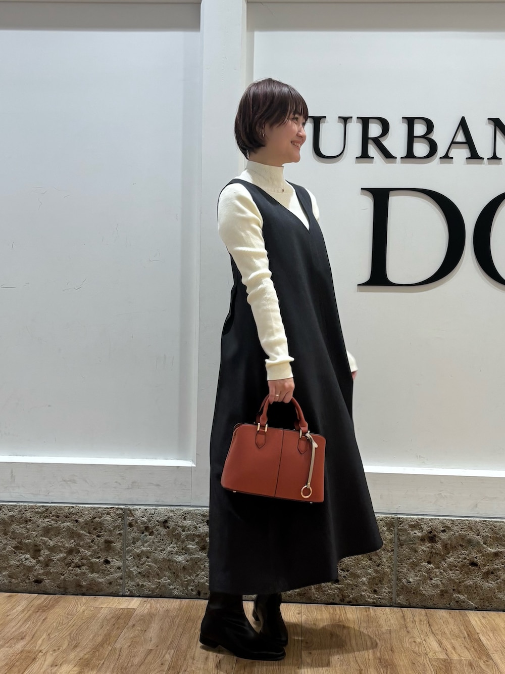 ジャンパースカート着用しました。158cmで脛あたりの長さです。胸元の深すぎないVラインがインナーの良さを引き立たせてくれますよ。