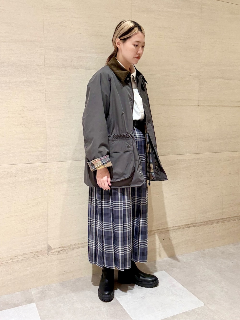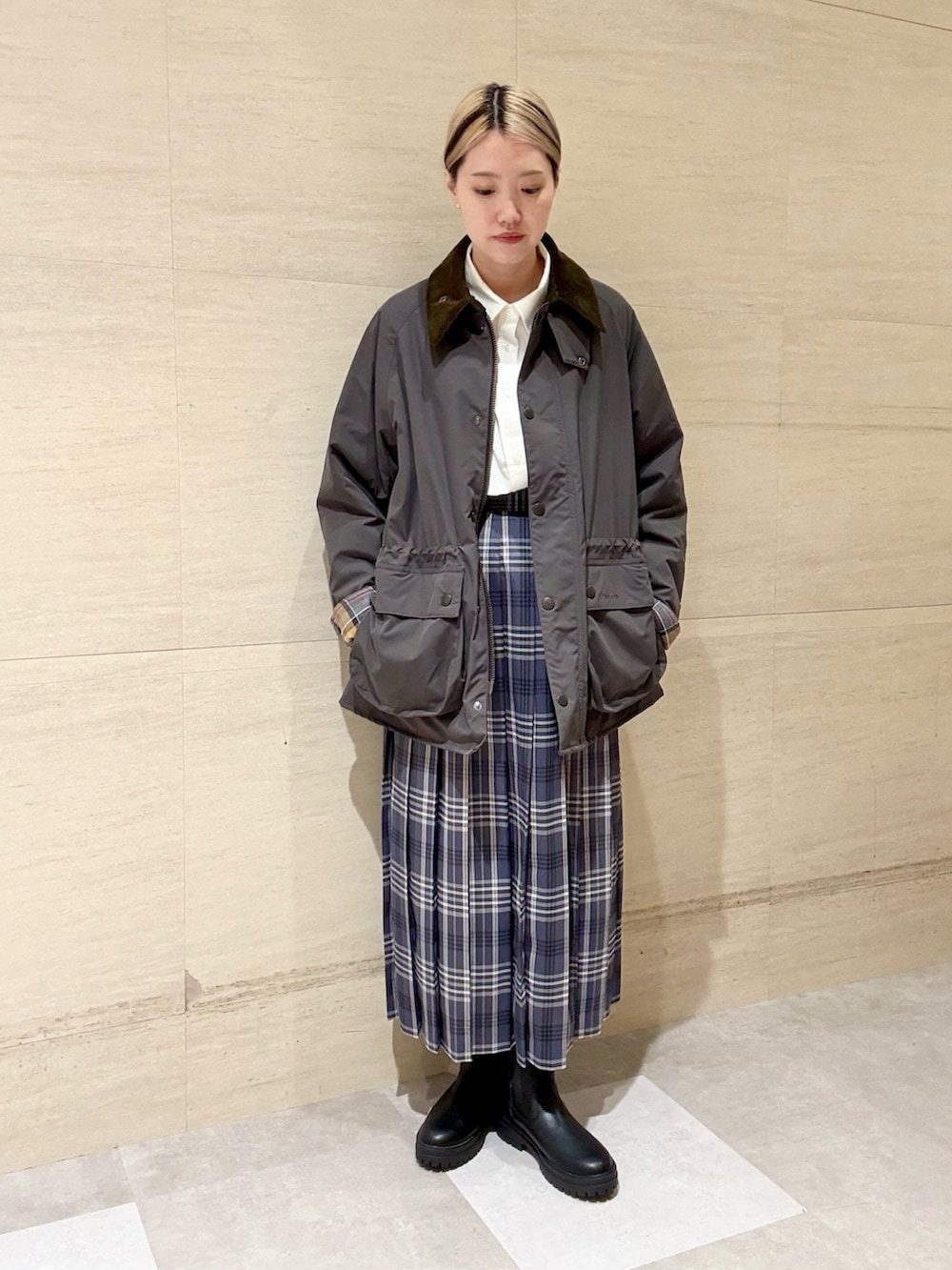 Barbourの存在感が強いのでトップスはシンプルなシャツで、キレイめスタイルにしてみました。