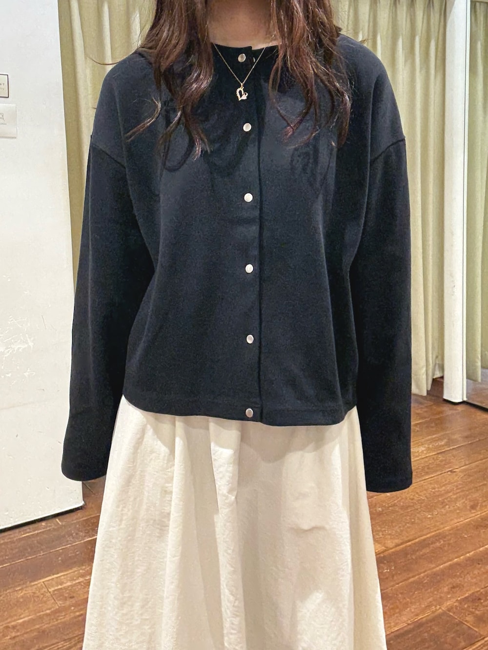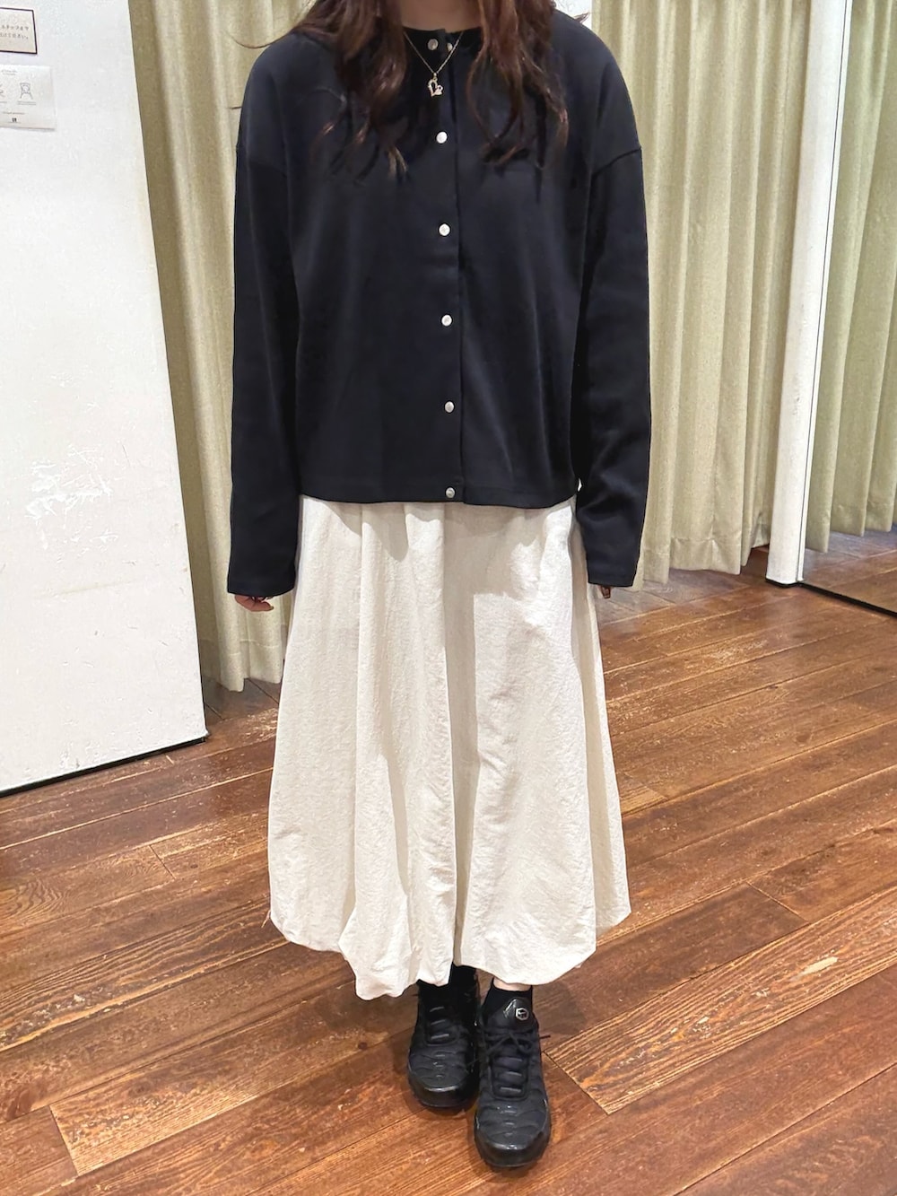 中に着用しているカーディガンは、コットン生地でロングシーズン着ていただけます。コンパクトでカジュアルすぎないデザインなのが可愛い一枚です!