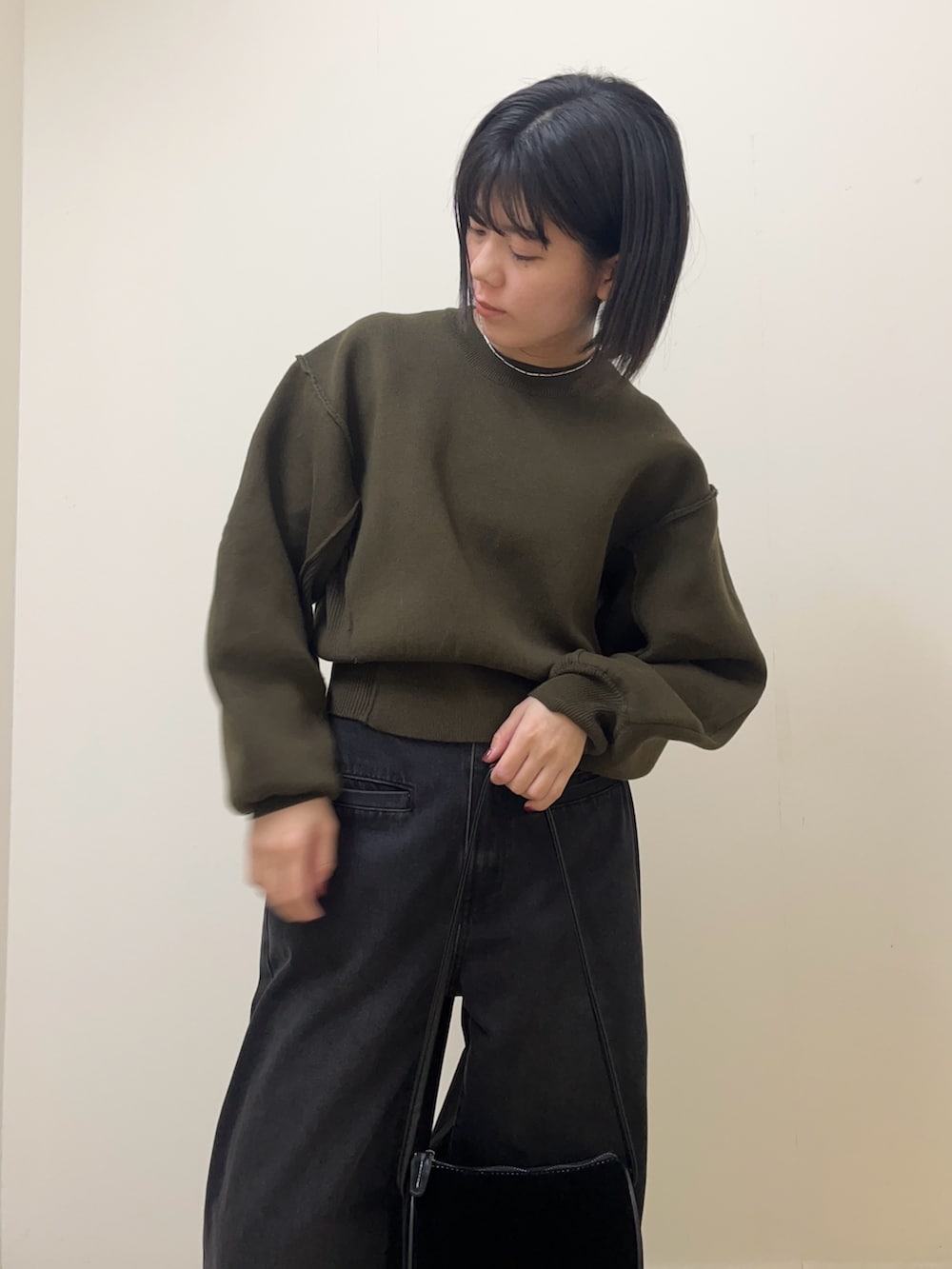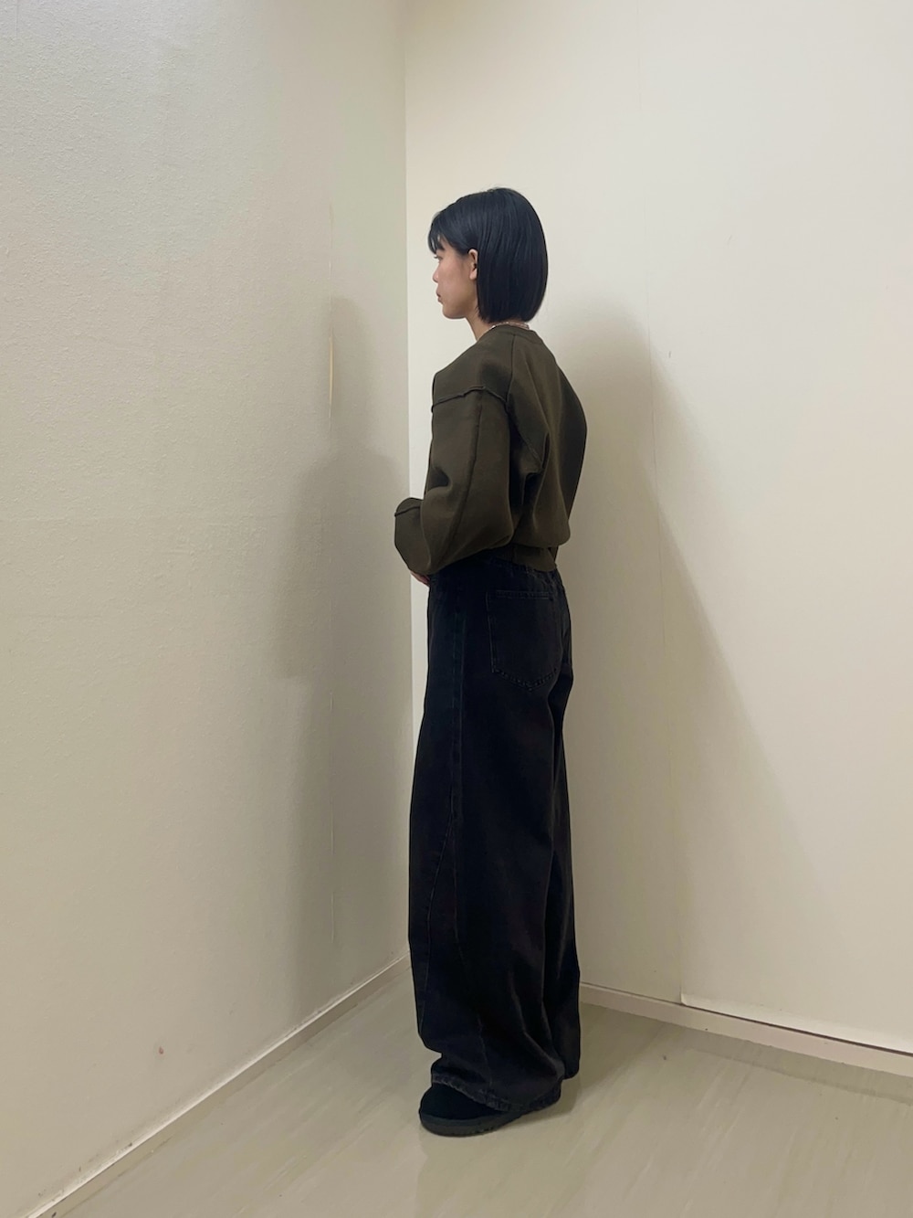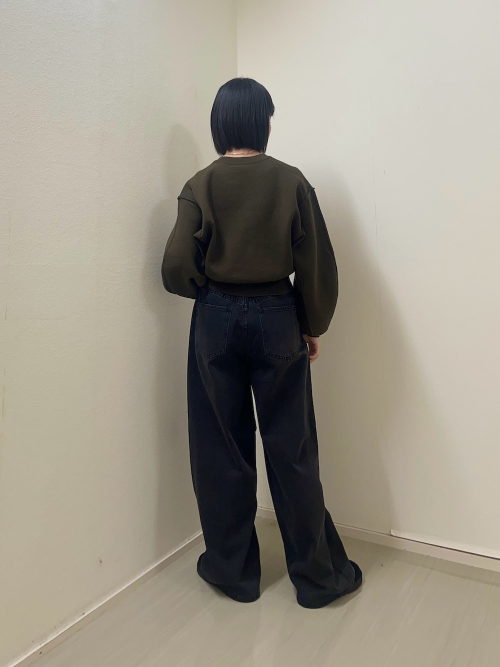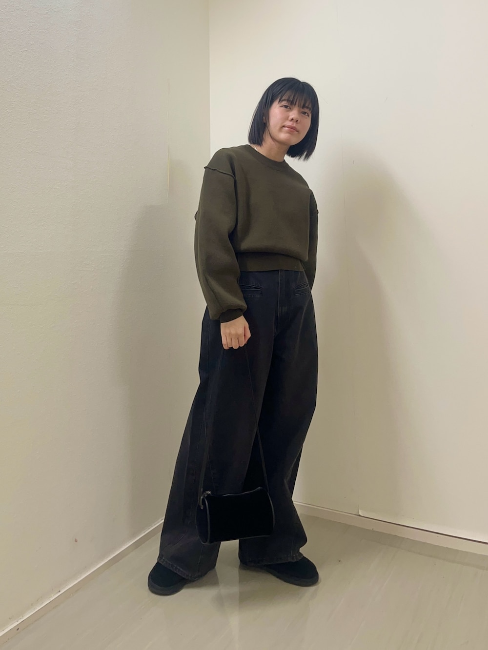 ショート丈のスウェットライクニットに下にボリュームのあるデニムでスタイルアップコーデです✨️