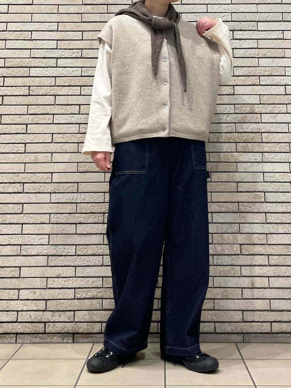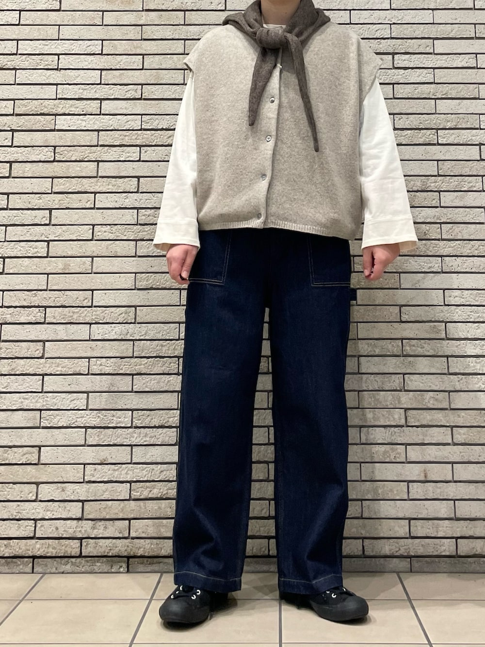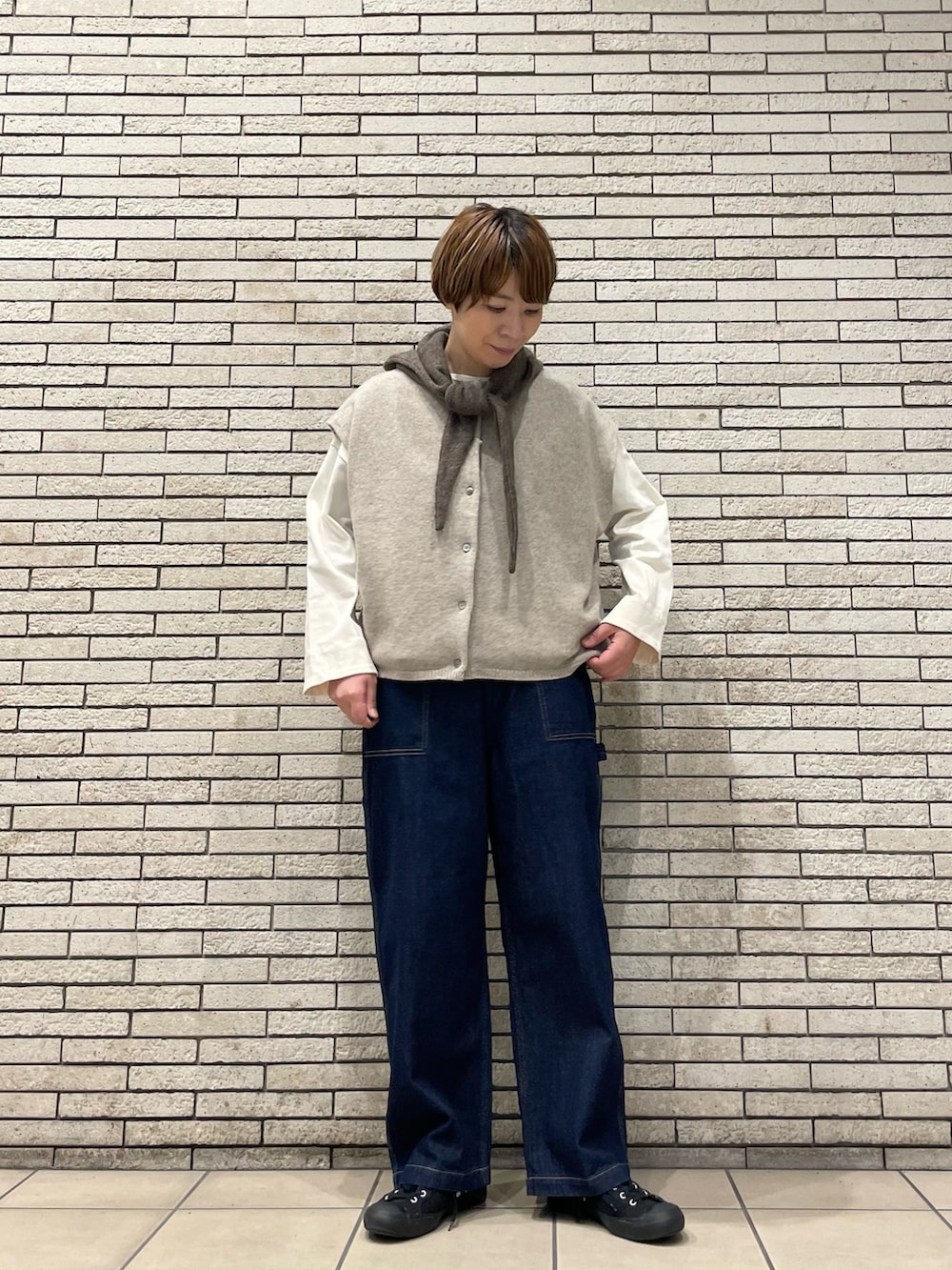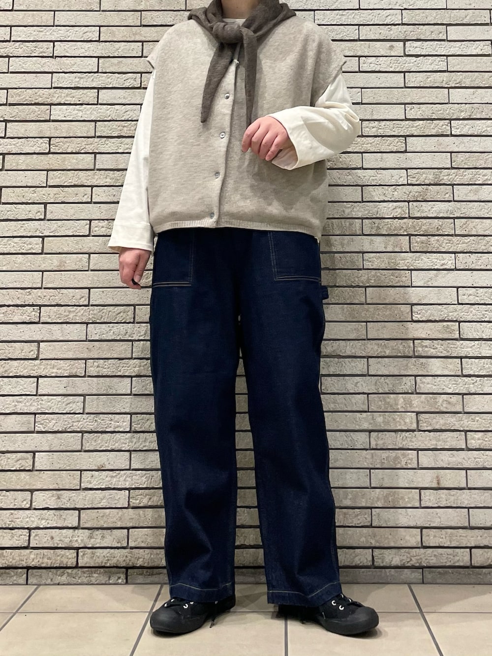 トップスはナチュラルな色合いでまとめて、フードマフラーを使ってアクセントに。