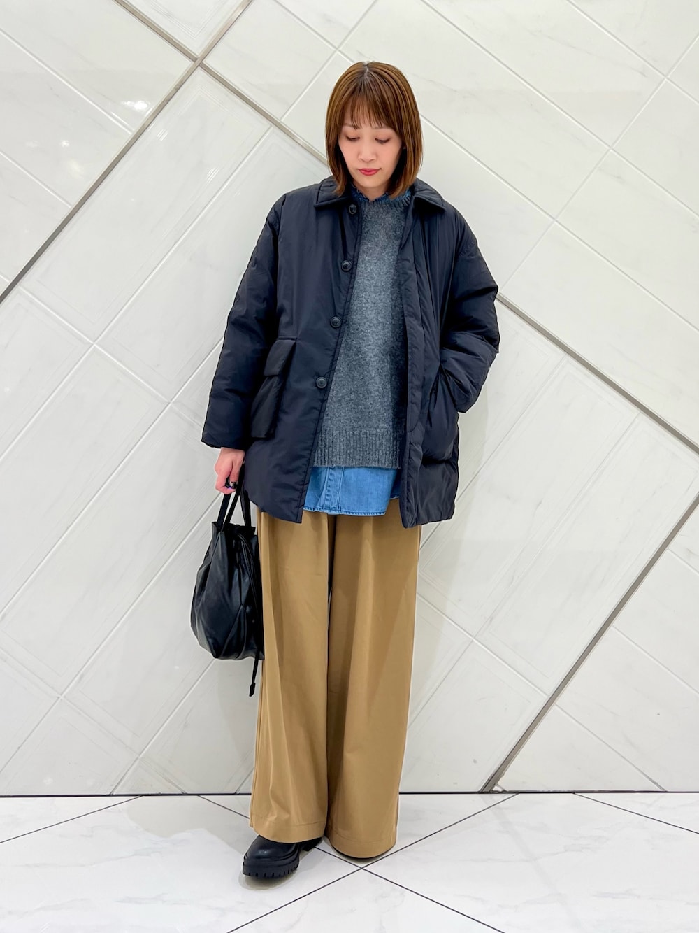 ニットはハイネックでゆとりのあるサイズ感ながらもすっきりと着ていただけます。