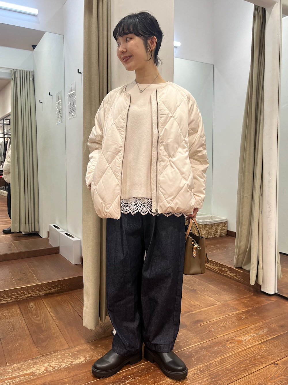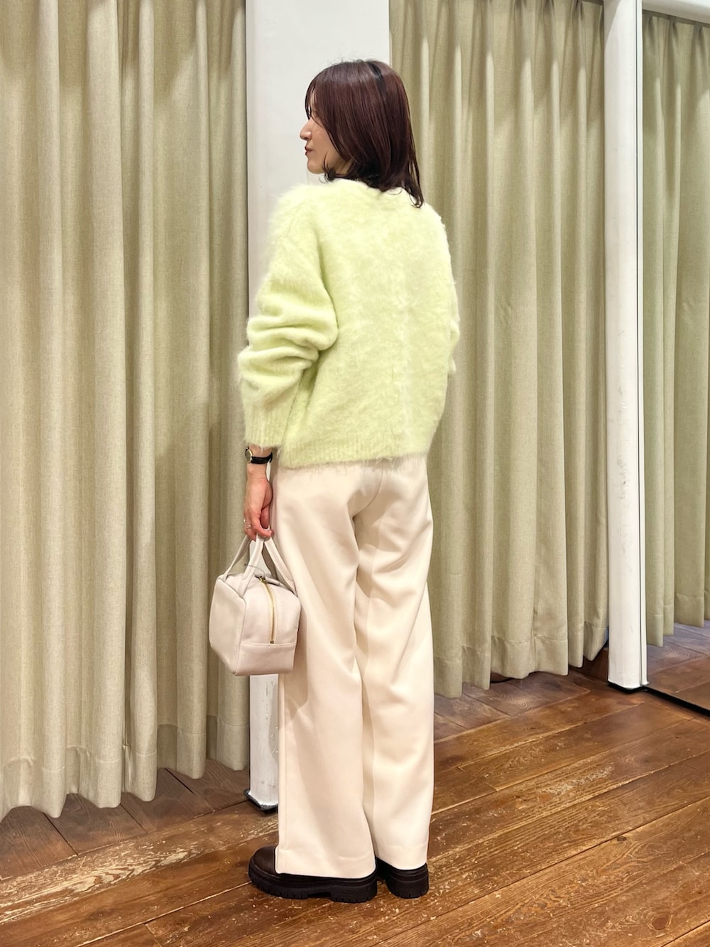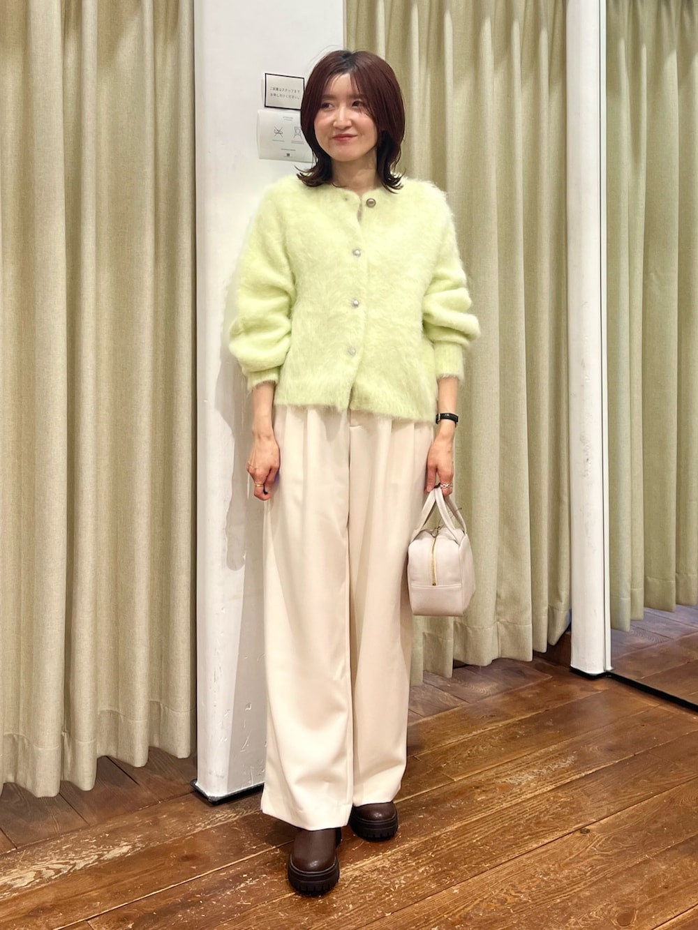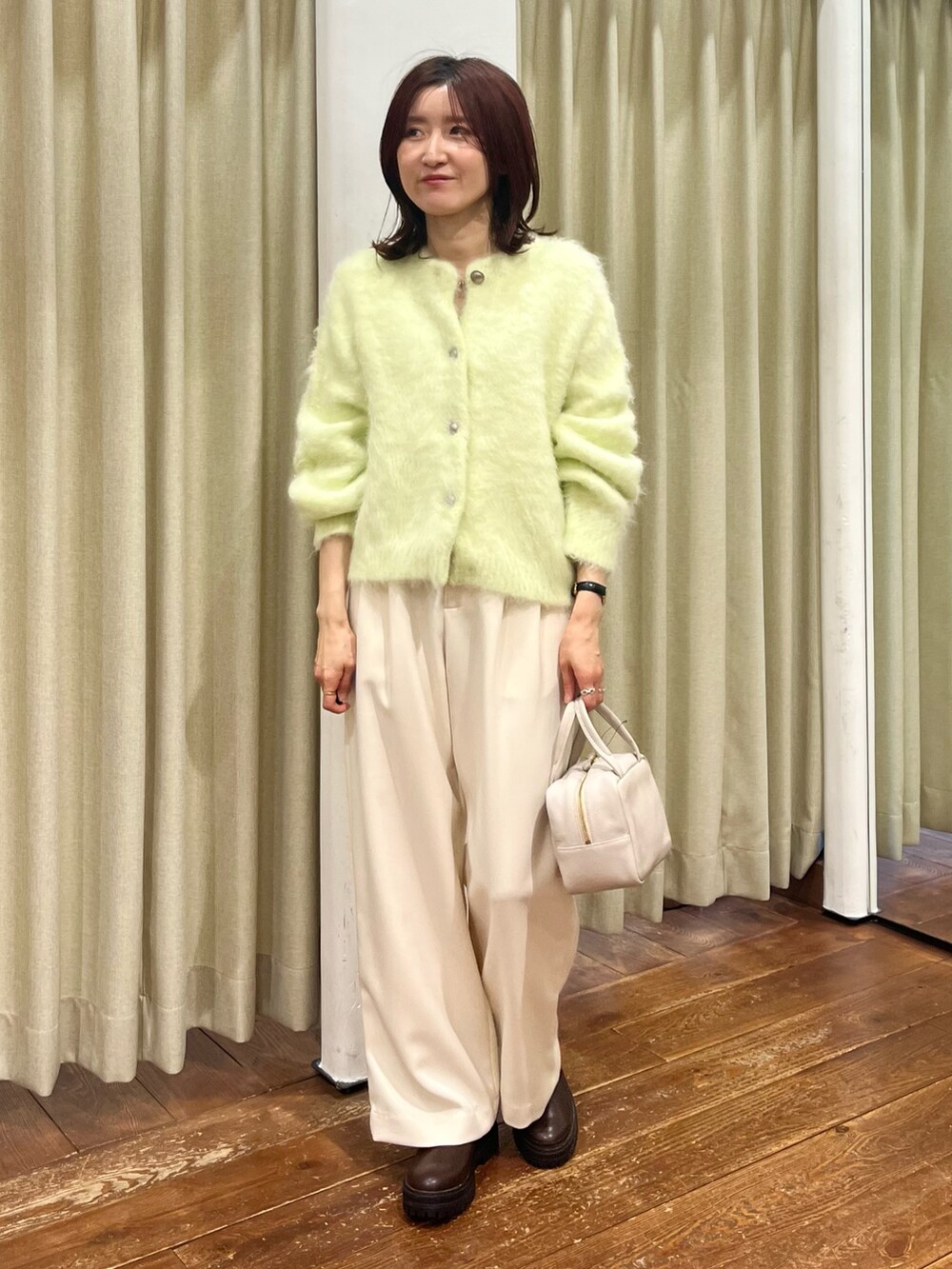 合わせたトップスはカラーが可愛いカーディガンでボタンを留めてトップスとして着るのもおすすめです。