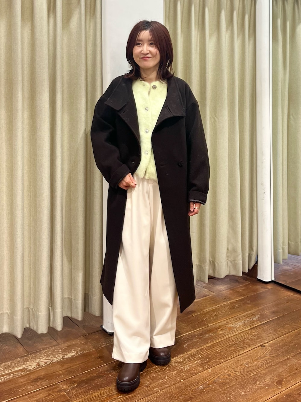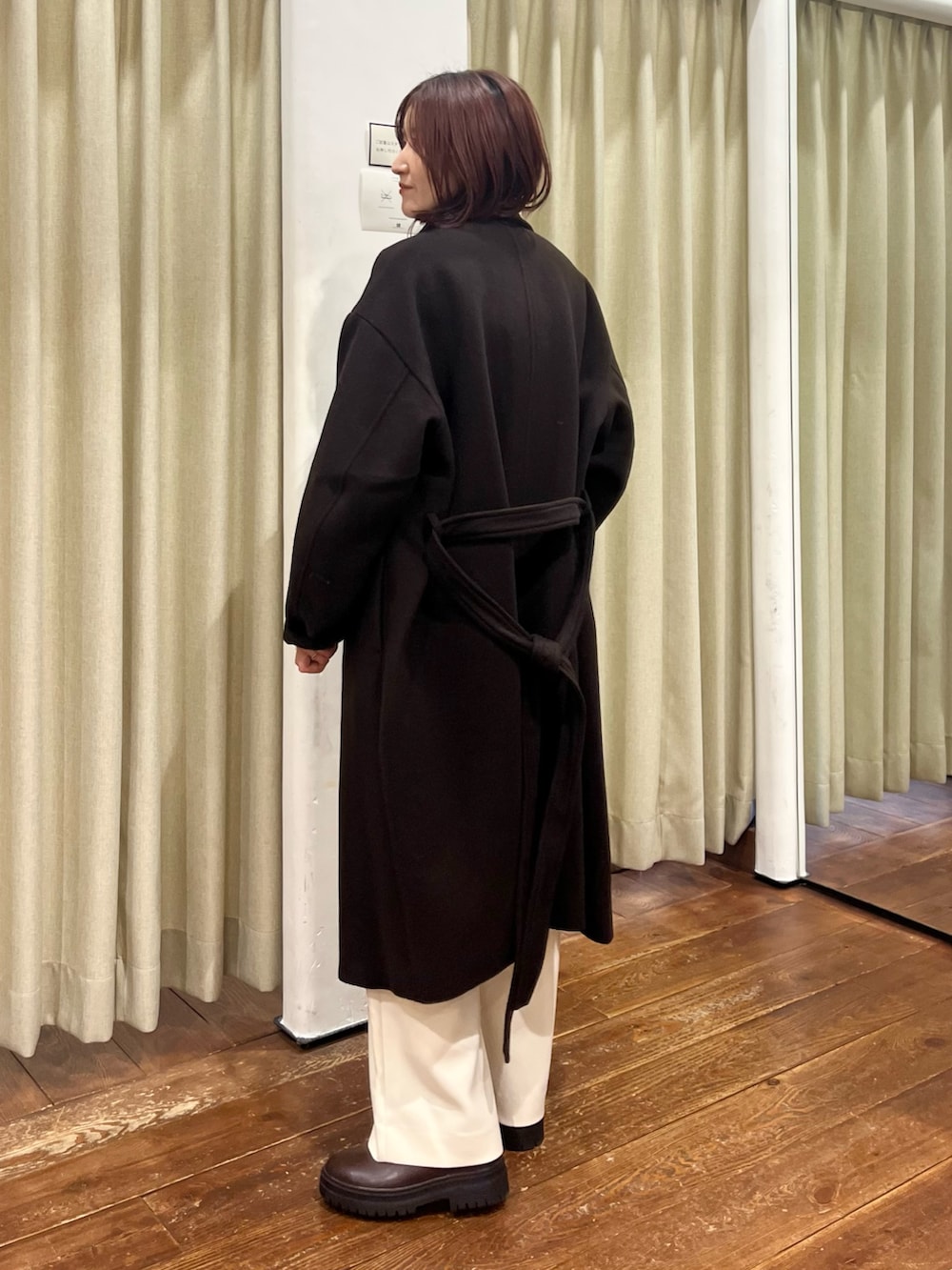 コートはスーパー100のウール糸を使っているのでロング丈でも軽い着心地ですがあたたかいです。裏地もしっかりついています◎