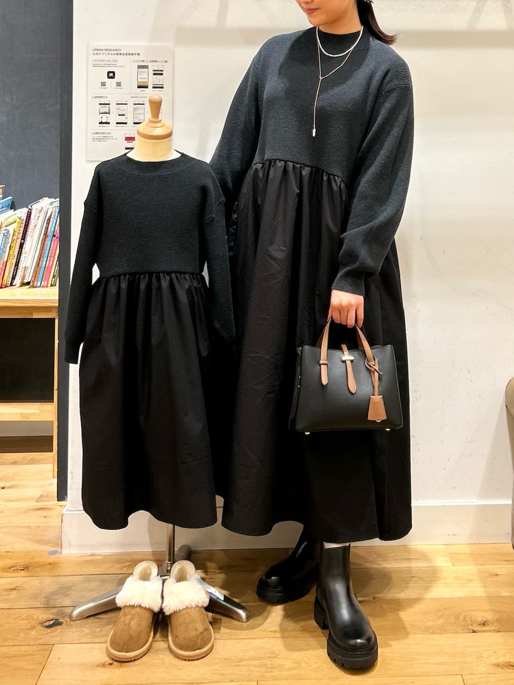 ニットドッキングワンピースは、レディースとキッズサイズ両方で展開されているリンクコーデアイテムです。色もお揃いにするならブラックがおすすめです💁♀️一着で異素材を組み合わせたオールブラックコーデが完成するので、とことん楽な着心地でもおしゃれを楽しめます。