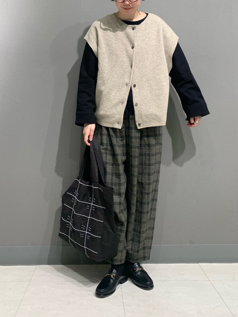 チェックの色味がさり気ないパンツ。主張しすぎない色味が◎ゆったりとしたテーパードのサイズ感が丸いシルエットでかわいいです。厚手過ぎず軽い履き心地です。