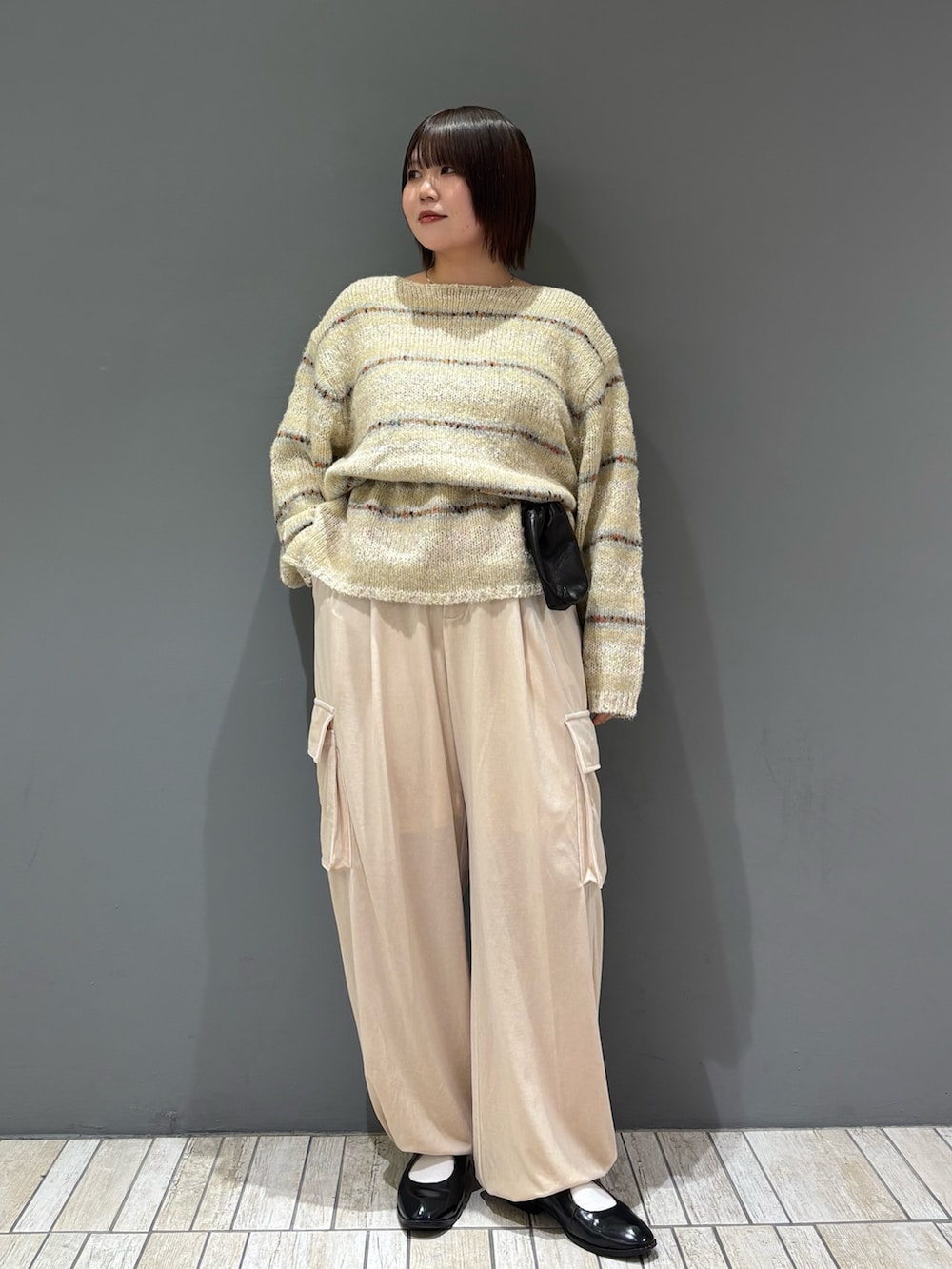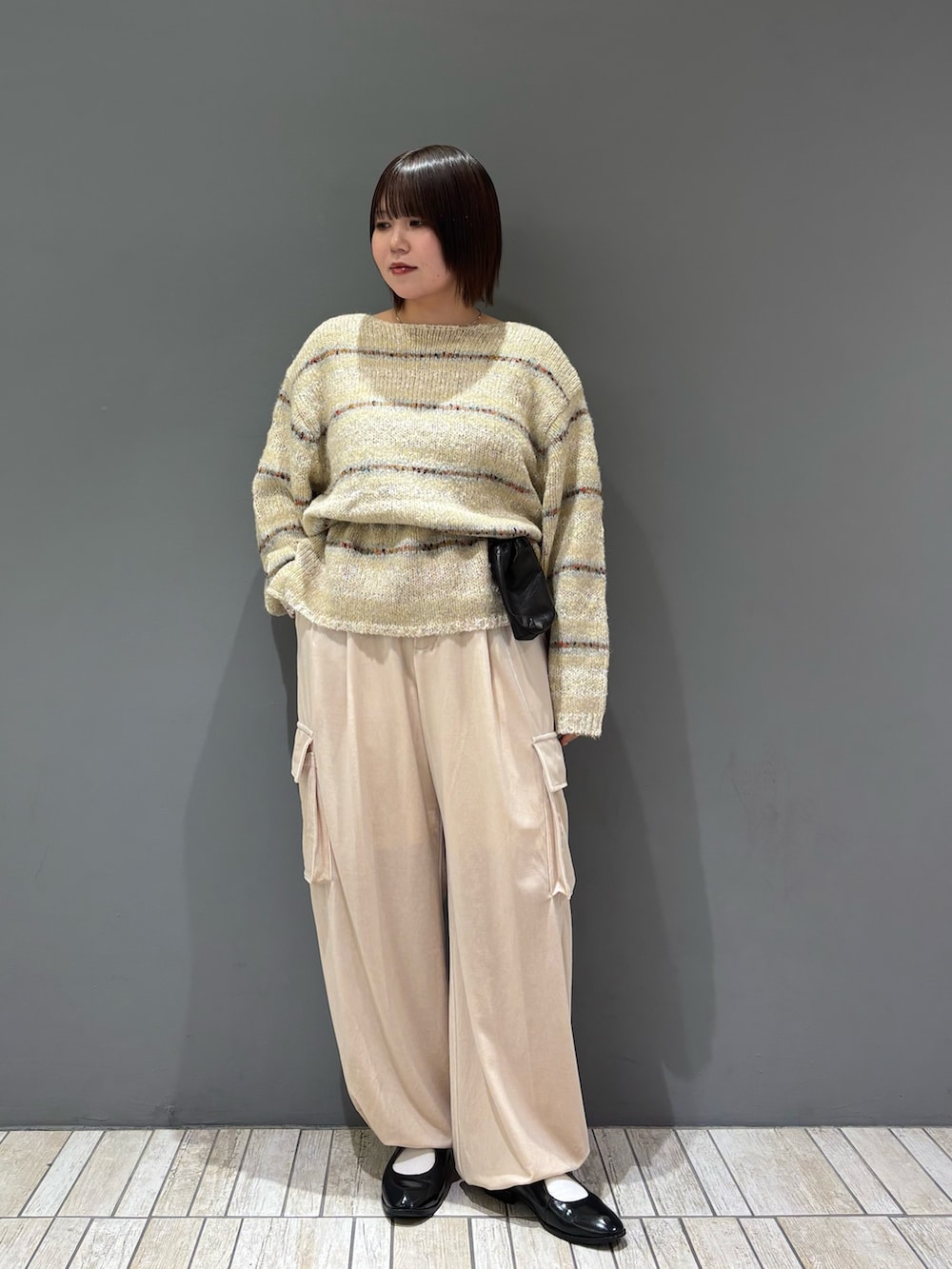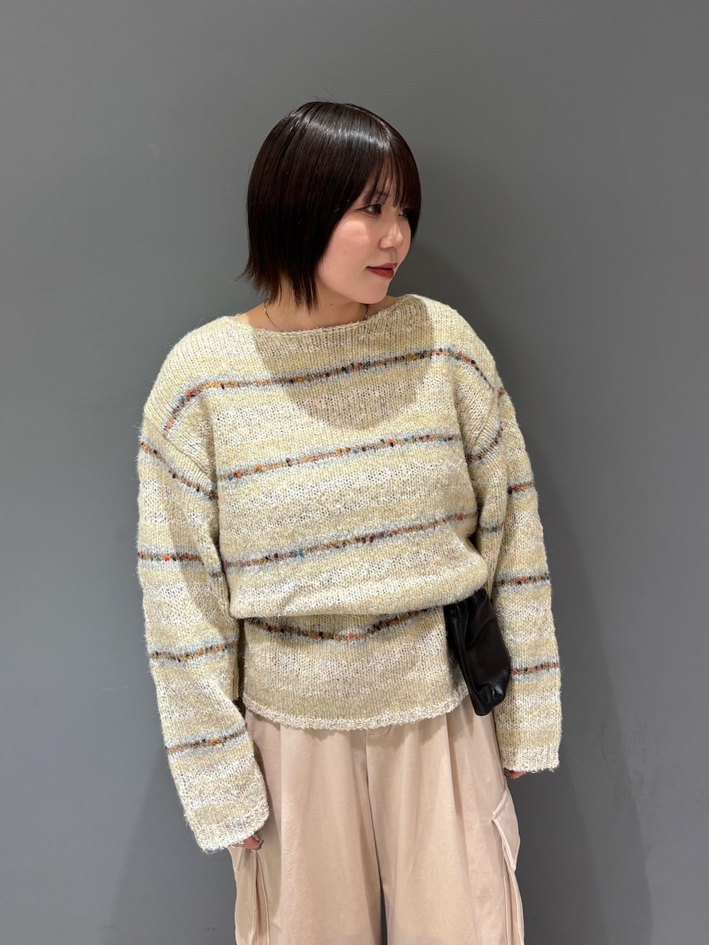 ・オーバーサイズのニットなので、ポーチをベルト代わりにしてウエストマーク!