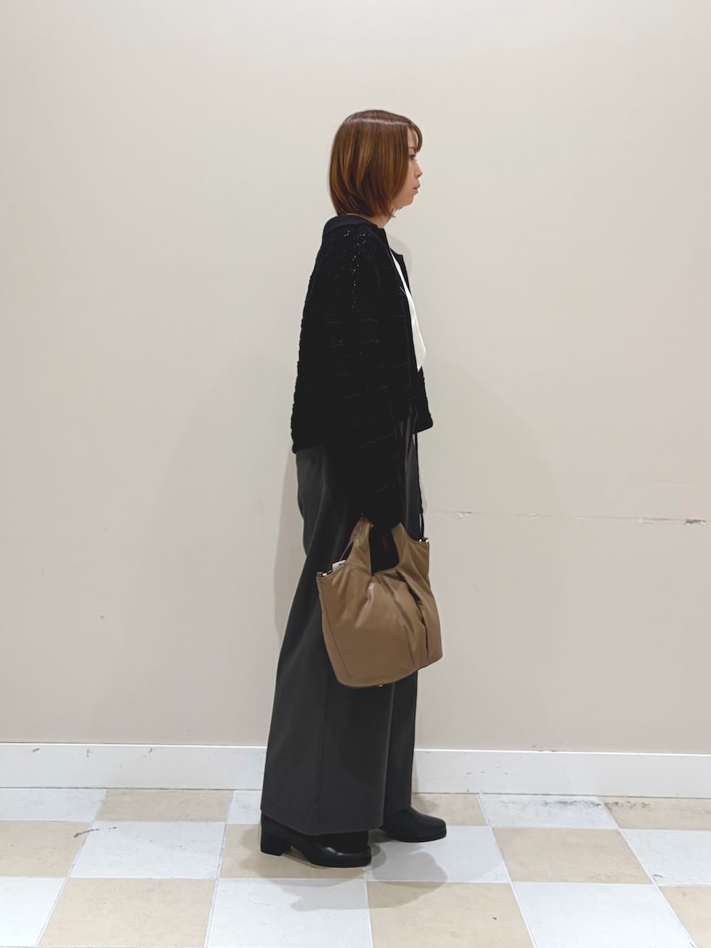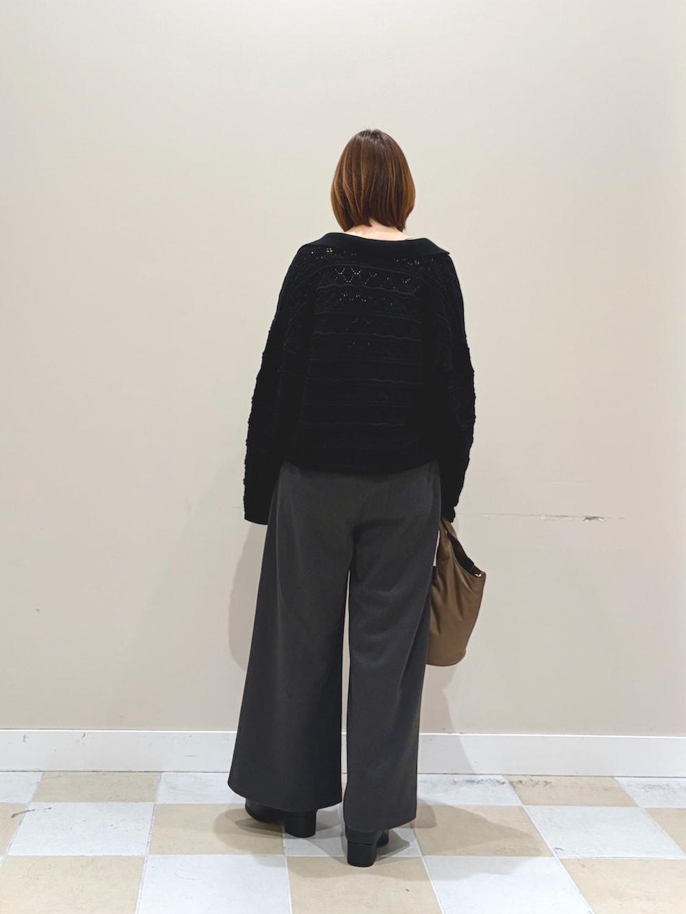 ショート丈の透かし編みニットカーディガンにアシメのベルトがポイントのワイドパンツでコーディネートしました!