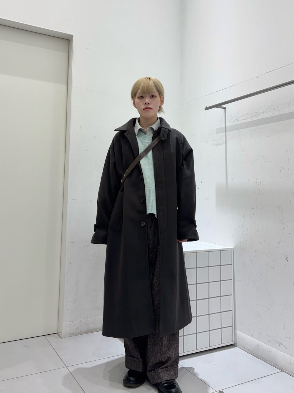 茶系ベースに青系の小物を使っているコーデになります。