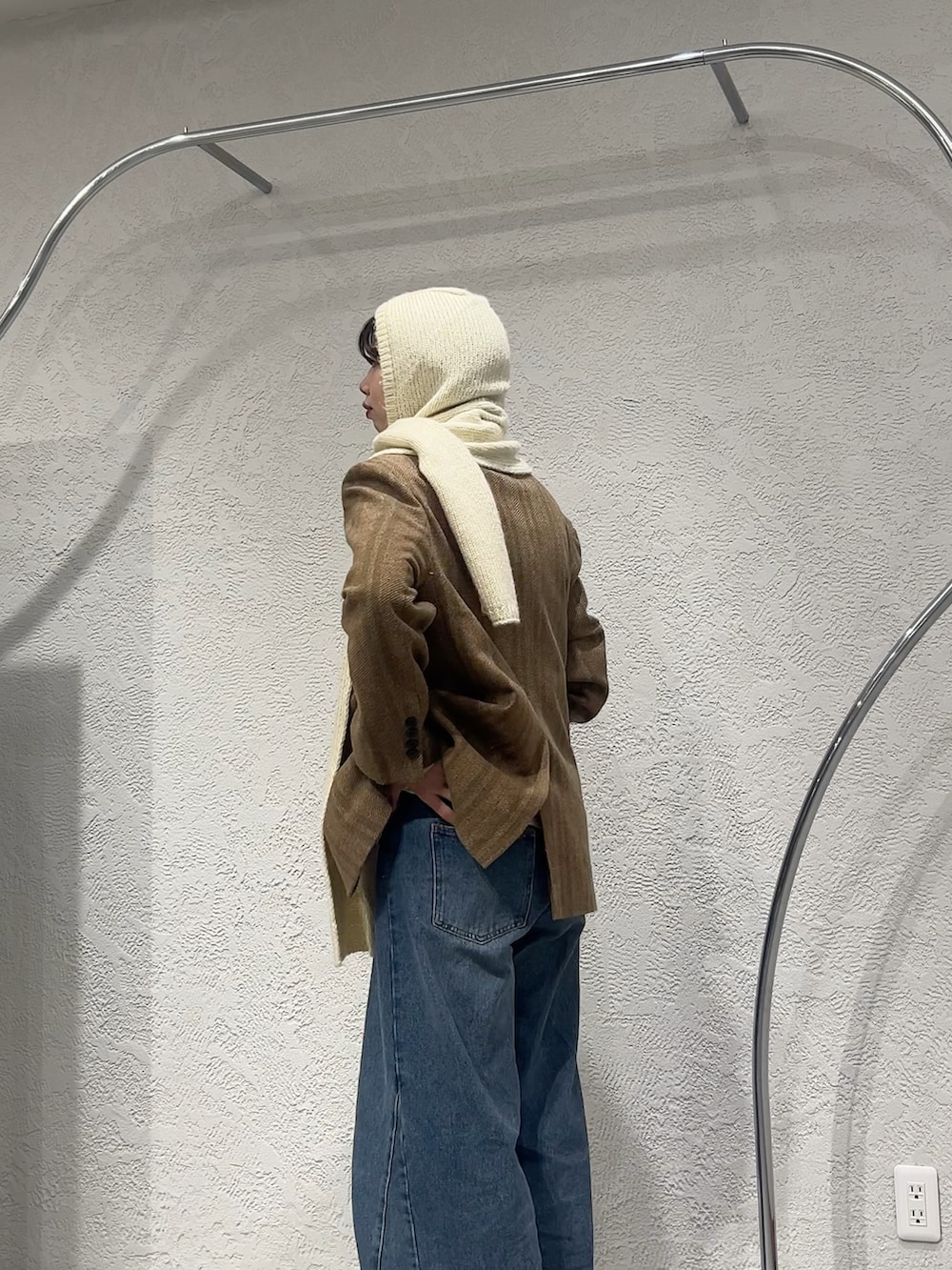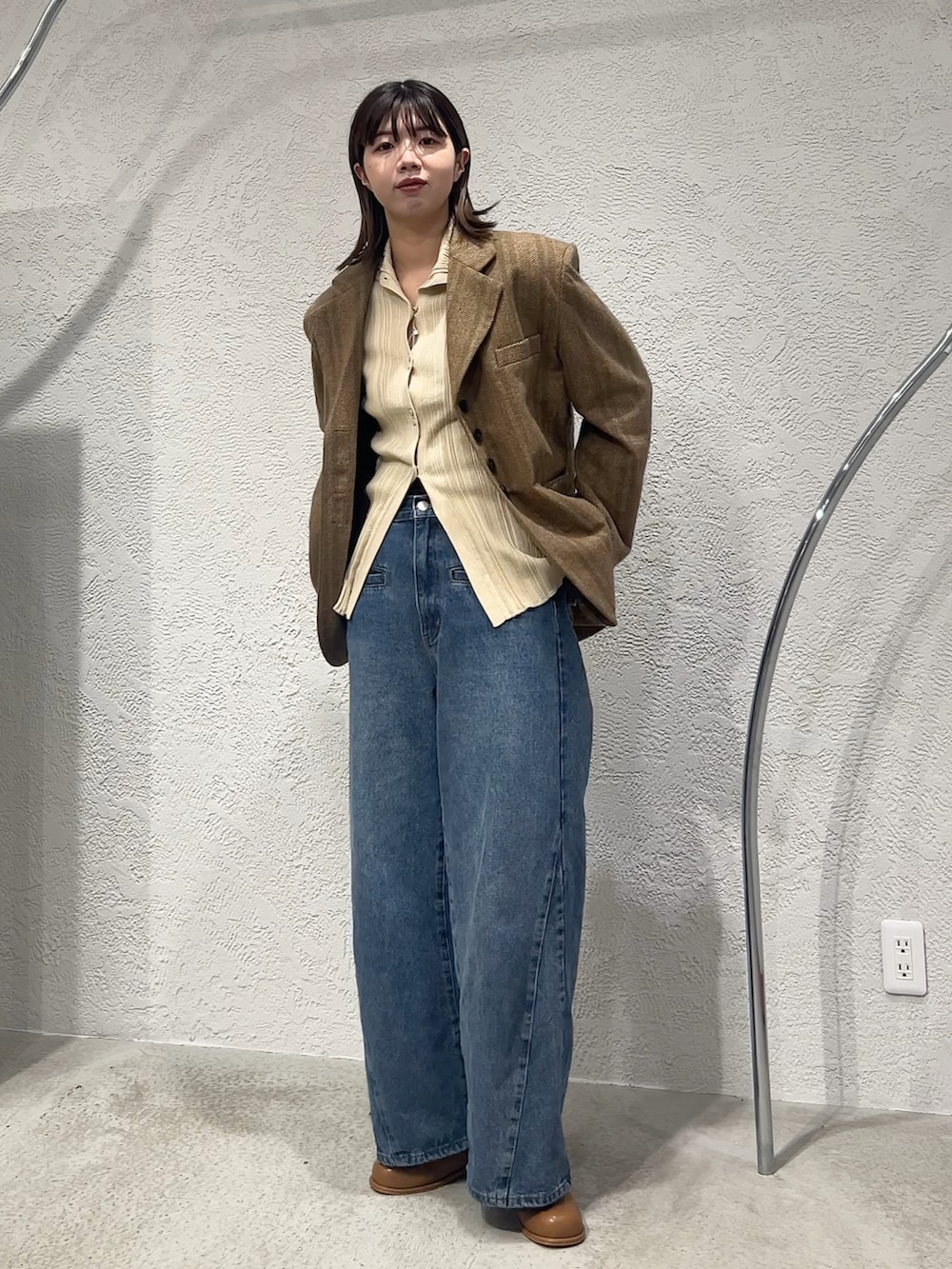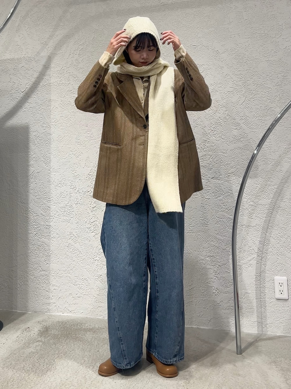オーバーサイズでの着こなしが可愛いジャケットにマフラーとデニムを合わせた大人カジュアルコーデです!