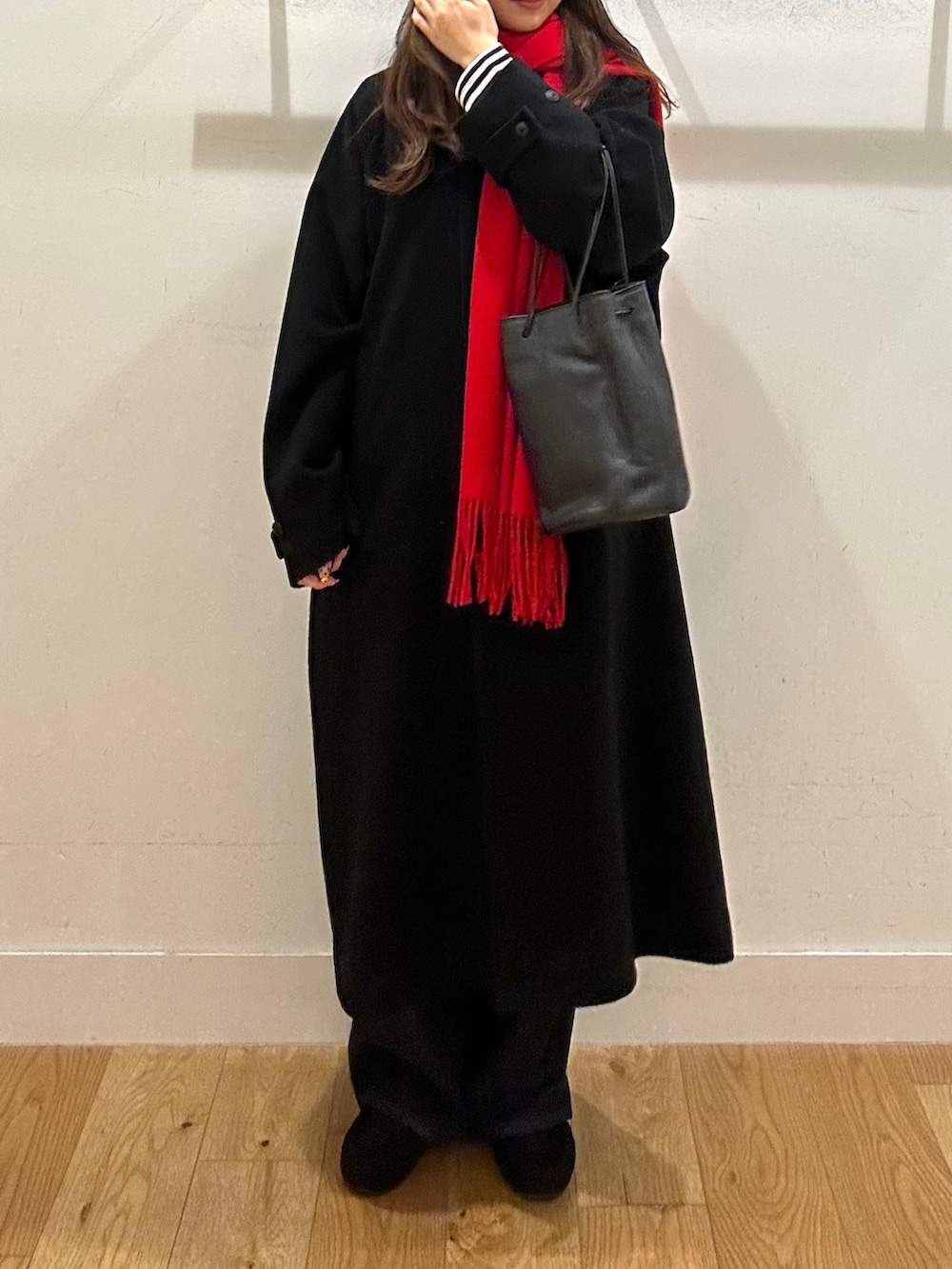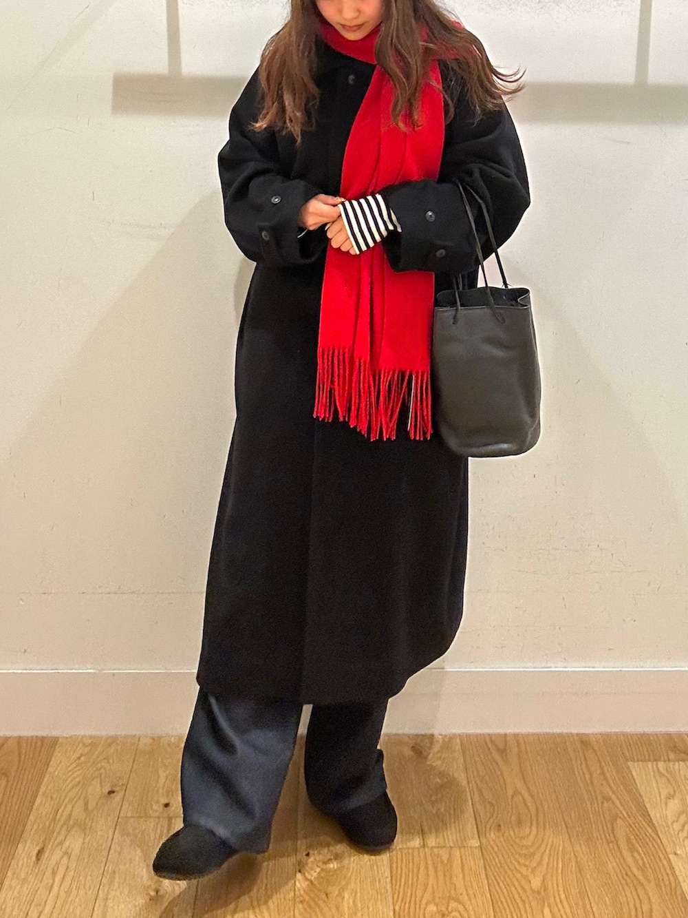 赤のマフラーがアクセントになって華やかなコーデになります^^