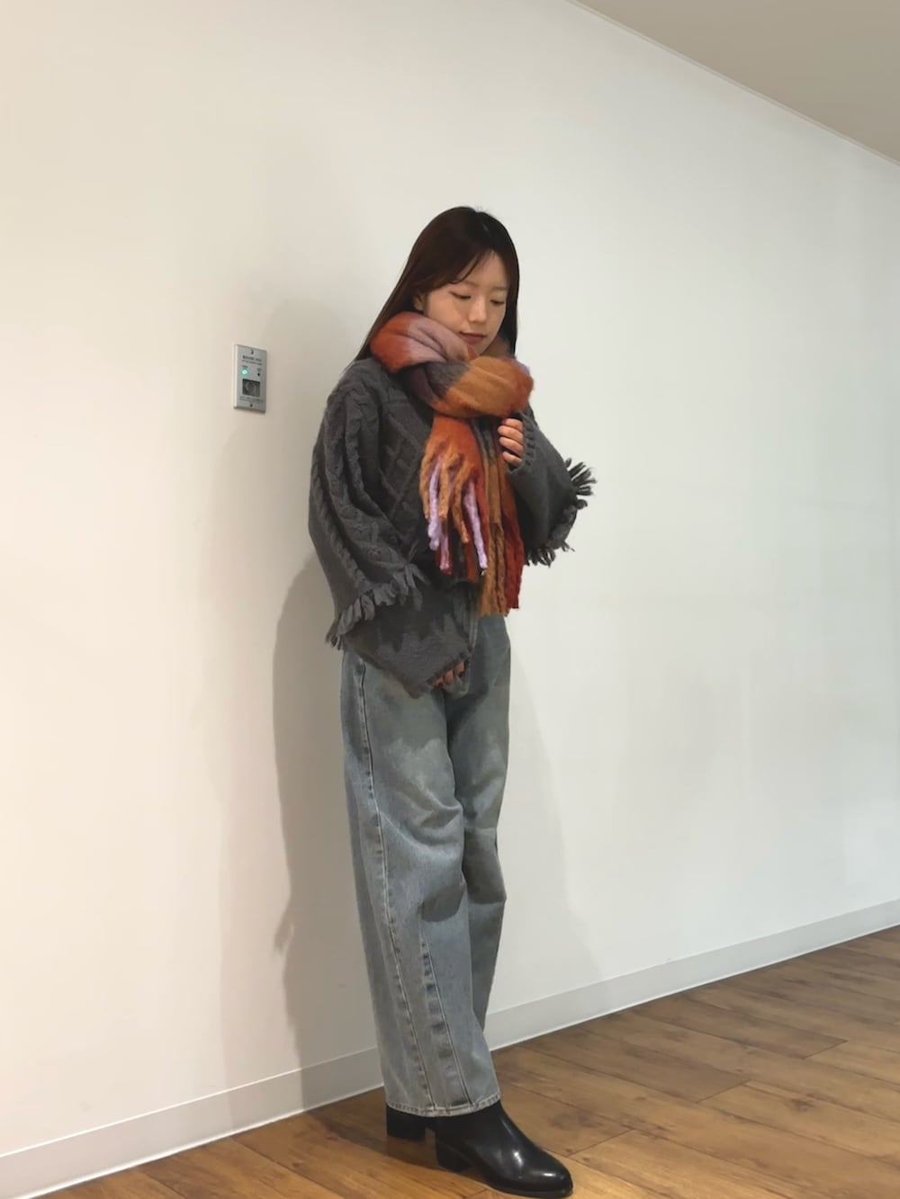暖かいケーブルニットカーディガンとチェックストール合わせは、デザイン性がありながらも防寒対策もばっちりです^^